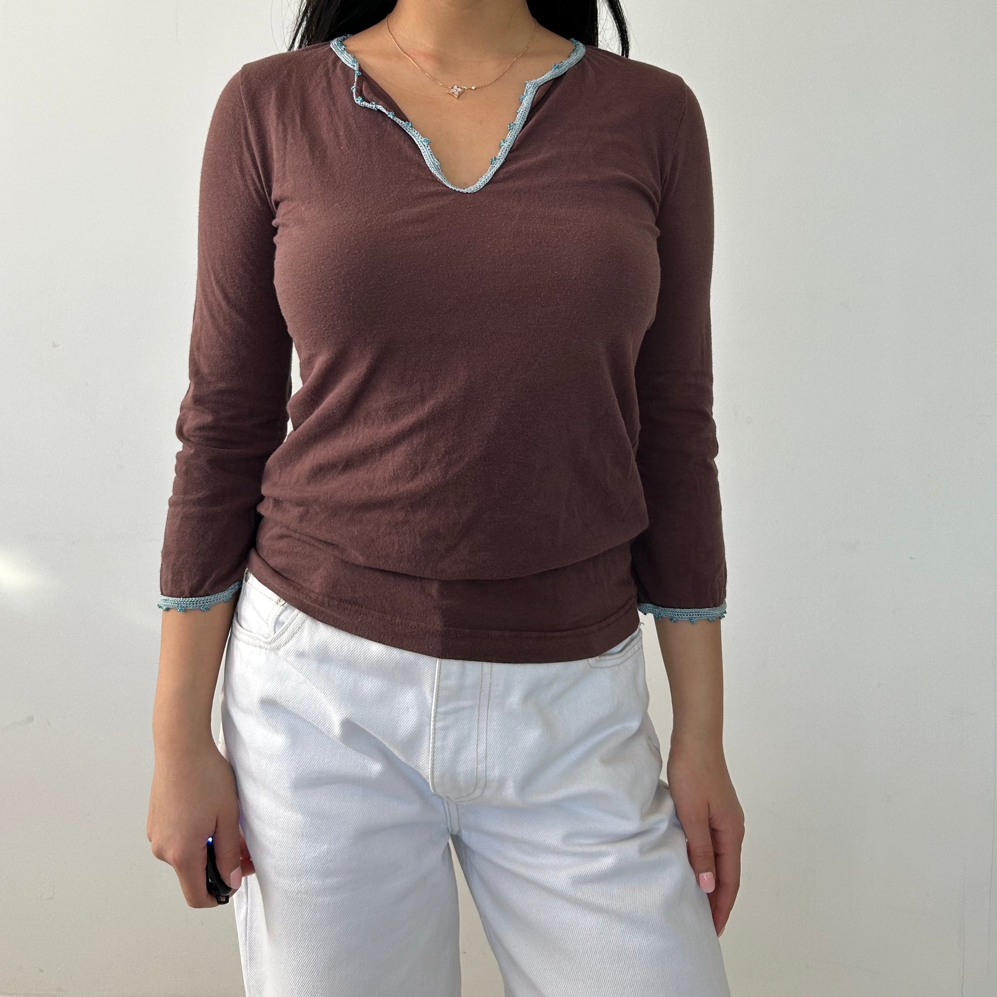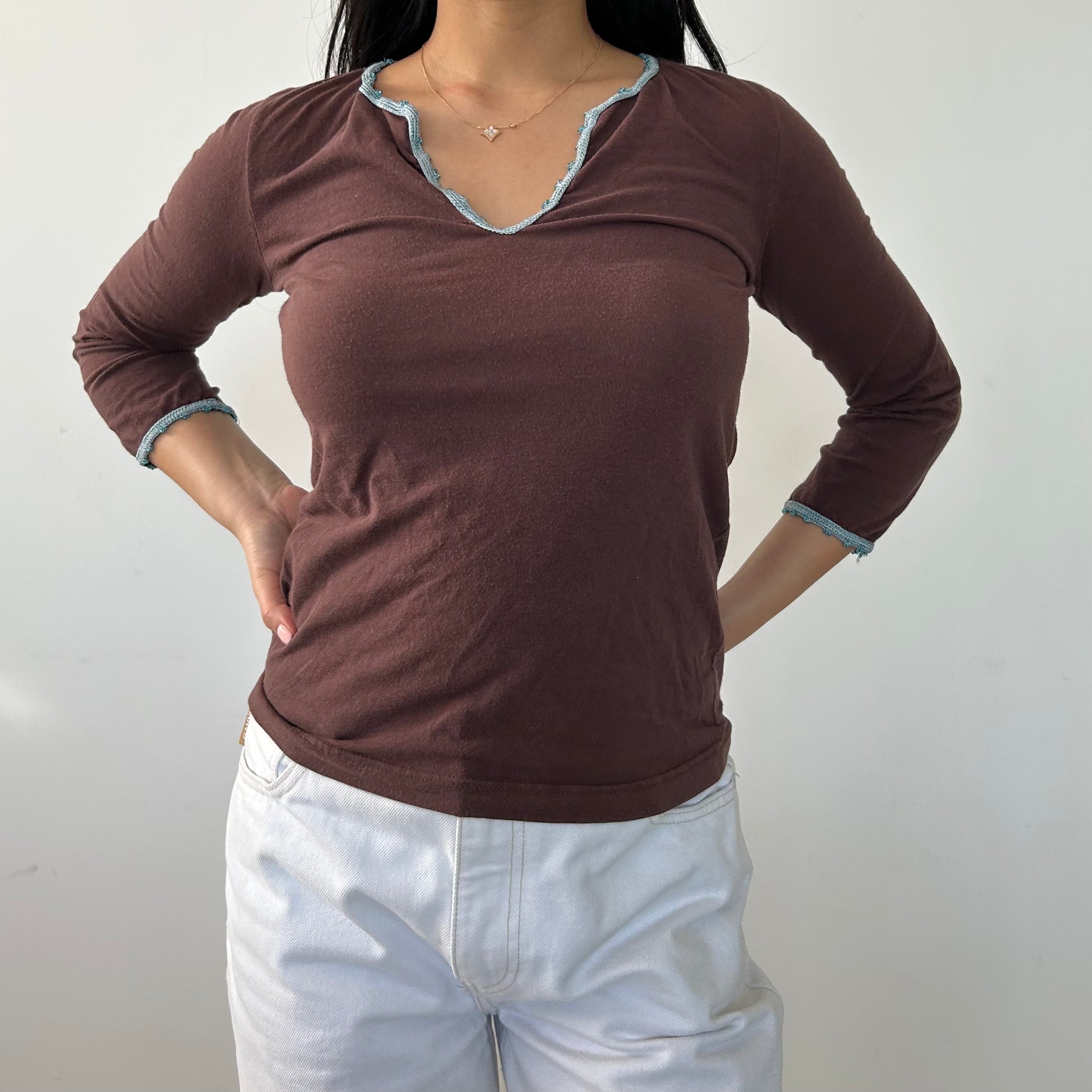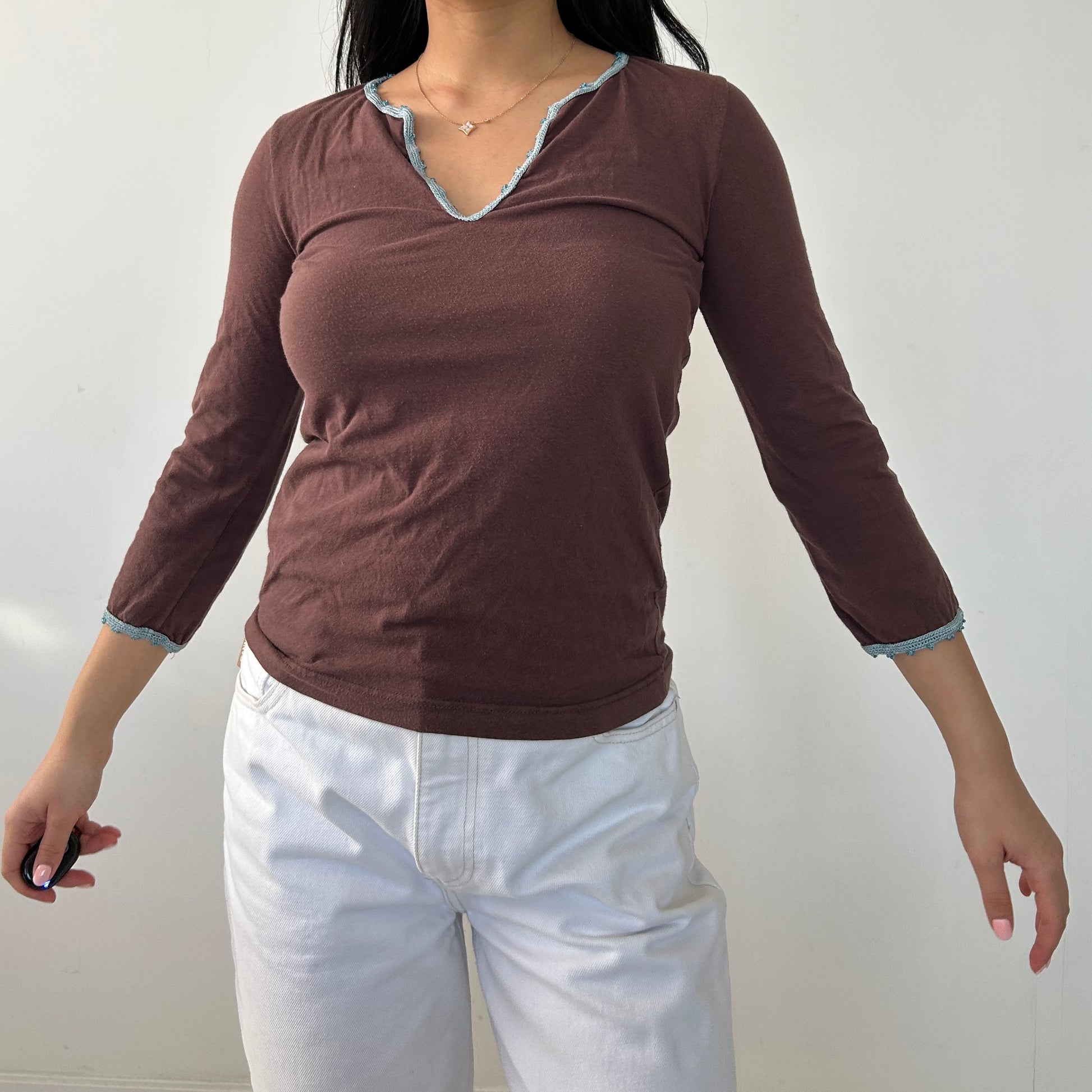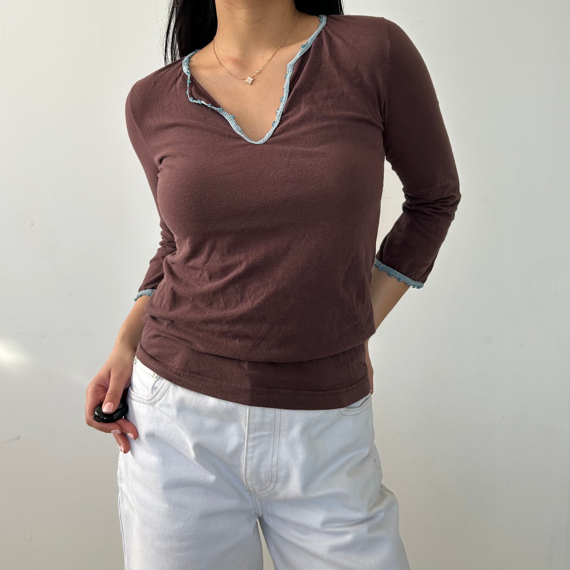- Details: Brown v-neck blouse; blue lace beaded trim; three-quarter sleeves