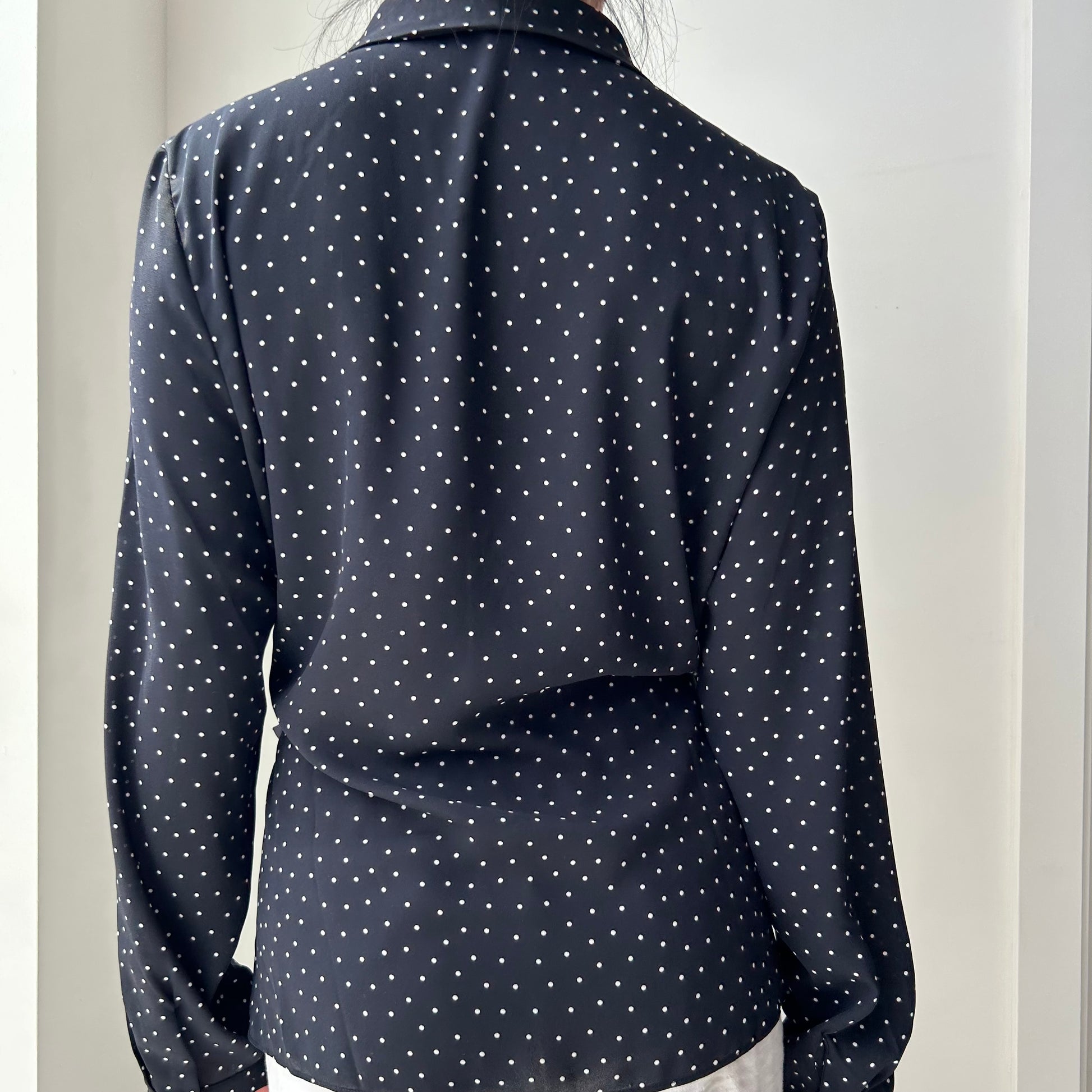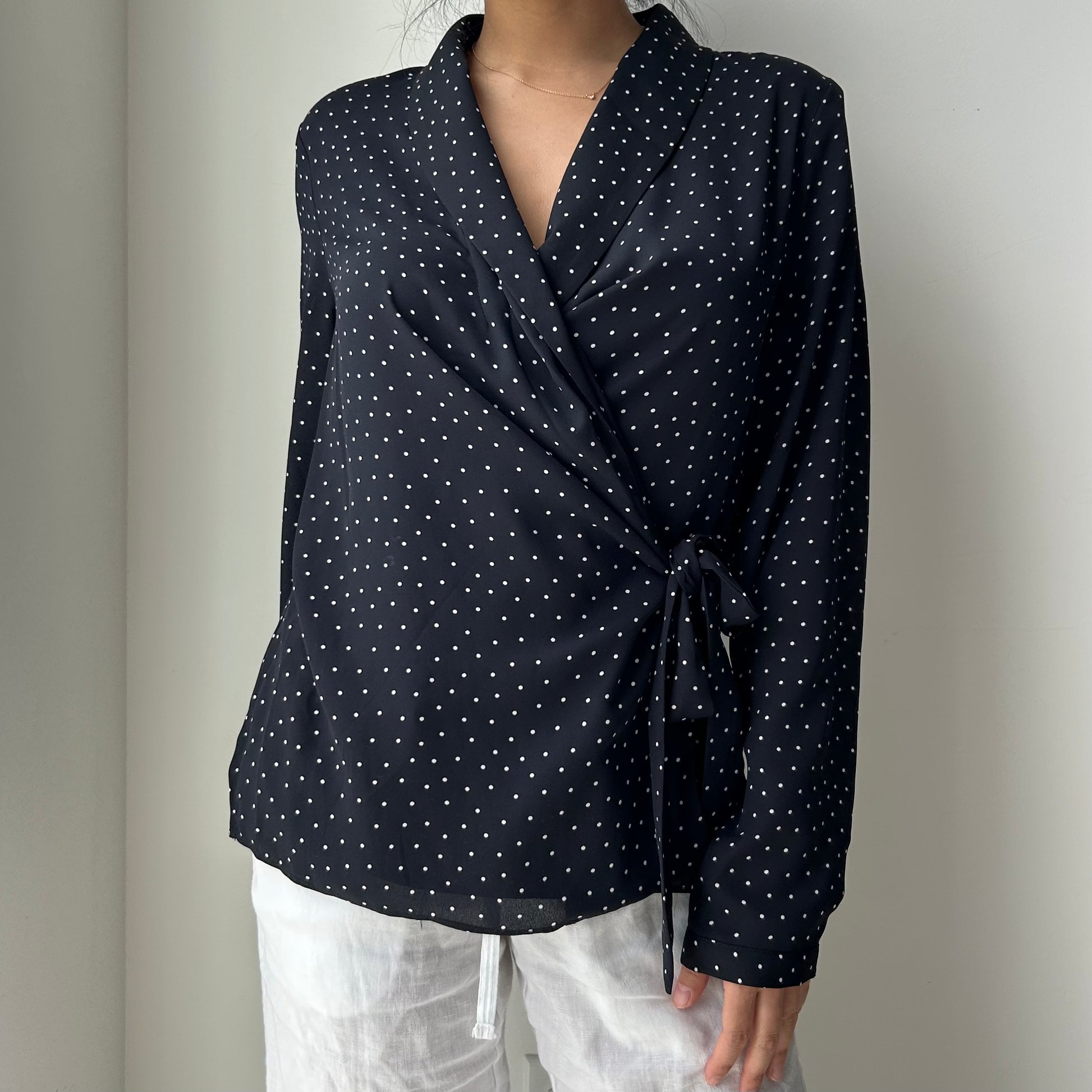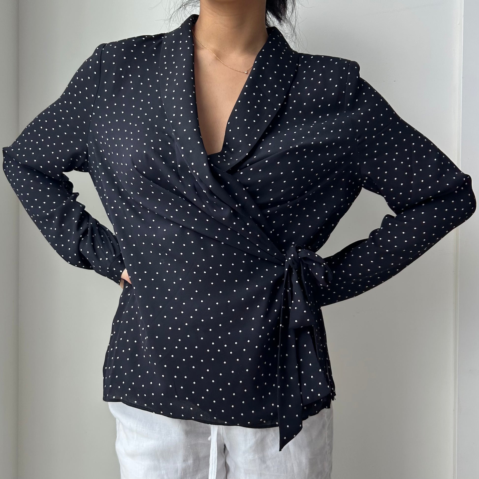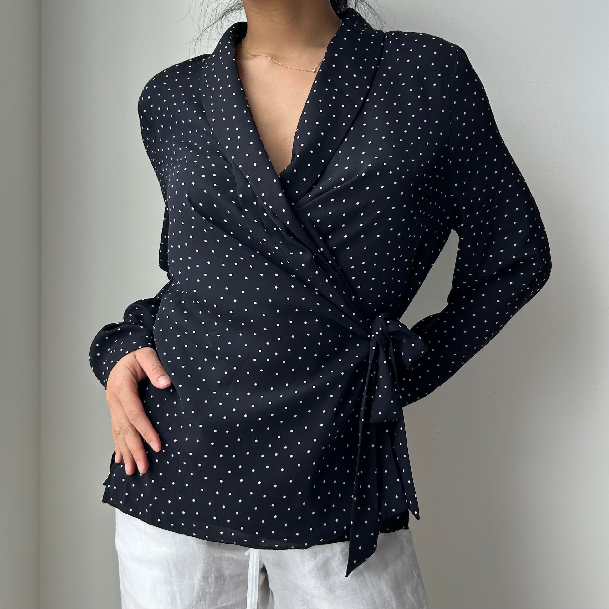 - Details: Navy polka dot long sleeve wrap top; v-neck