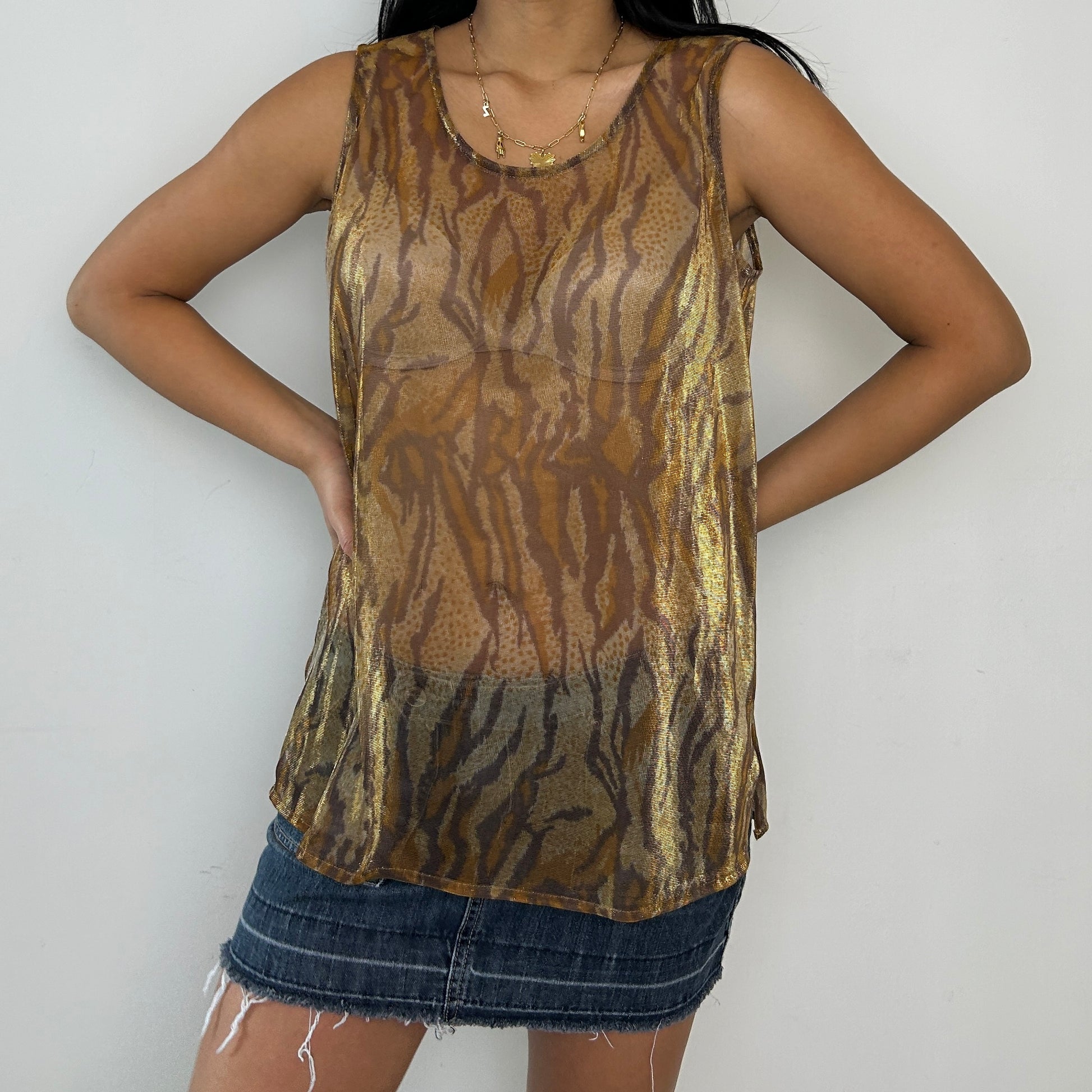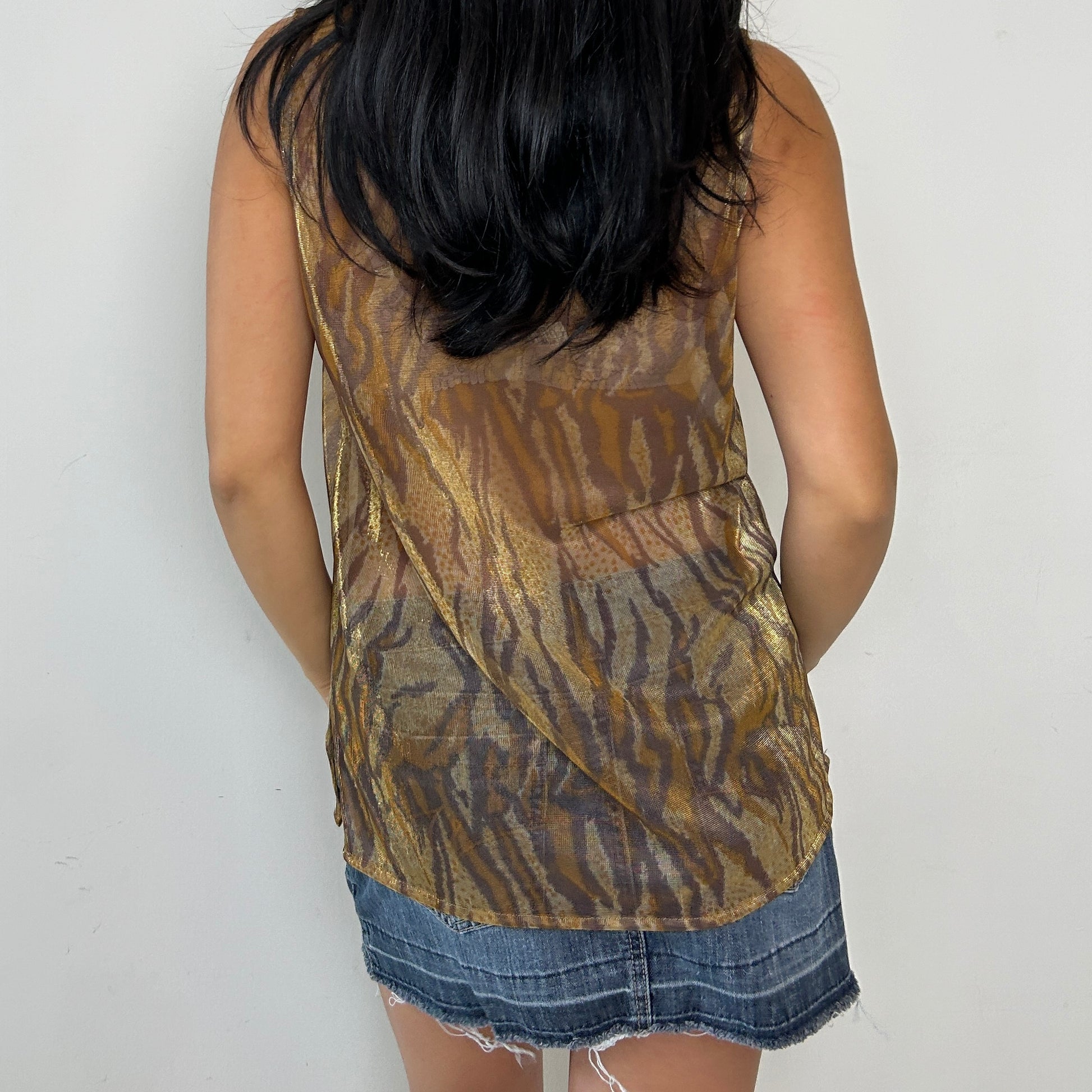 - Details: Vintage from the 1990s; sheer gold and brown tiger print sleeveless tank; mesh