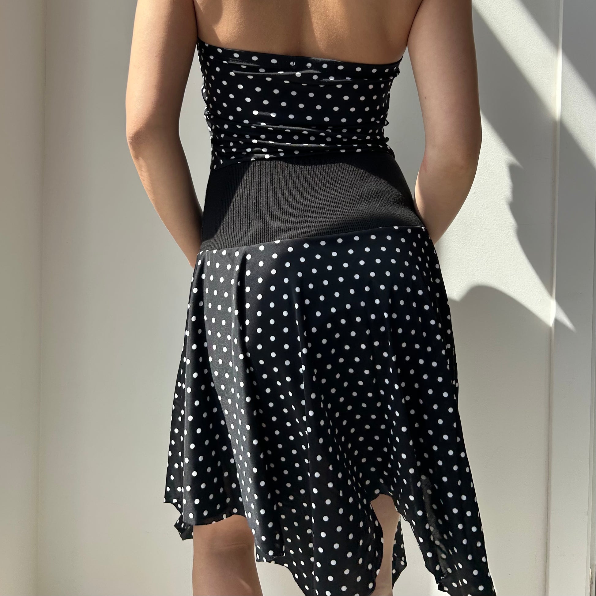 - Details: Black and white polka dot halter dress; drop waist; thick ribbed waistband; handkerchief hem; vintage from the 1990s