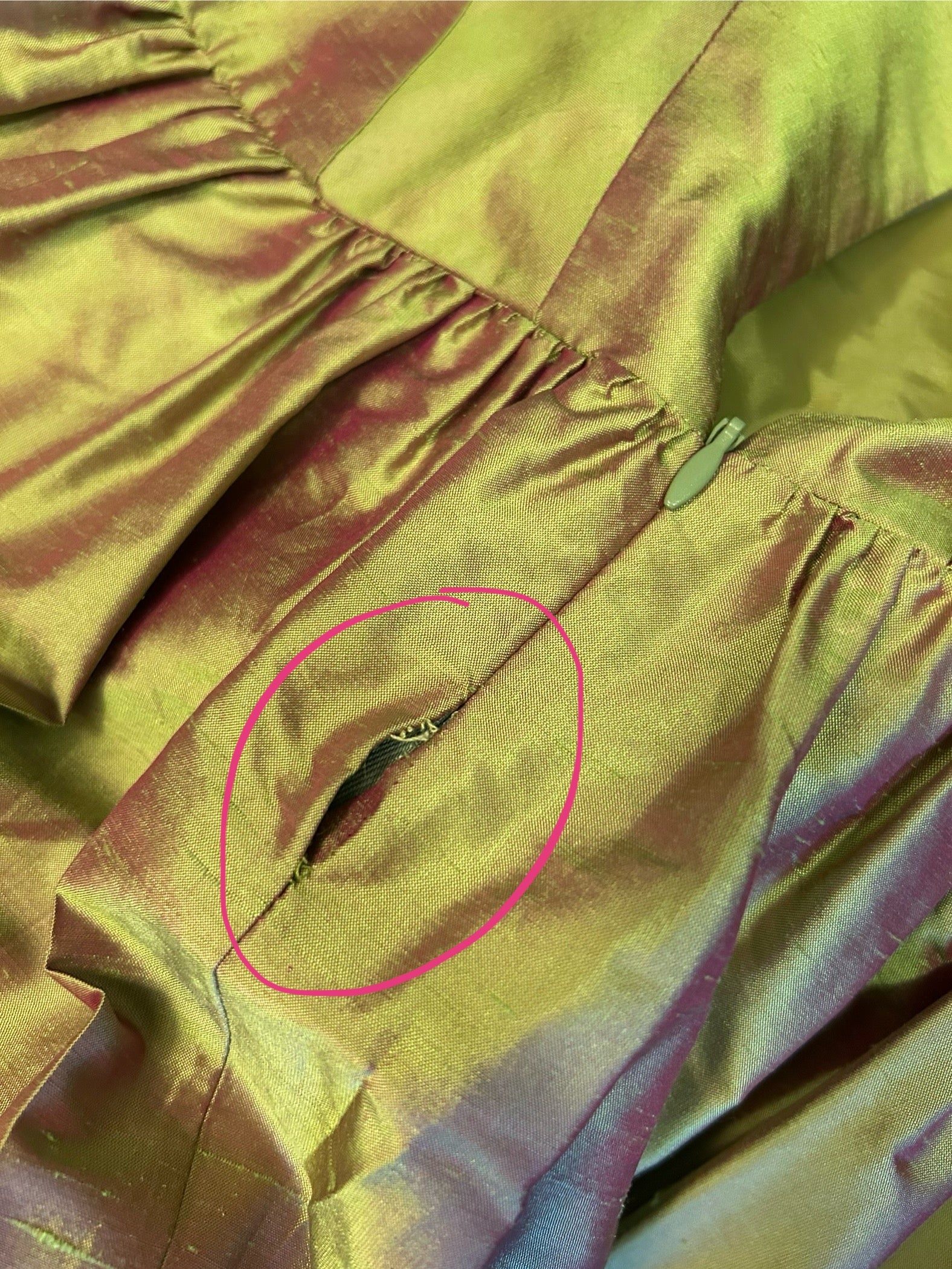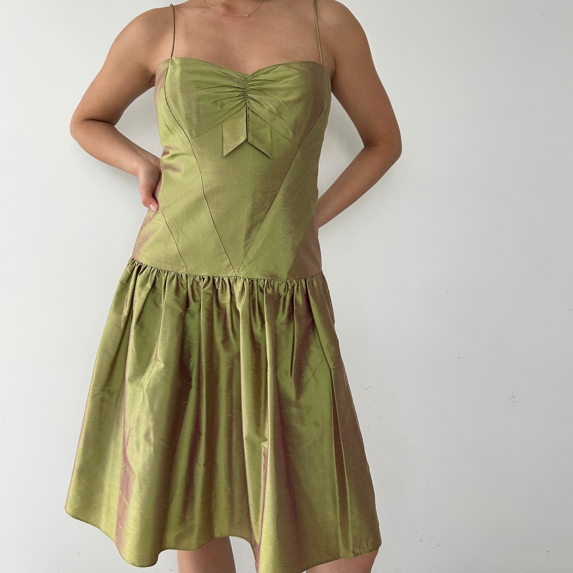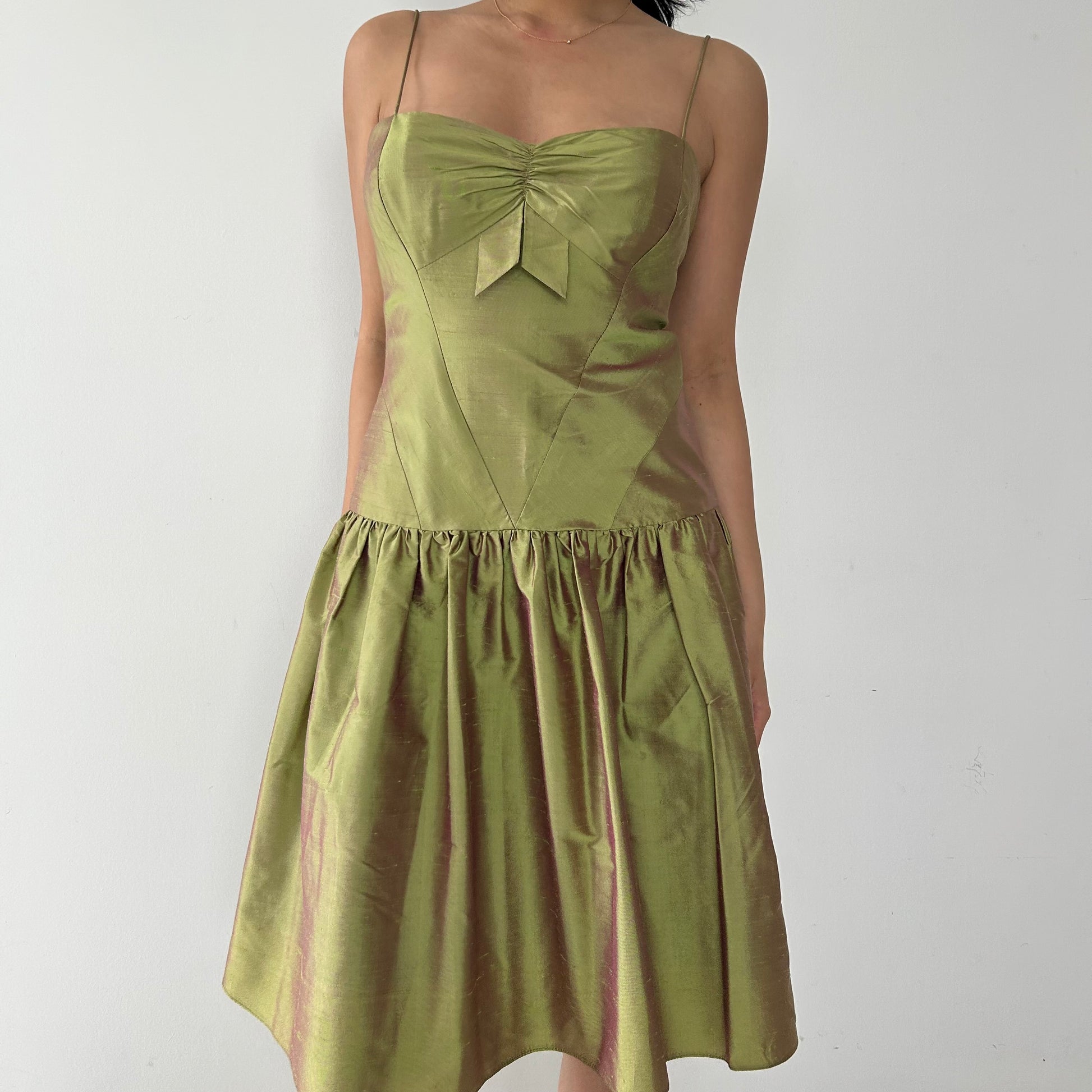 - Details: Vintage from the 1990s; irridescent green drop waist dress; bow detail at bust; concealed back zip; double lined