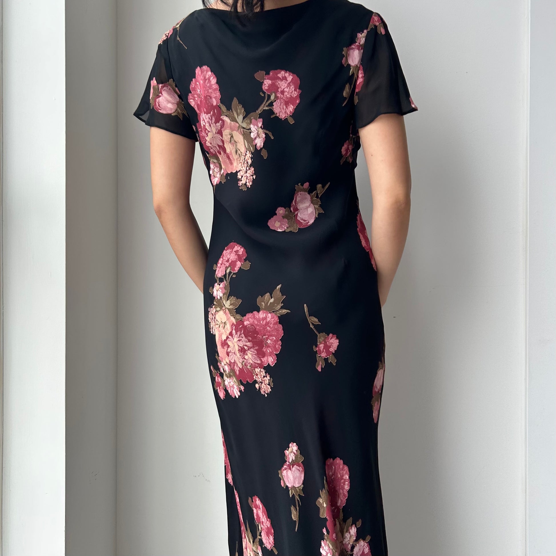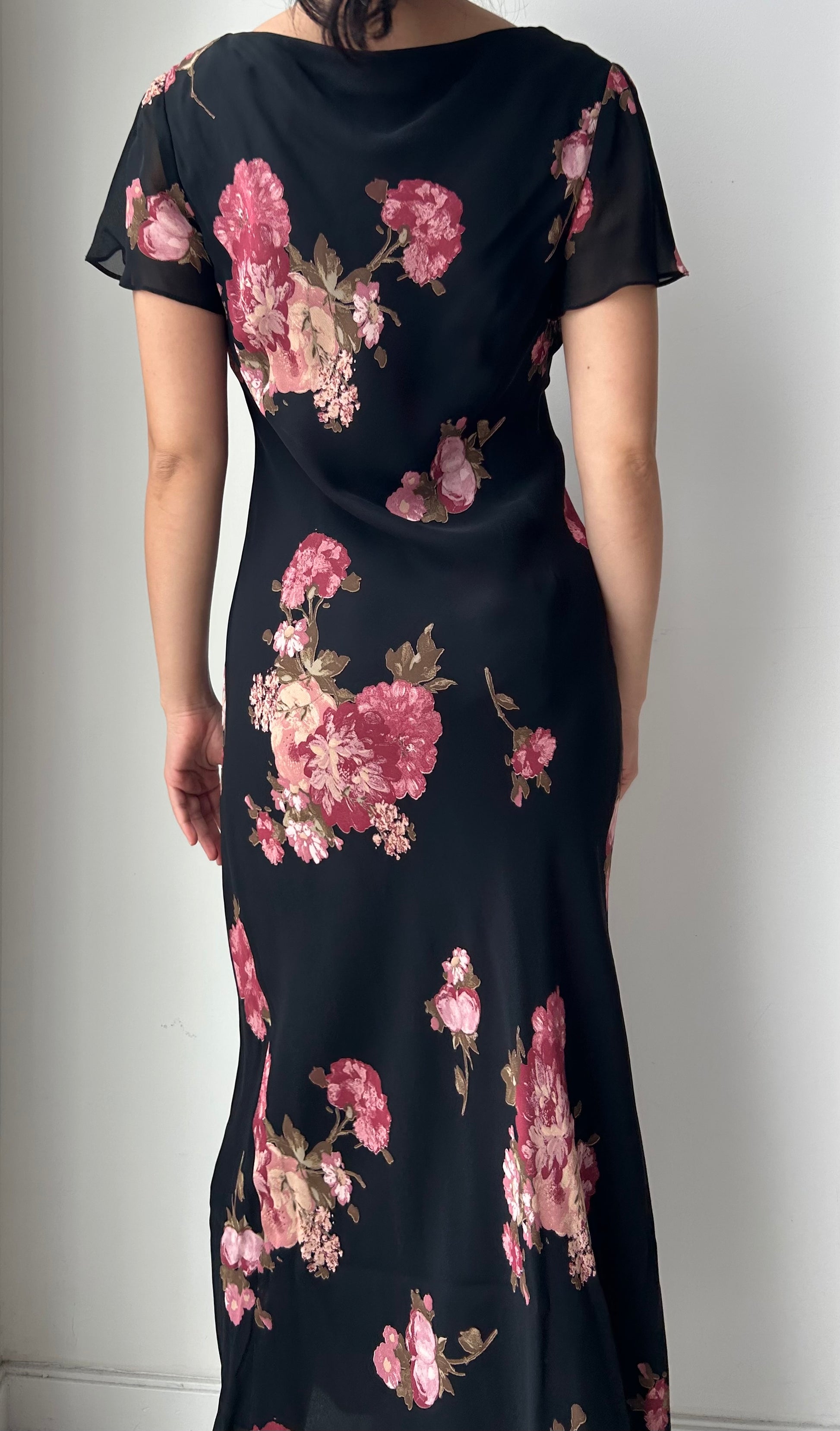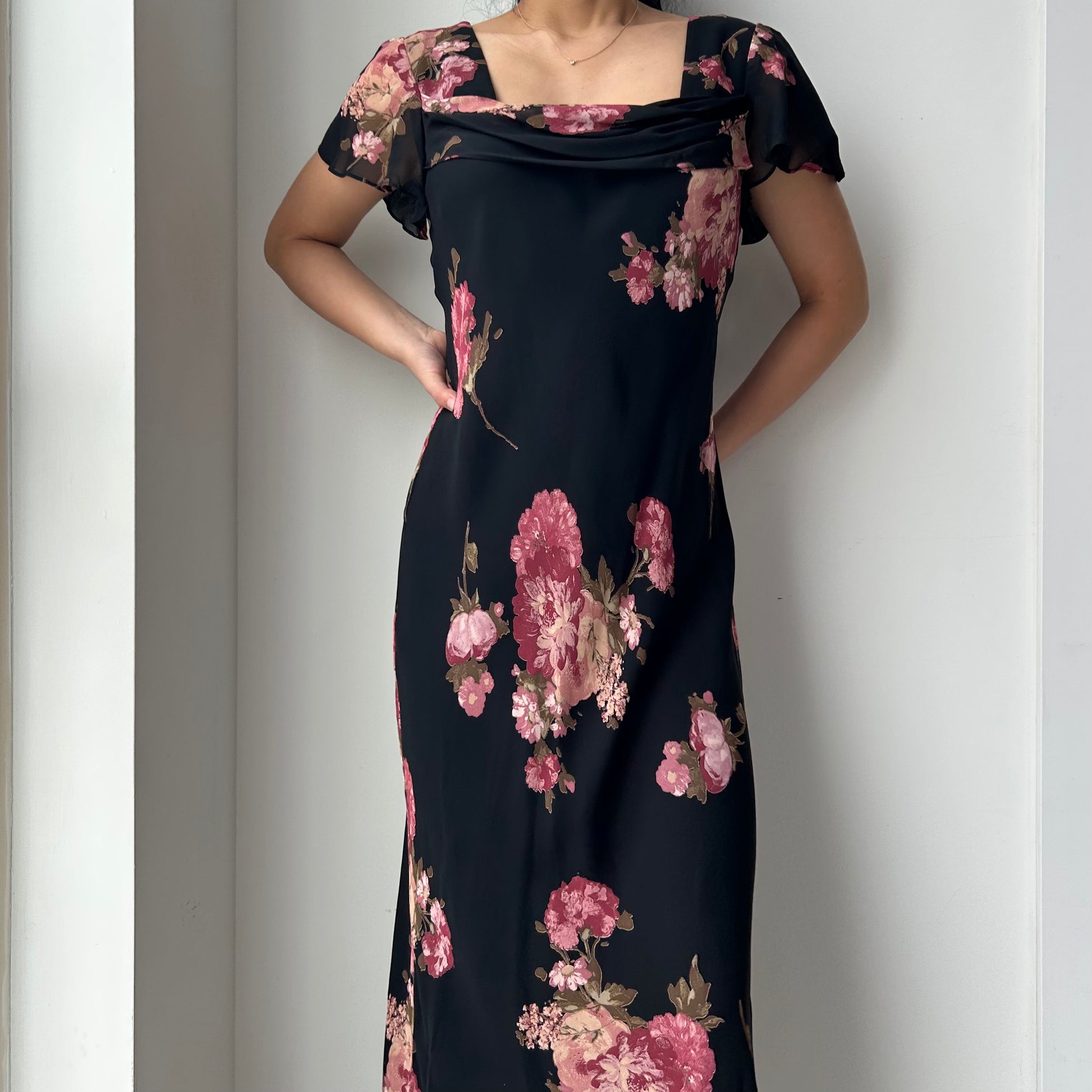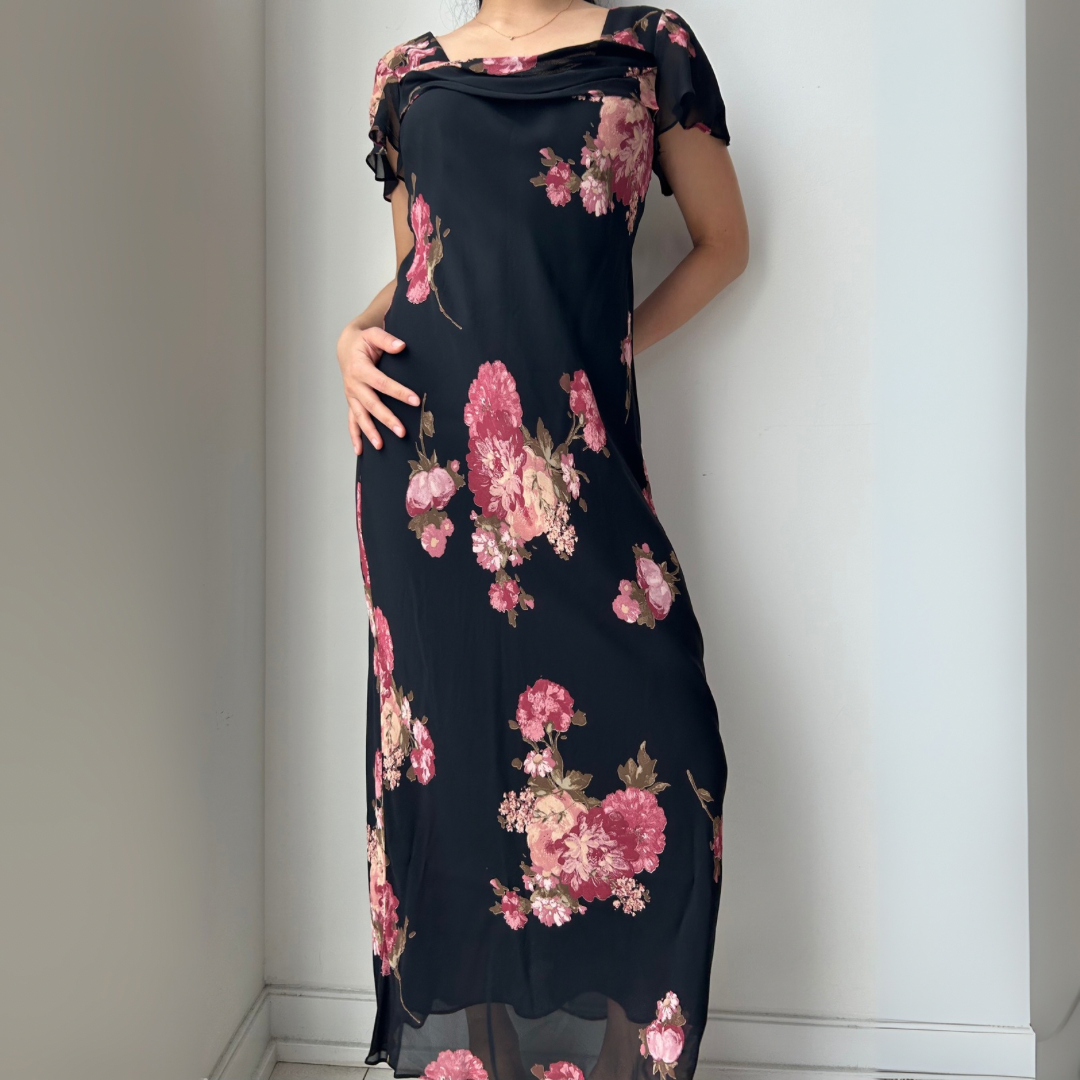 - Details: Black short sleeve midi dress with lightweight, sheer chiffon overlay; soft pink floral print throughout; draped cowl neckline with flutter sleeves; flowy maxi length silhouette; double lined; vintage from the 90s