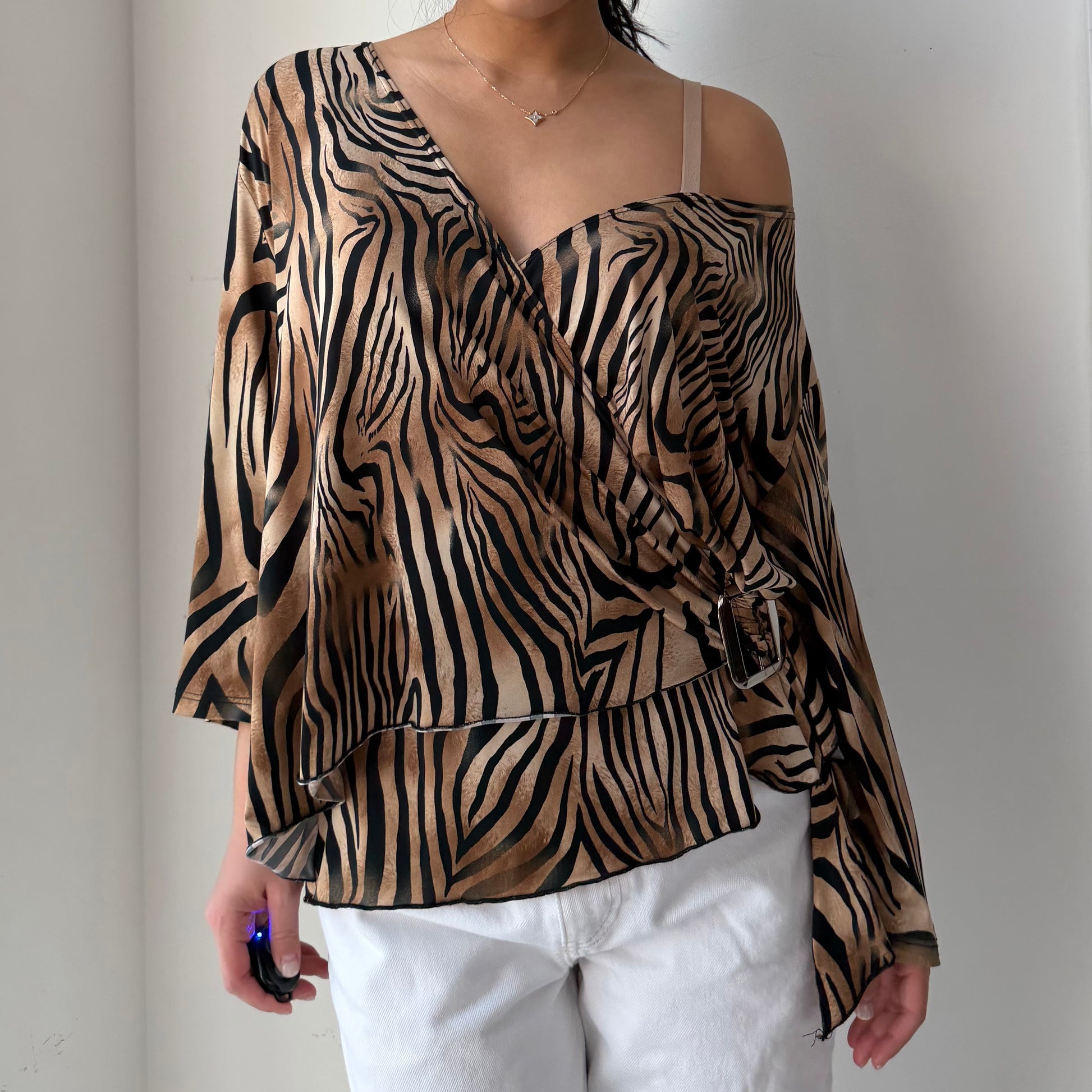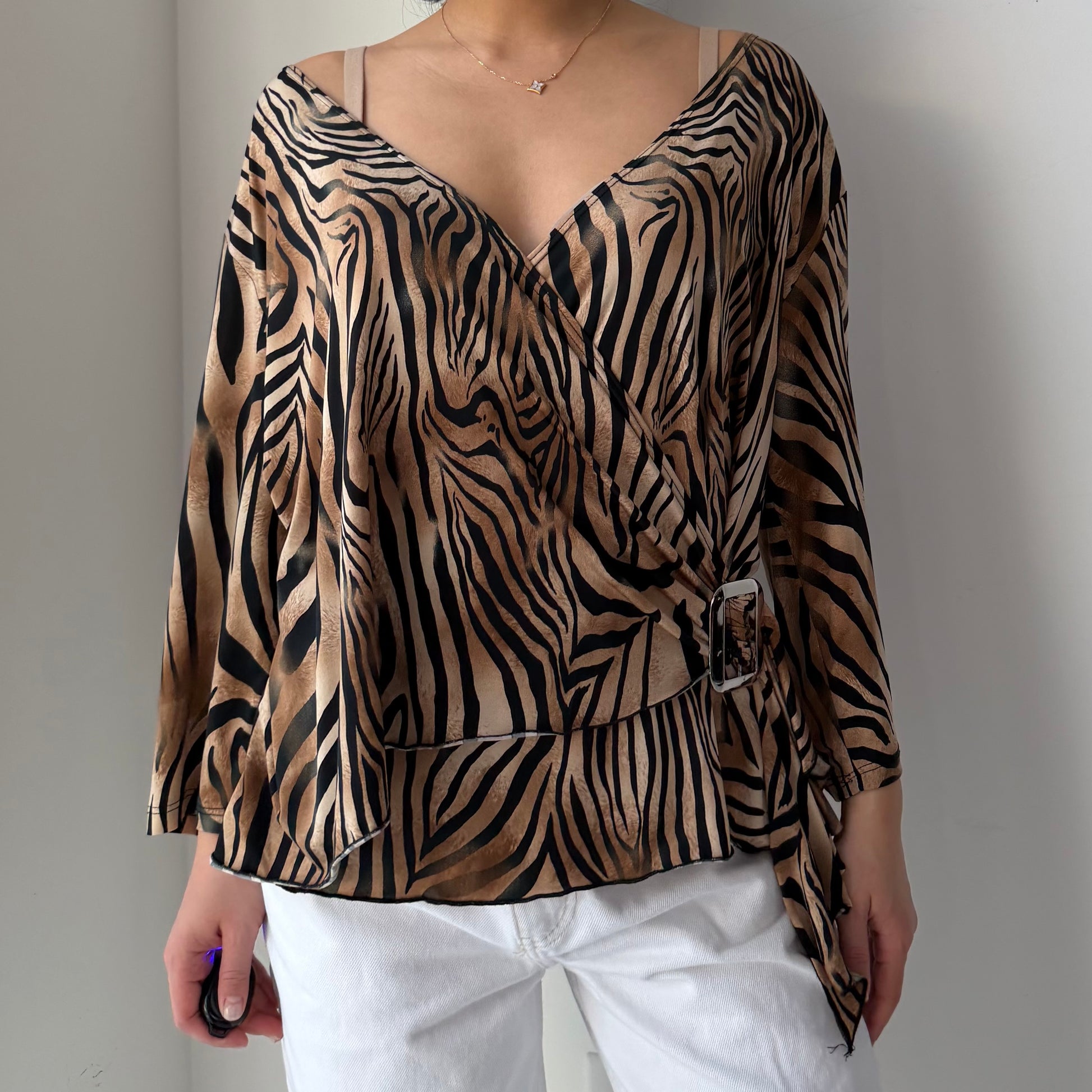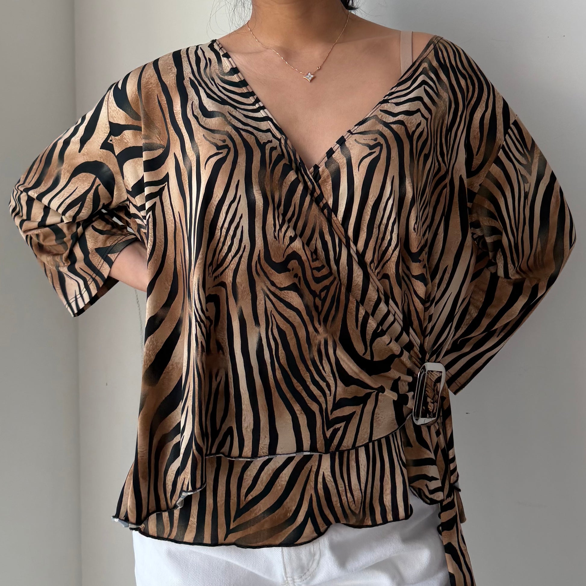 - Details: Slinky long sleeve v-neck blouse; satin finish with tiger stripes in rich brown-black tones; surplice wrap style with belted waist and square buckle detail