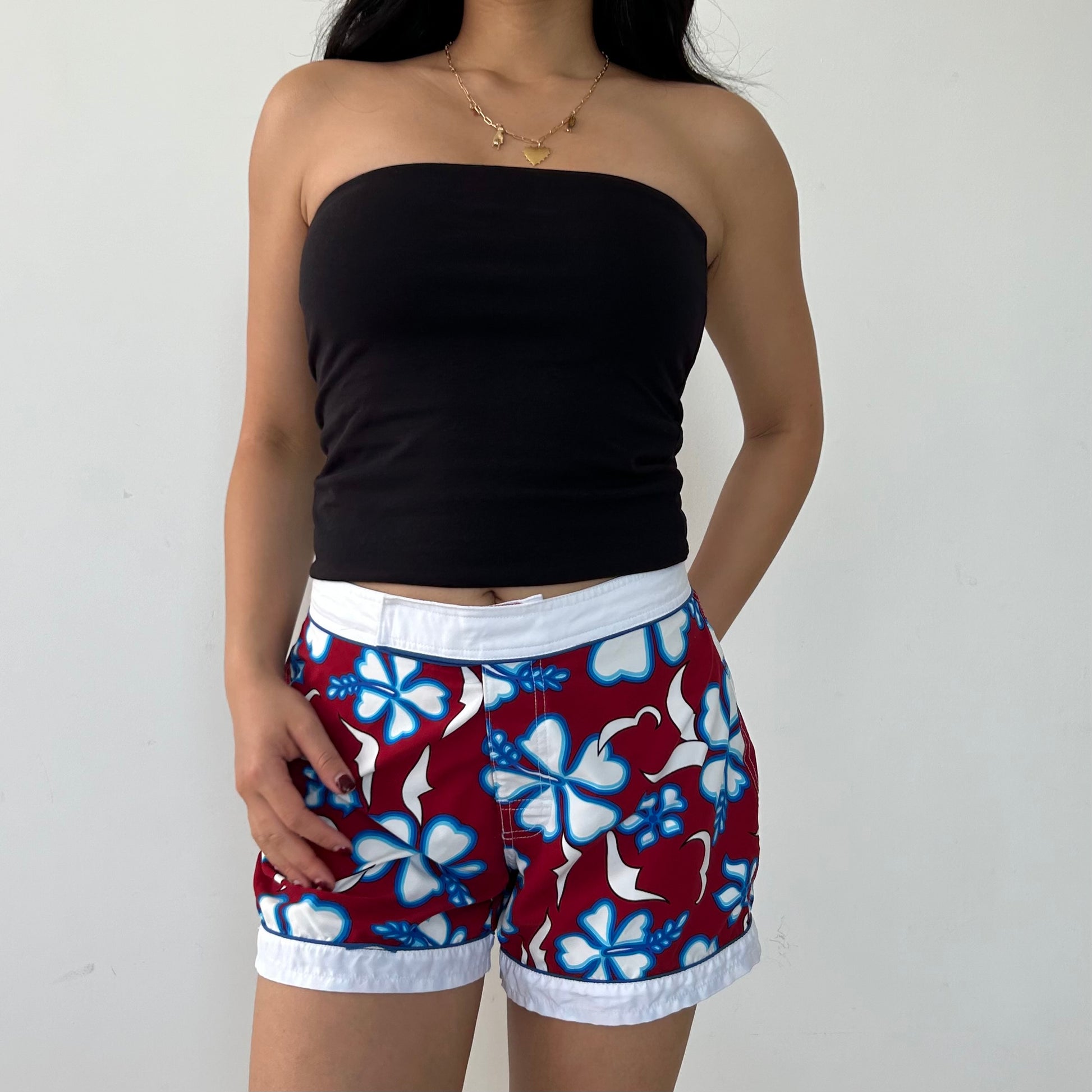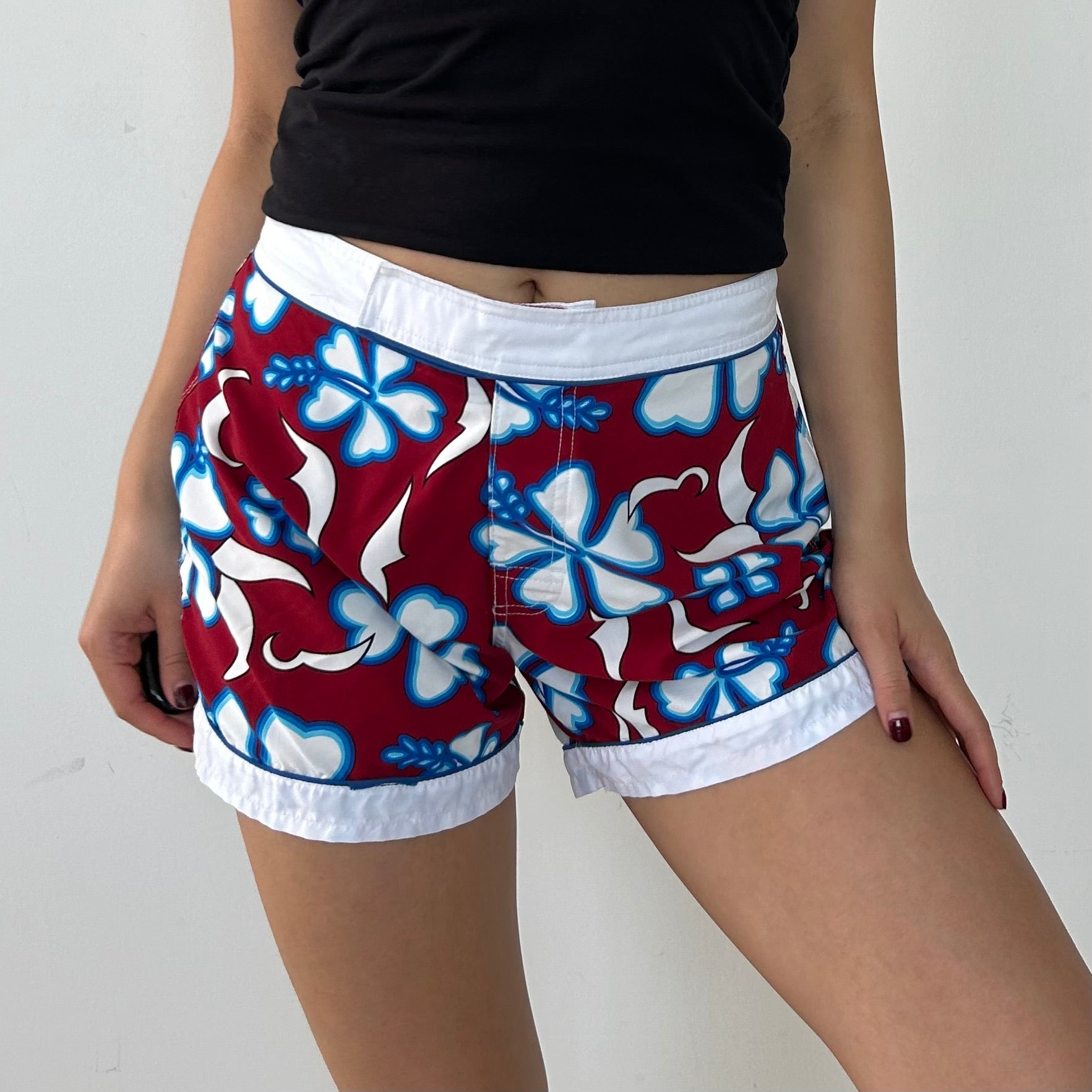Details: Burgundy, blue and white hibiscus print swim shorts; velcro enclosure; single back pocket
