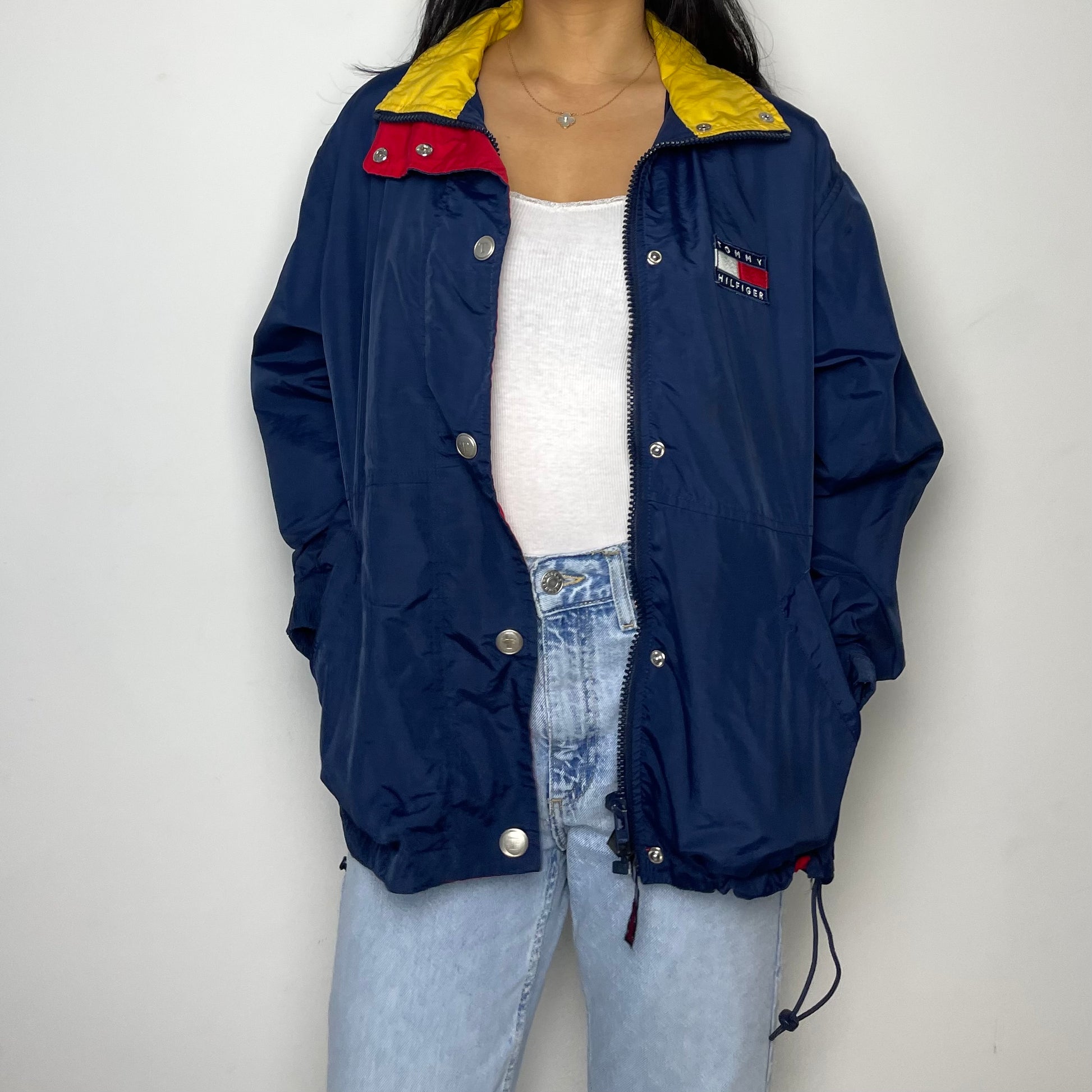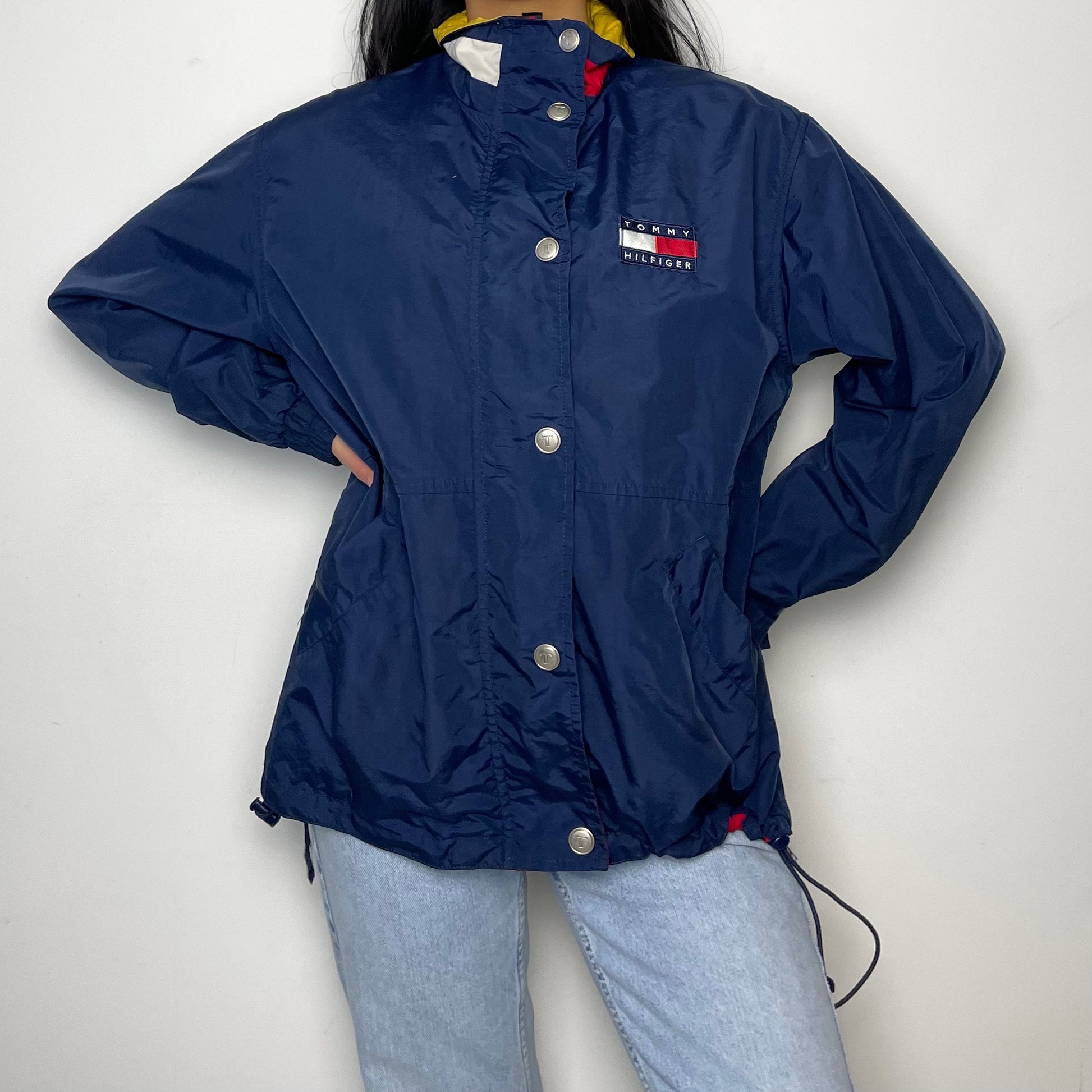 - Details: Navy zip up jacket with yellow and red trim; Tommy Hilfiger flag on the left chest; big spellout logo on the back; adjustable drawstring and toggle hem