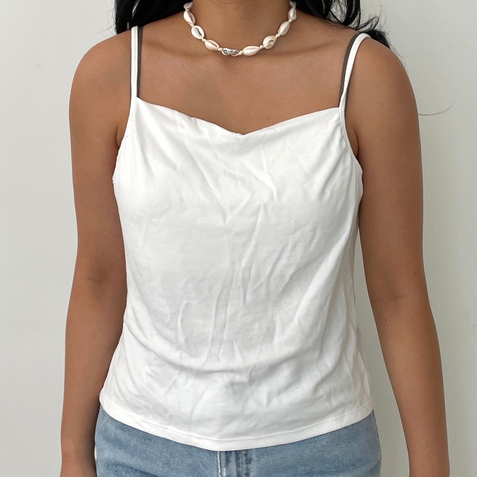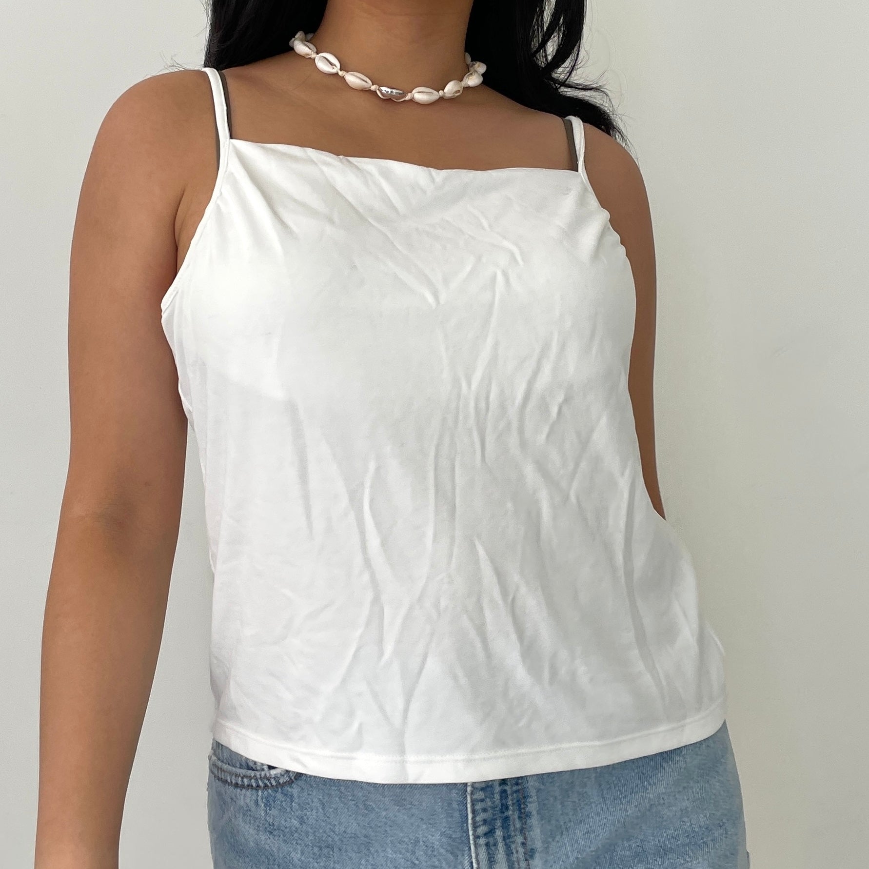- Details: White square neck cami top (almost cowl neck depending on how you wear it); straps have been altered shorter; bust is double lined