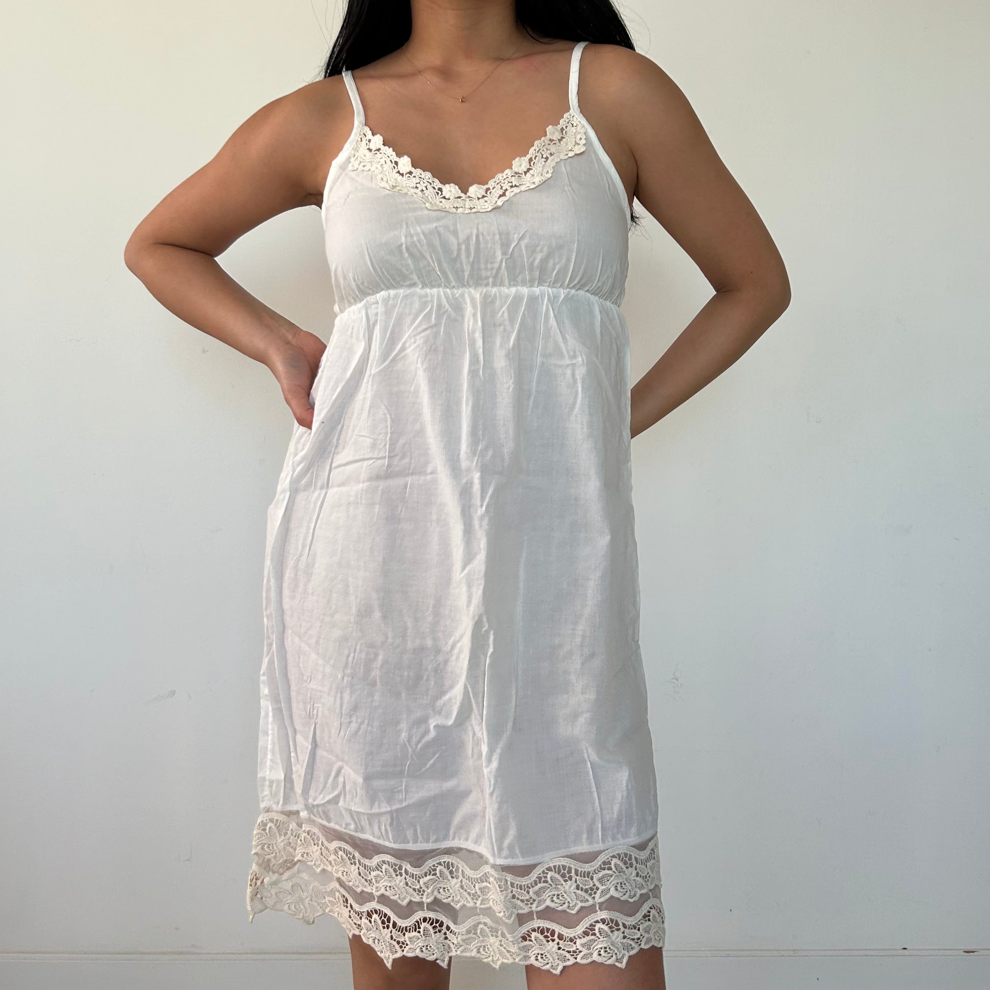 - Details: White poplin mini dress; lace trim hem and bodice; spaghetti straps; elasticated waistband