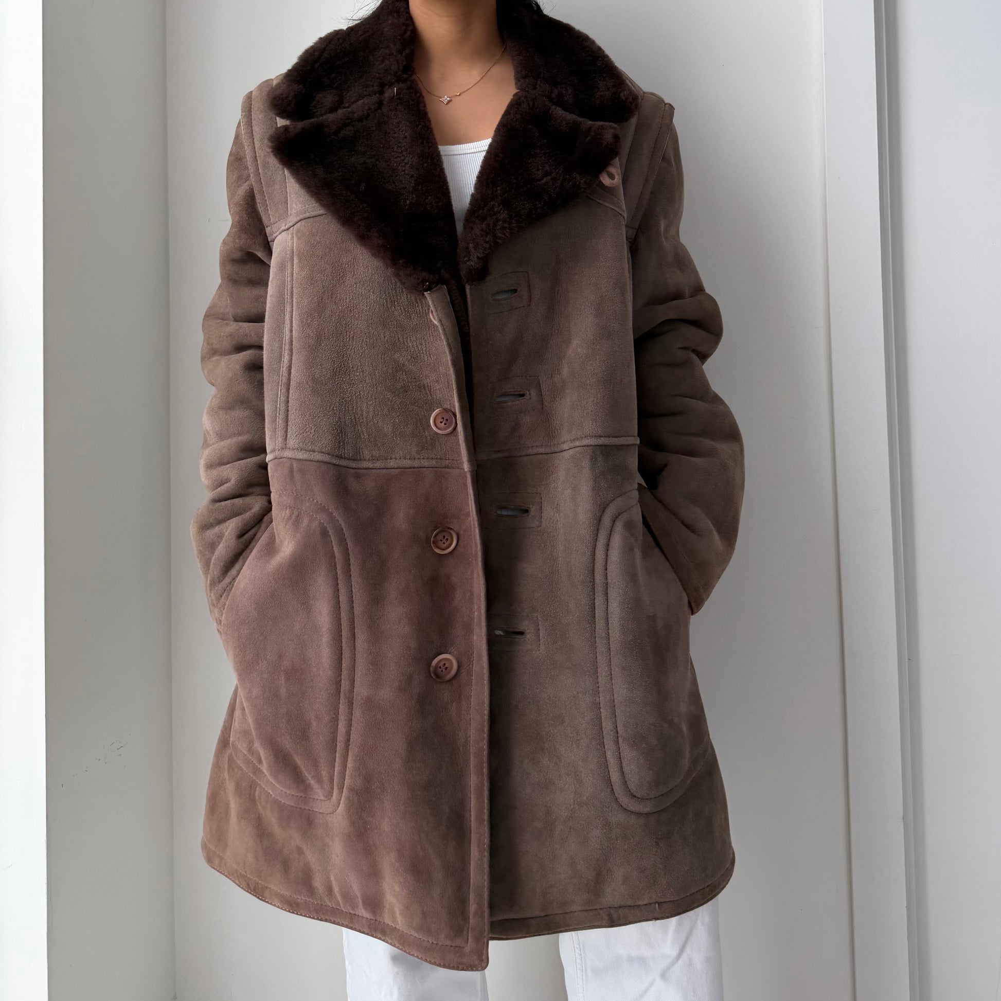 - Details: Premium 100% sheepskin suede in rich chocolate brown with plush shearling fur shawl collar; single-breasted four-button front; curved patch pockets