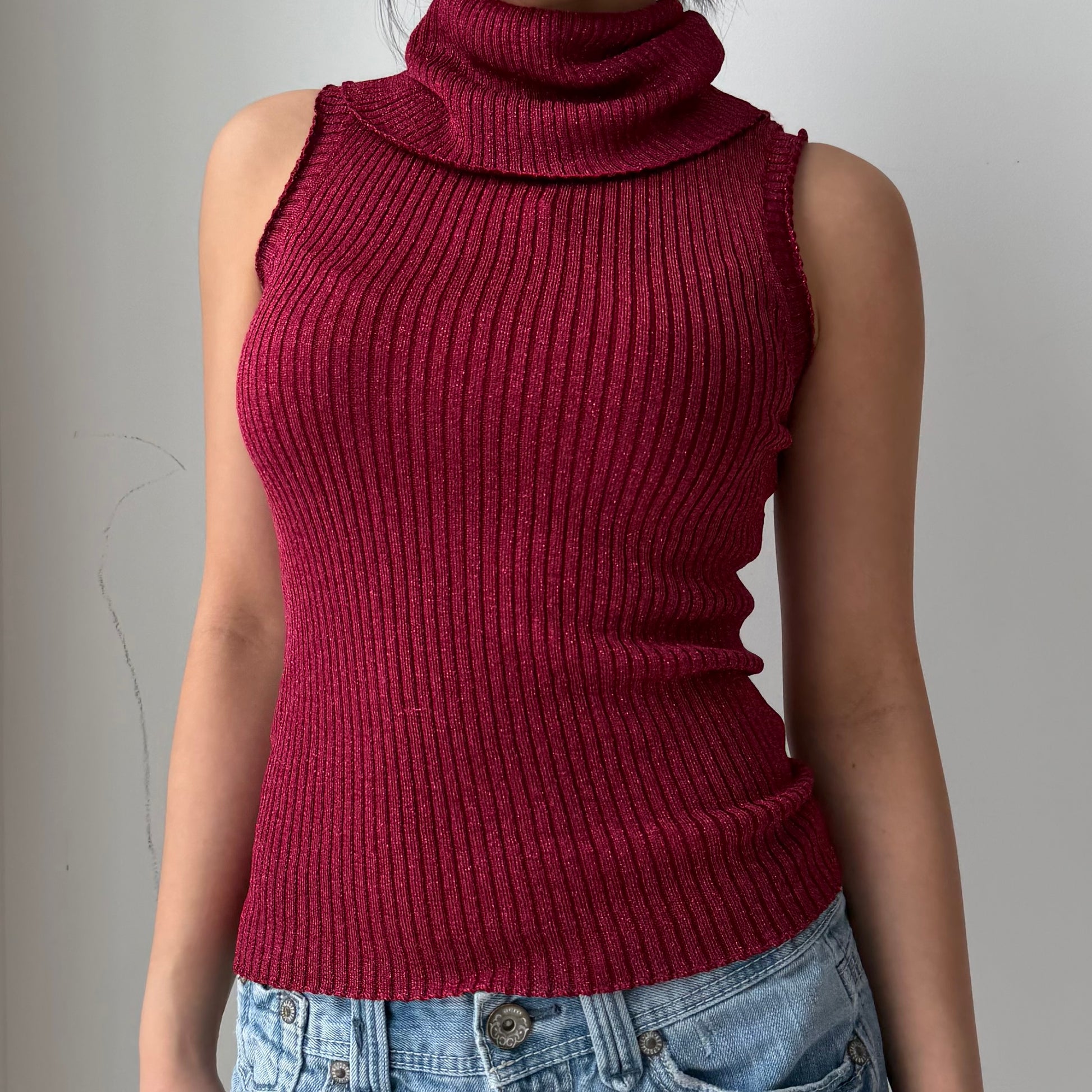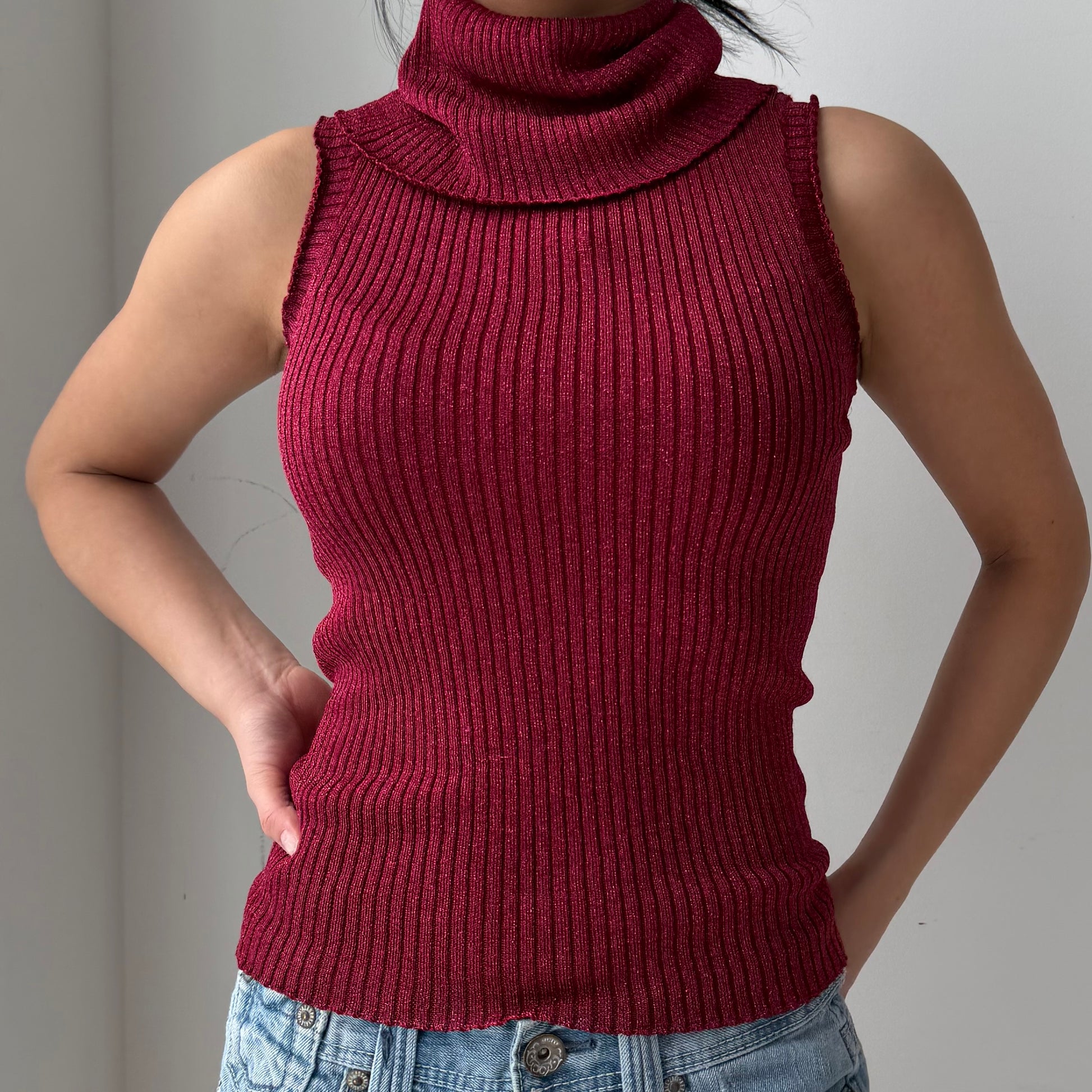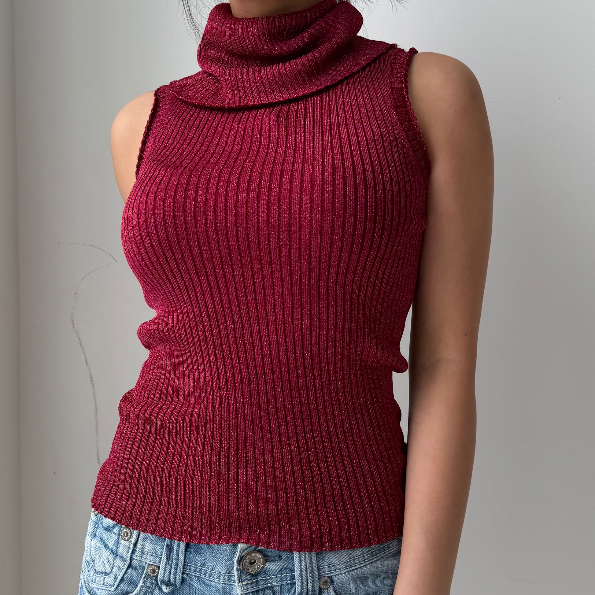 - Details: Metallic stretch rib knit tank in deep burgundy; high turtleneck collar and sleeveless cut; fitted silhouette.