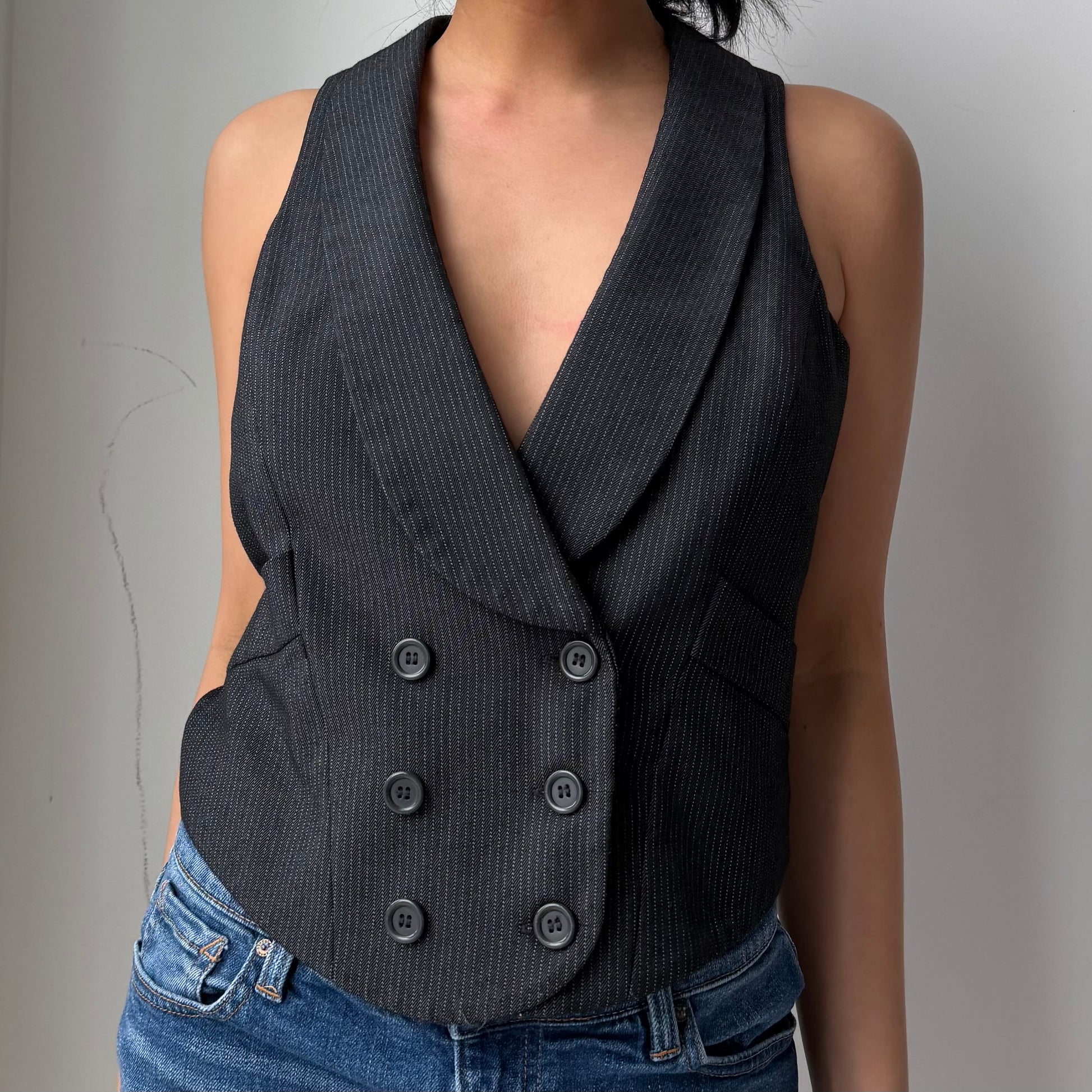 - Details: Grey pinstripe vest with deep v-lapel and double-breasted button front