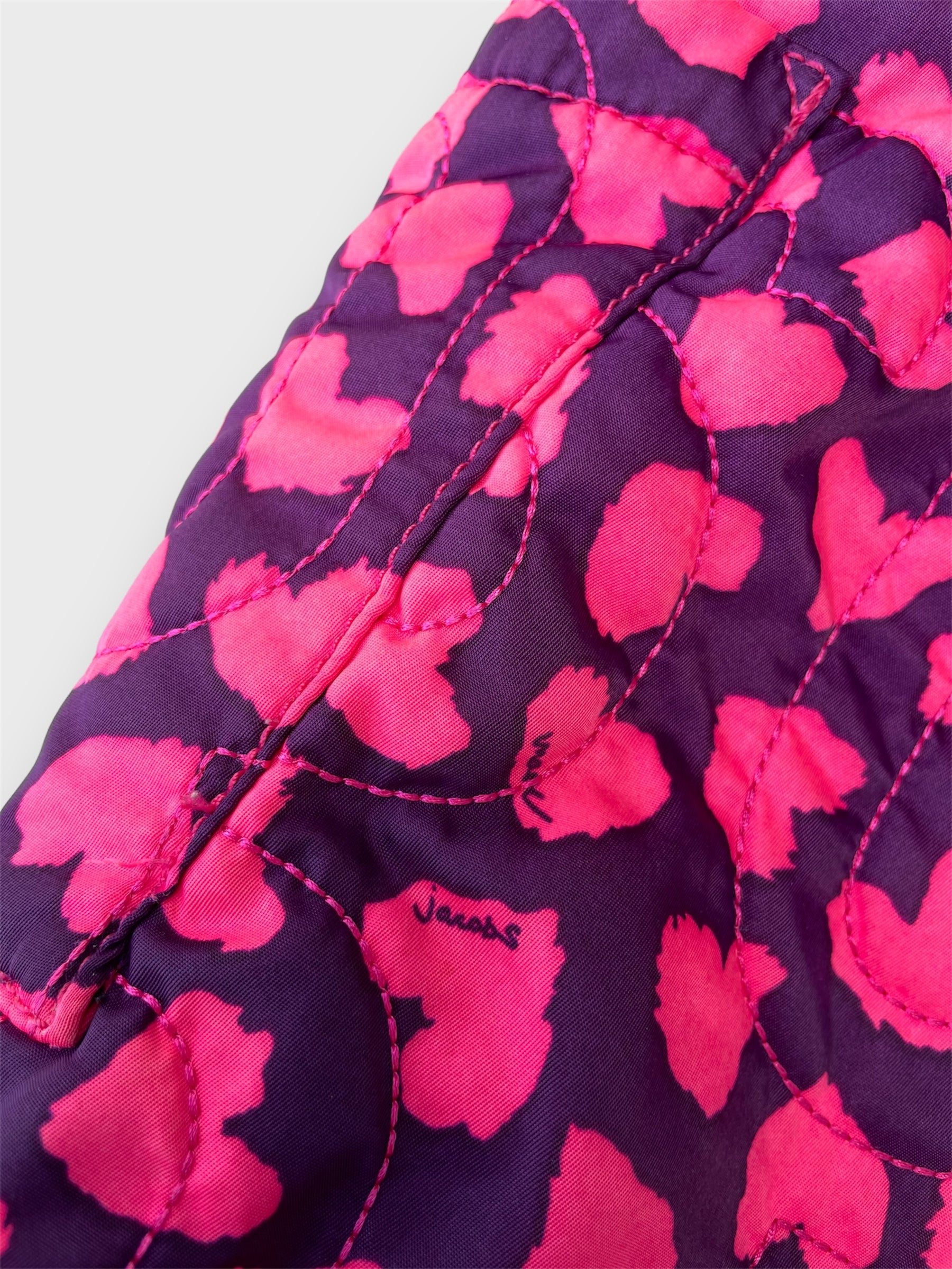Pink and purple nylon tote bag; heart shaped motifs; silver-tone front plaque; flat handles and dual shoulder straps; dual exterior side pockets; logo jacquard lining and single interior zipper pocket; snap closure at top