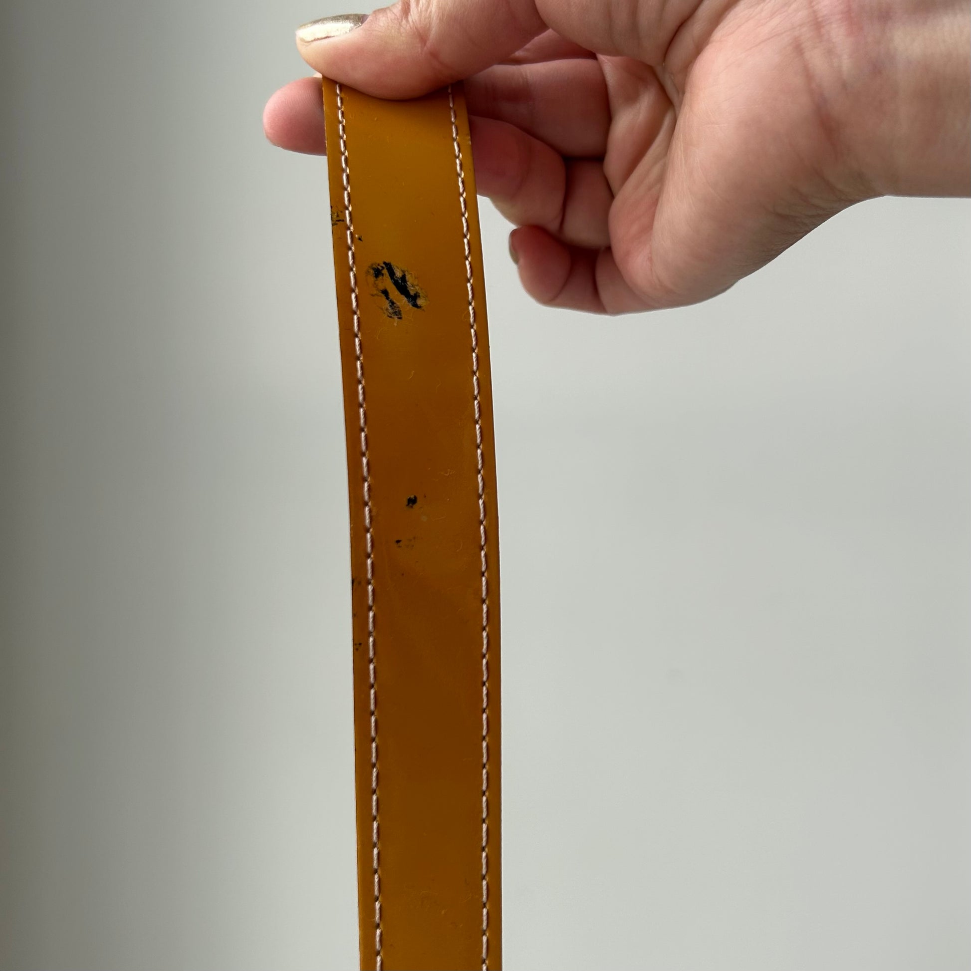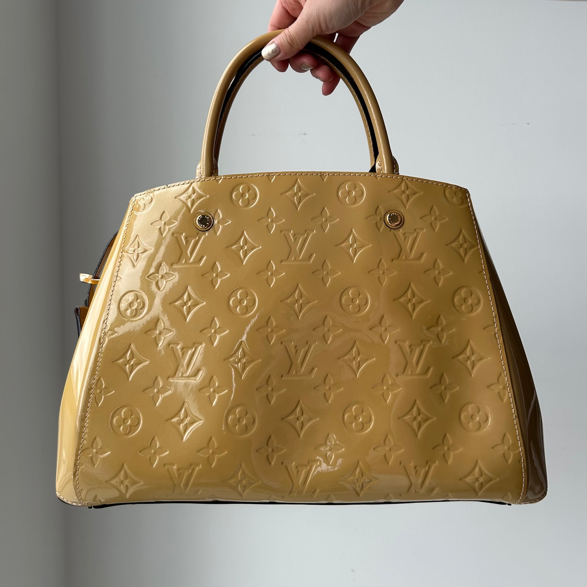- Details: Yellow top handle bag from the 2014 collection; neutrals vernis patent leather; monogram Vernis; gold-tone hardware; rolled handles and single shoulder strap; canvas lining and dual interior pockets; clasp closure at top; protective feet at base; includes keys, and clochette