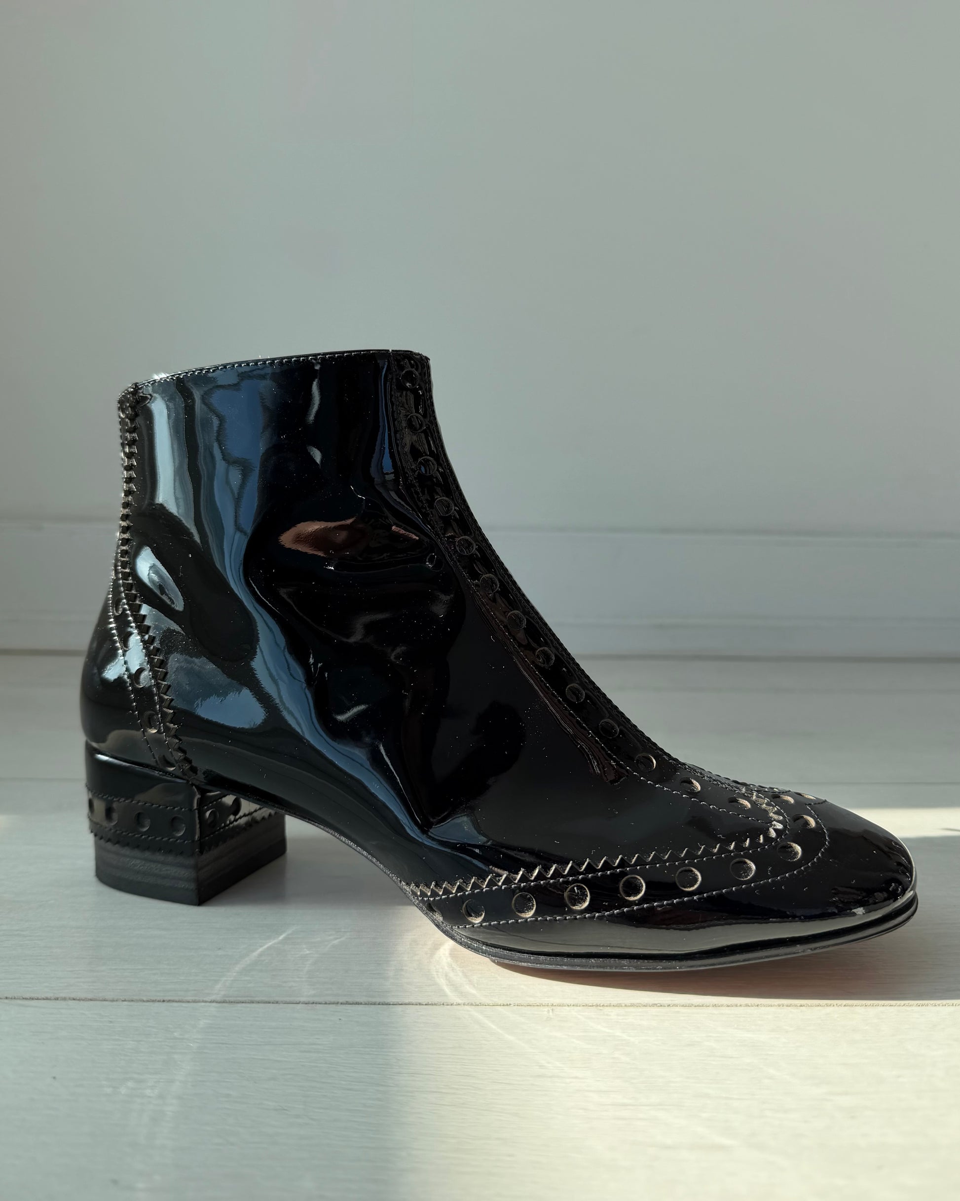 - Details: Black patent leather ankle boots; brogue trim; side zip closure; square toe; stacked heel