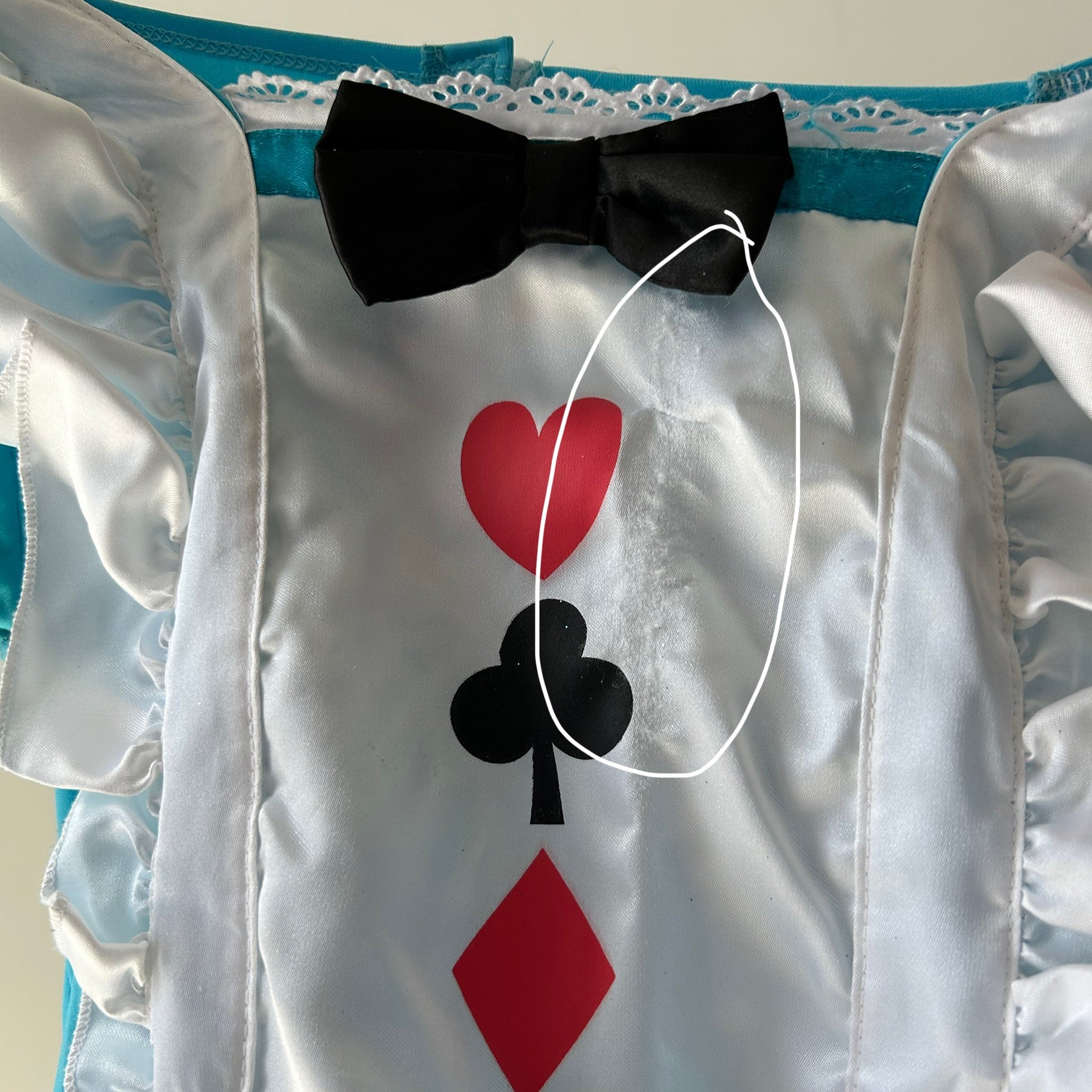 - Details: Satin mini dress with puff sleeves and layered organza skirt; attached apron with card suit and key motifs; includes striped and harlequin sleeves and matching tights; comes with matching bow headband