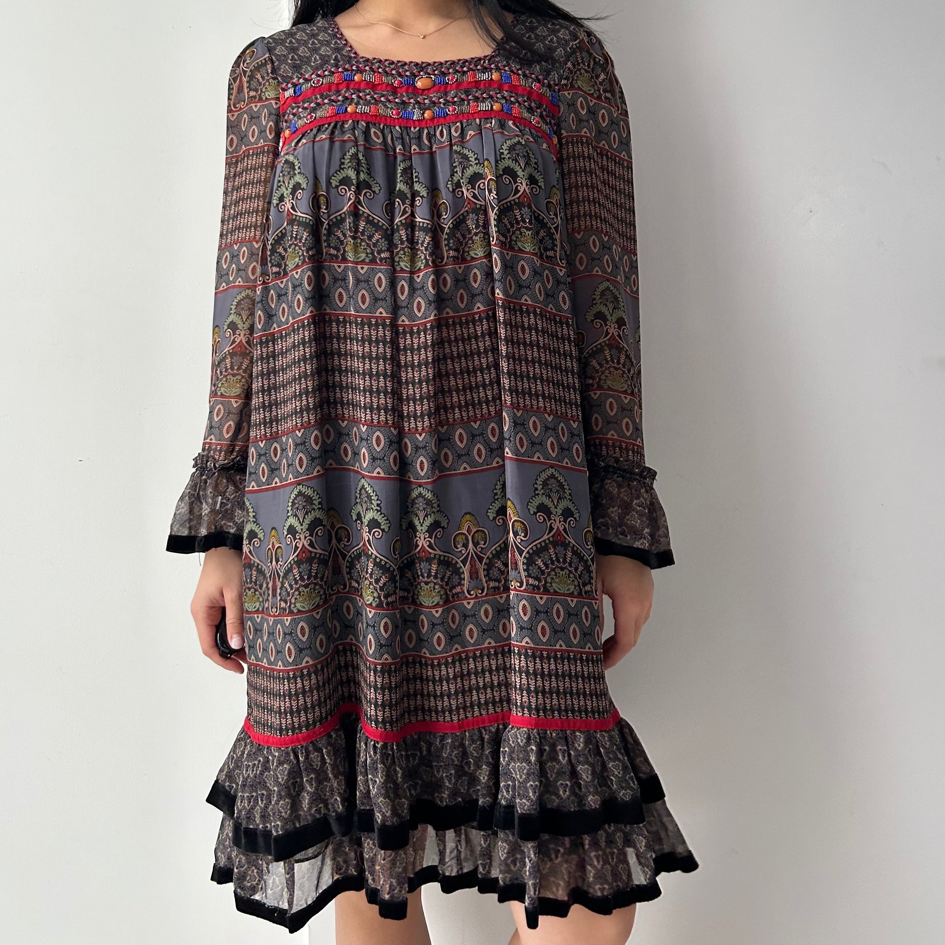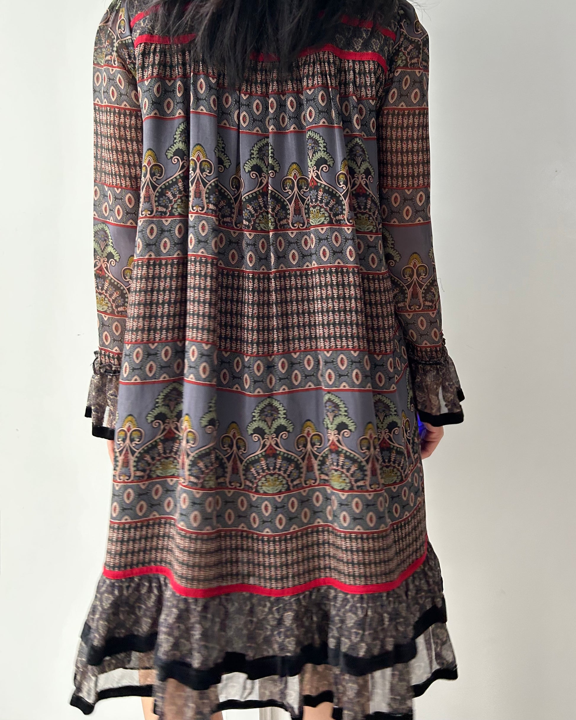 - Details: Sheer chiffon with engineered paisley and geometric print; beaded crochet yoke; scoop neckline; blouson long sleeves with velvet cuffs; tiered ruffle hem with contrast piping