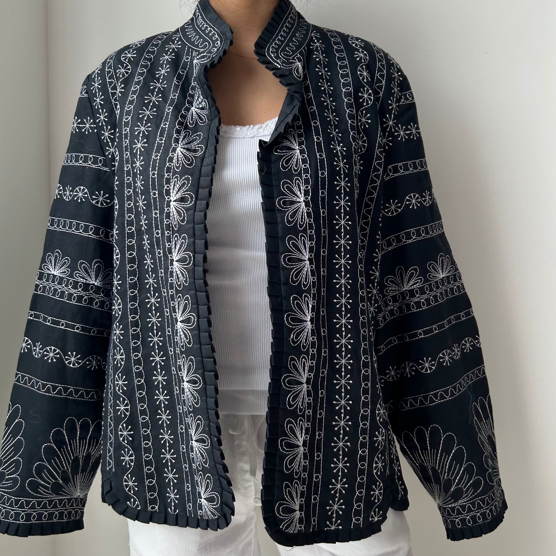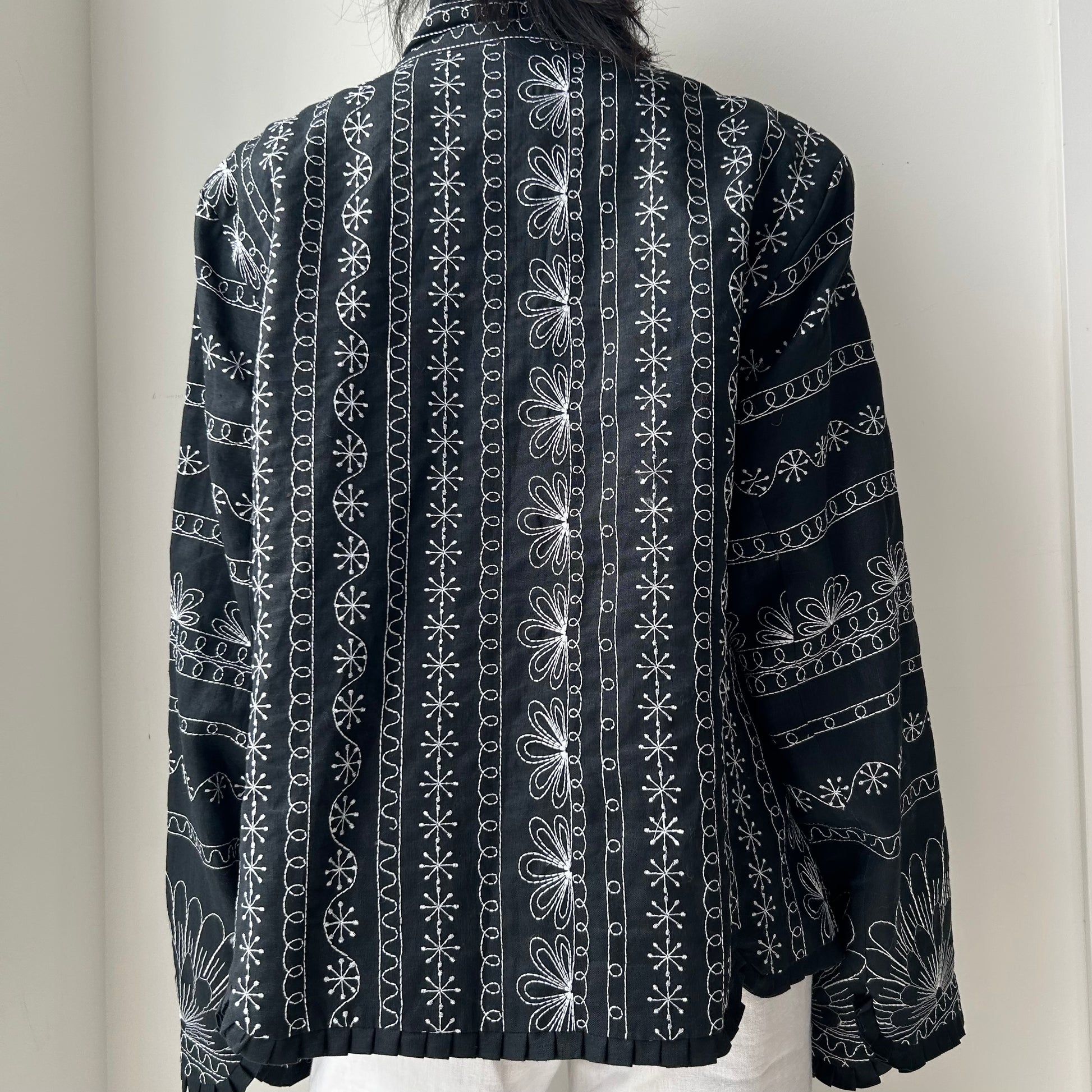 - Details: Black quilted cotton canvas with allover white embroidery; stand collar and scalloped ruffle trim; open front with hook and eye closures; intricate floral and geometric motifs