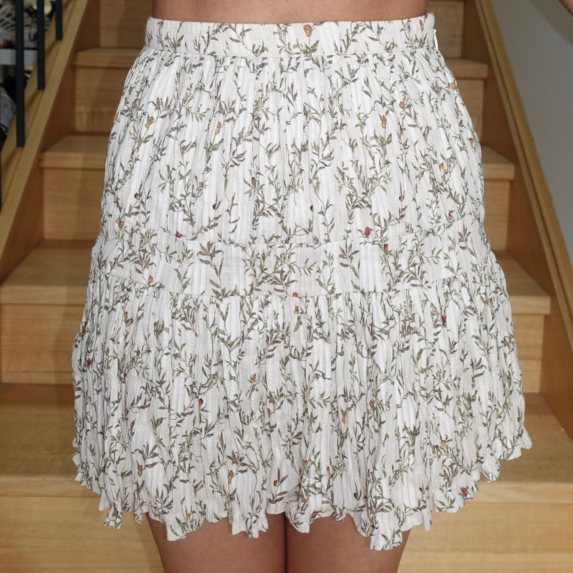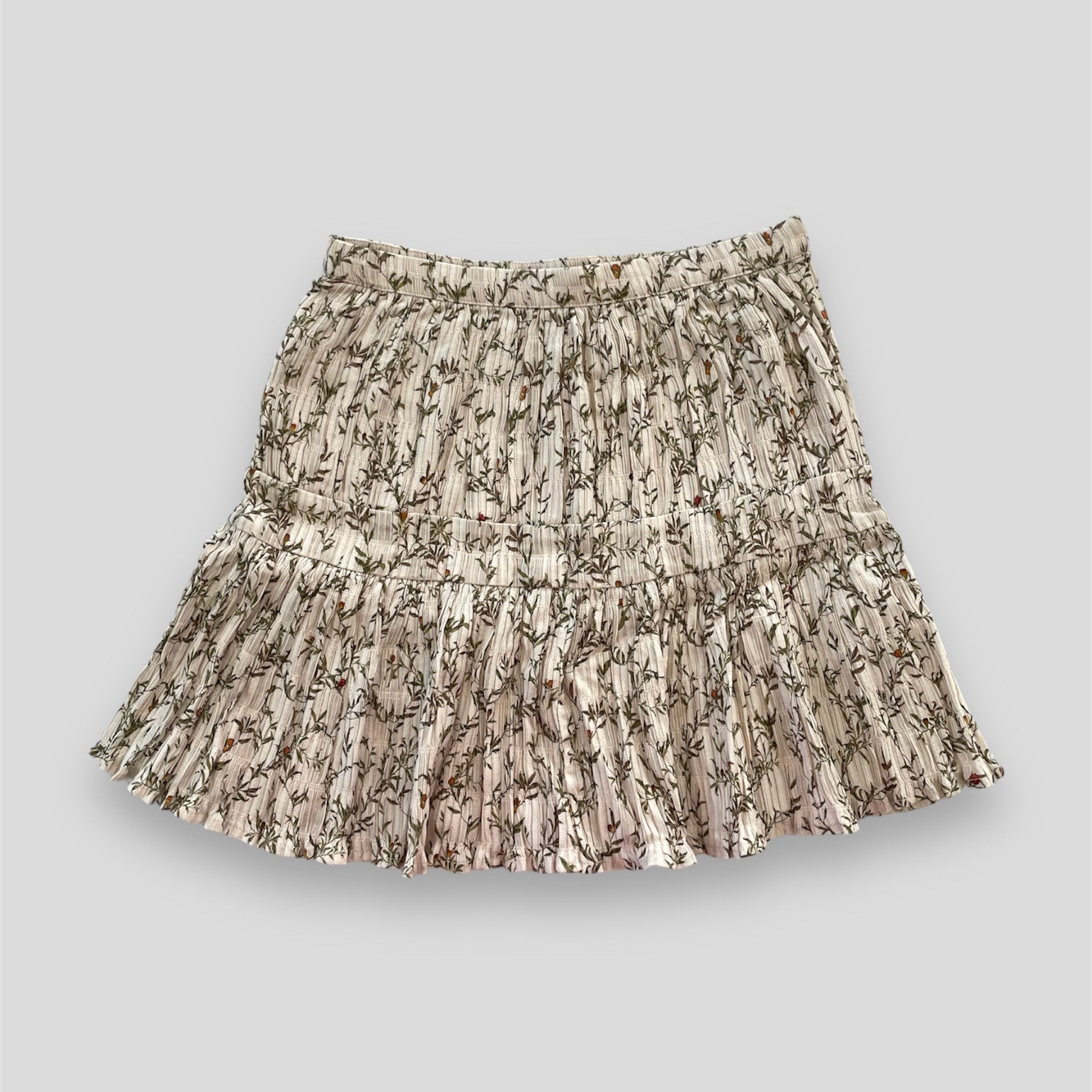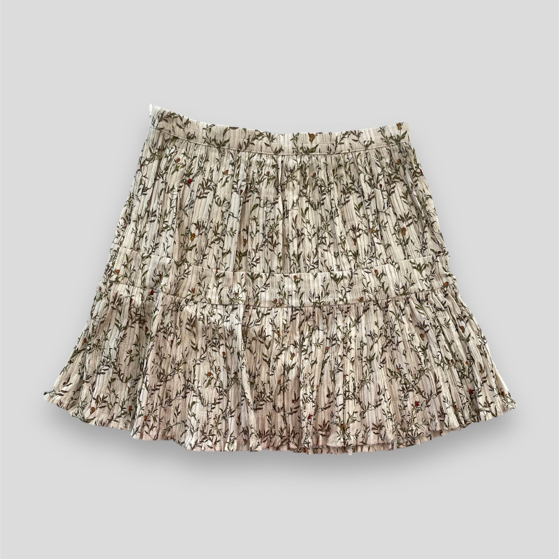 - Details: The Alba skirt; mid-rise pleated mini skirt; crinkle finished cotton jacquard with panel detailing; concealed side zip; cream with green leaf print