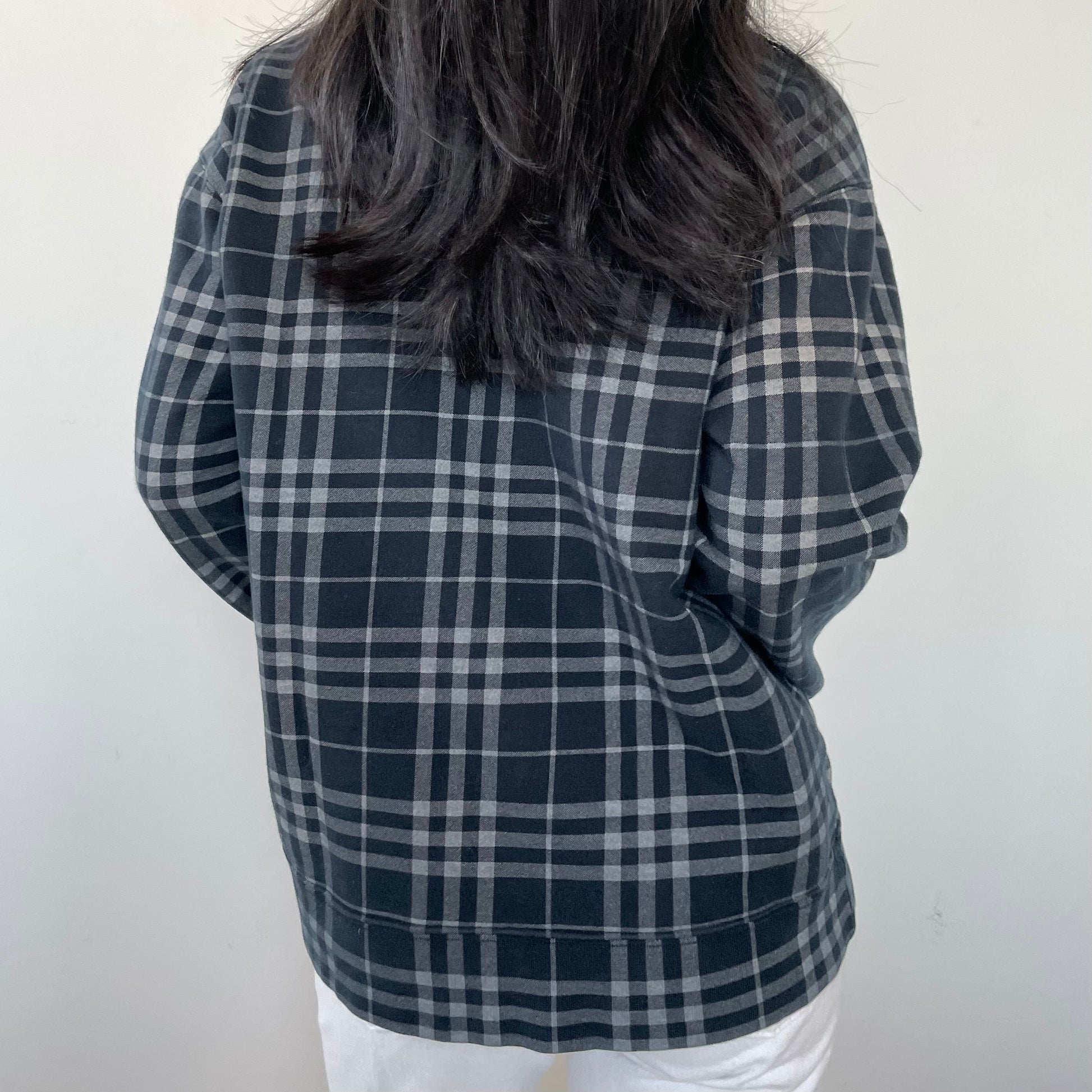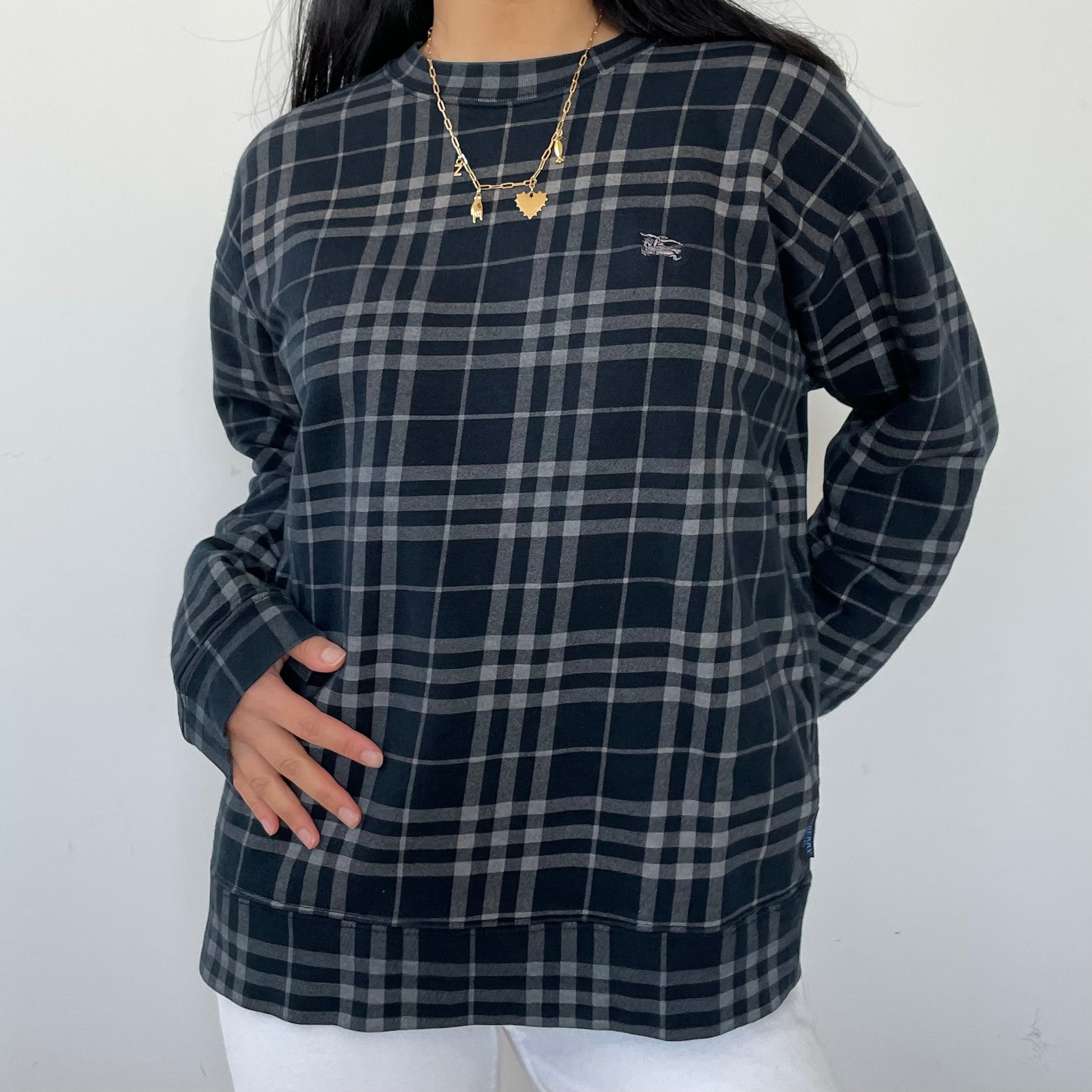 - Details: Dark blue nova check crewneck sweatshirt; long sleeves