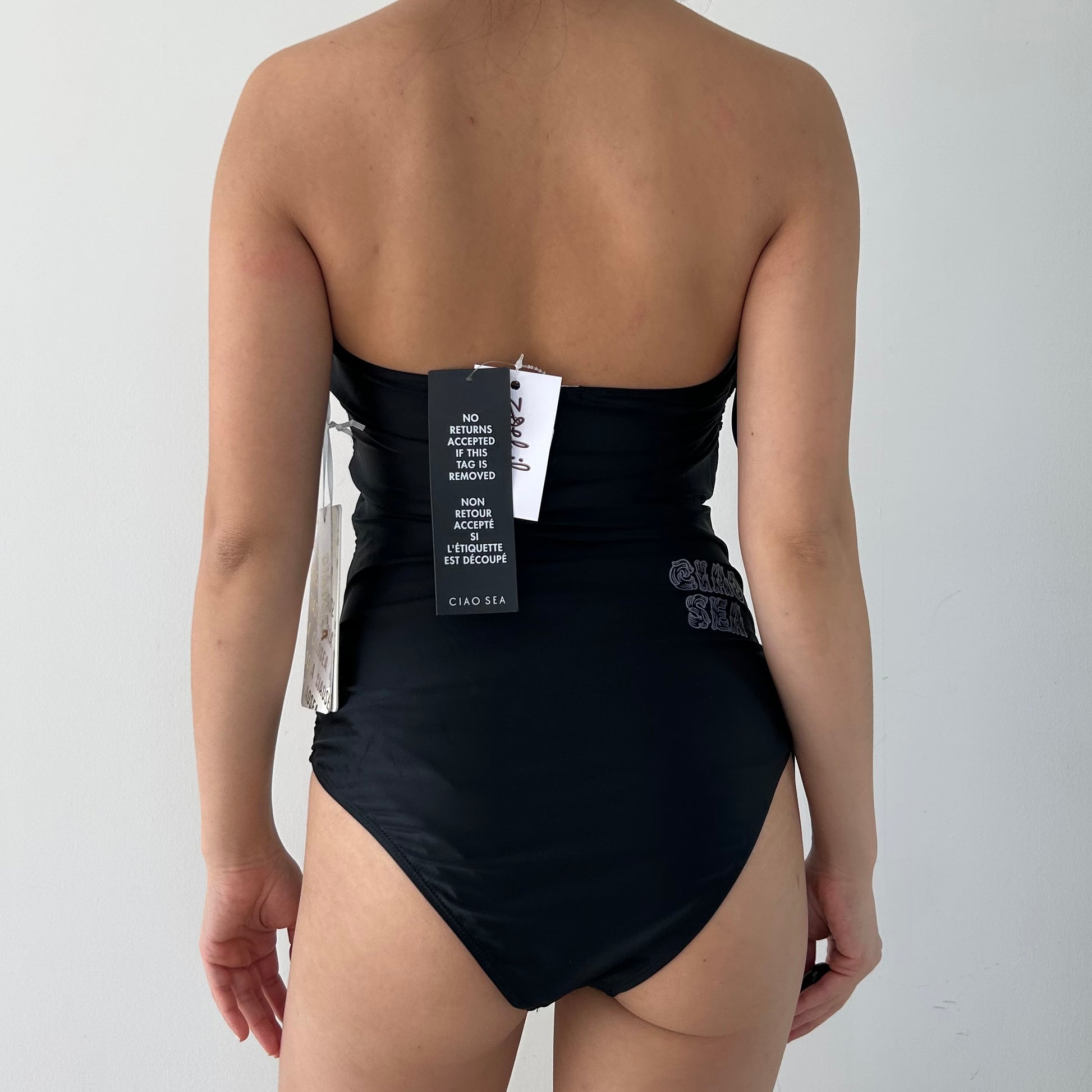 - Details: Black strapless one piece swimsuit; purple/grey glittery 'Ciao Sea' logo at left chest; side ties