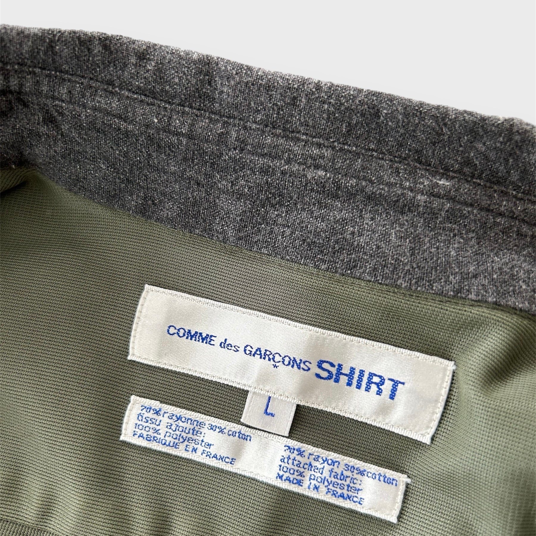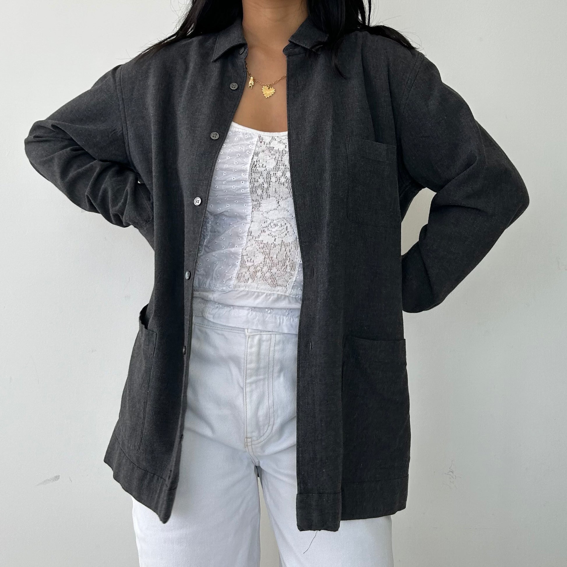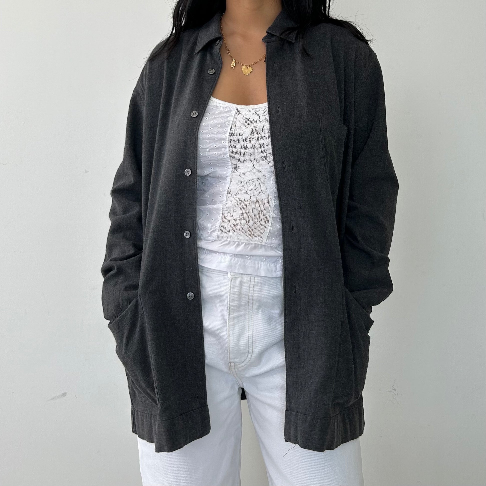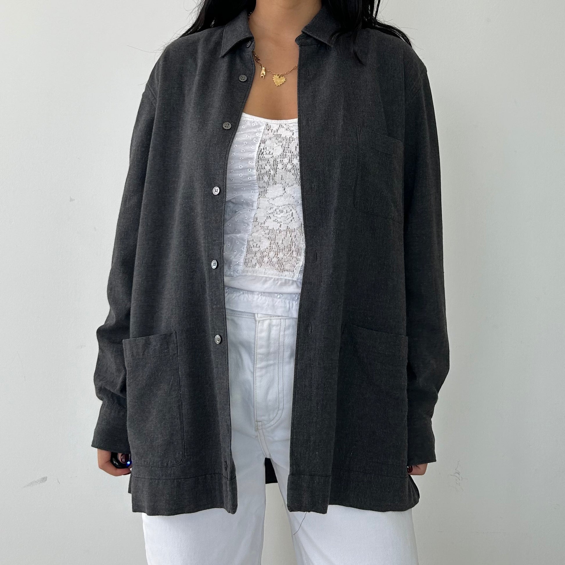 - Details: Grey long sleeve button up shirt; double lined; three front pockets