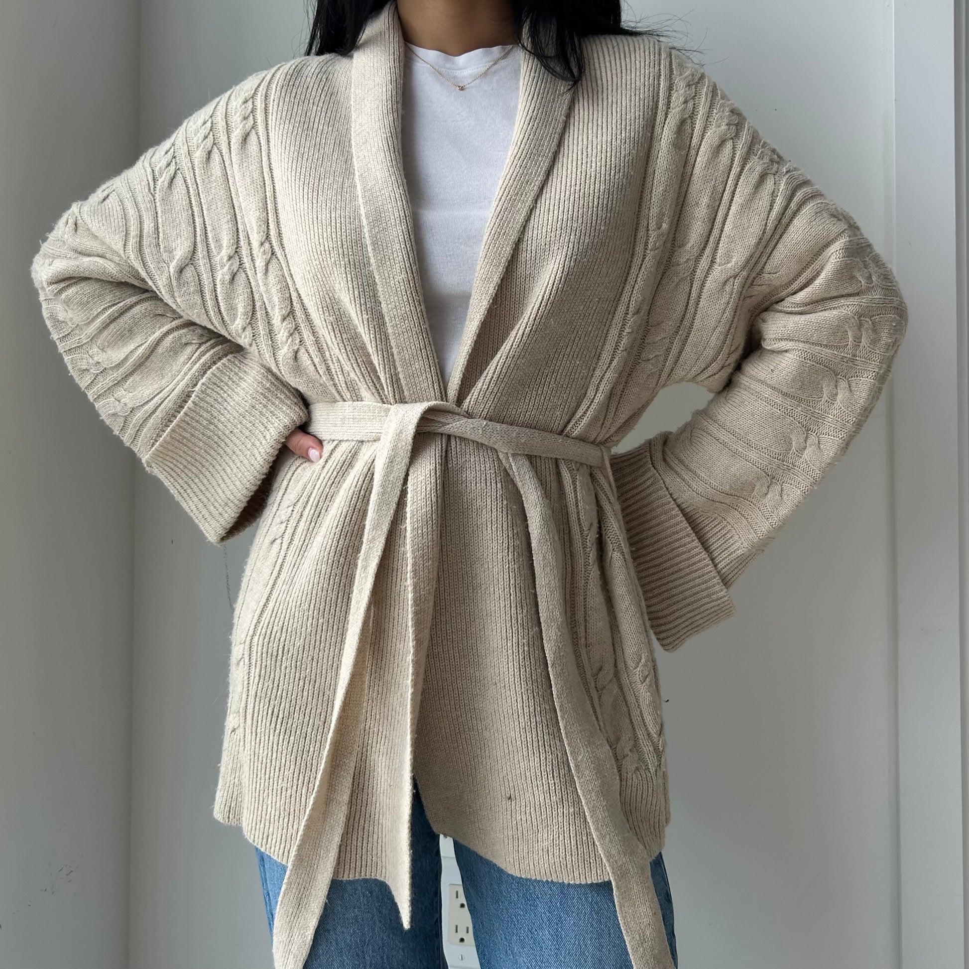 - Details: Chunky cable and open stitch knit in warm cream/ivory; open wrap front with wide matching fabric belt tie; long dolman sleeves with subtle bell cuff detail; relaxed, oversized fit draping to hip length