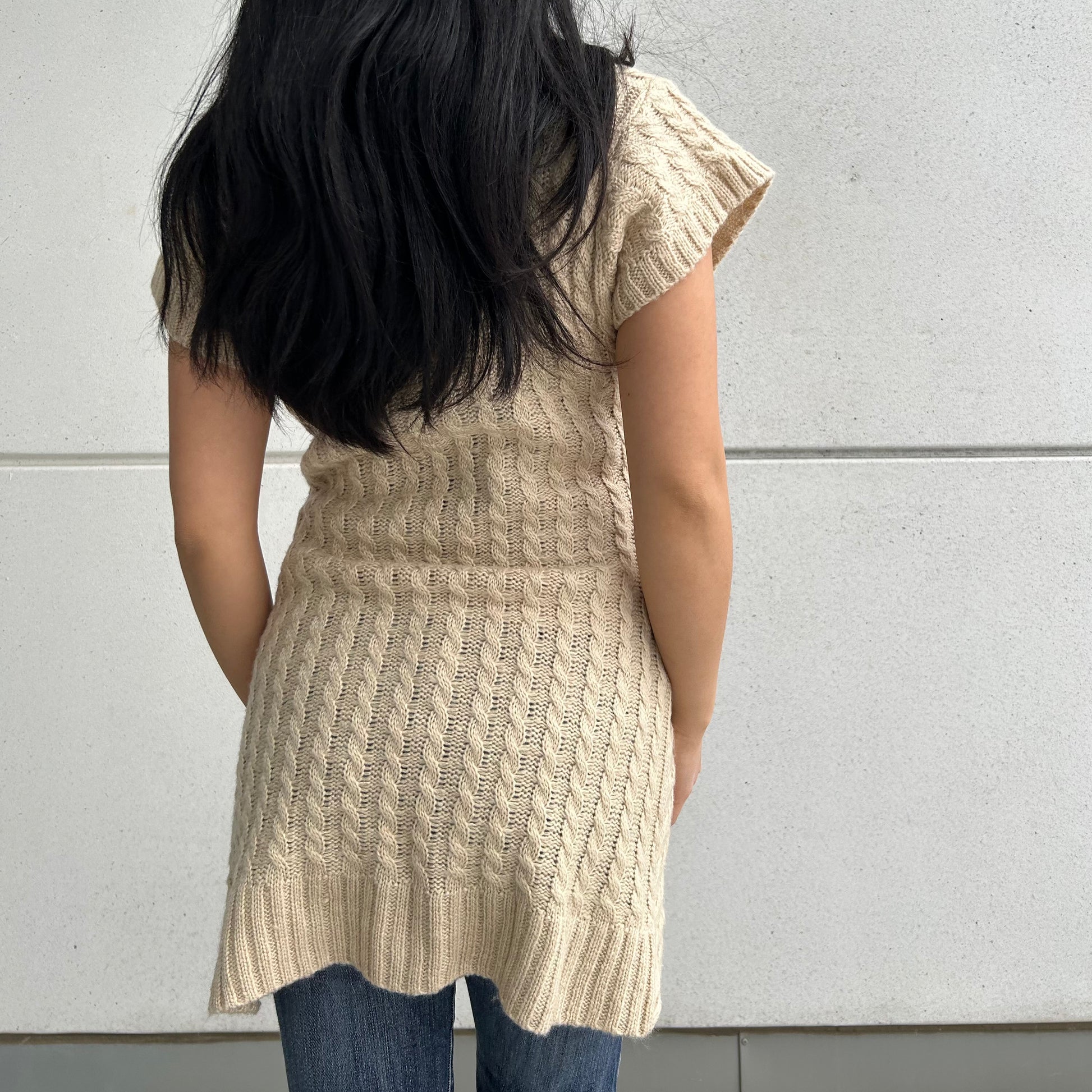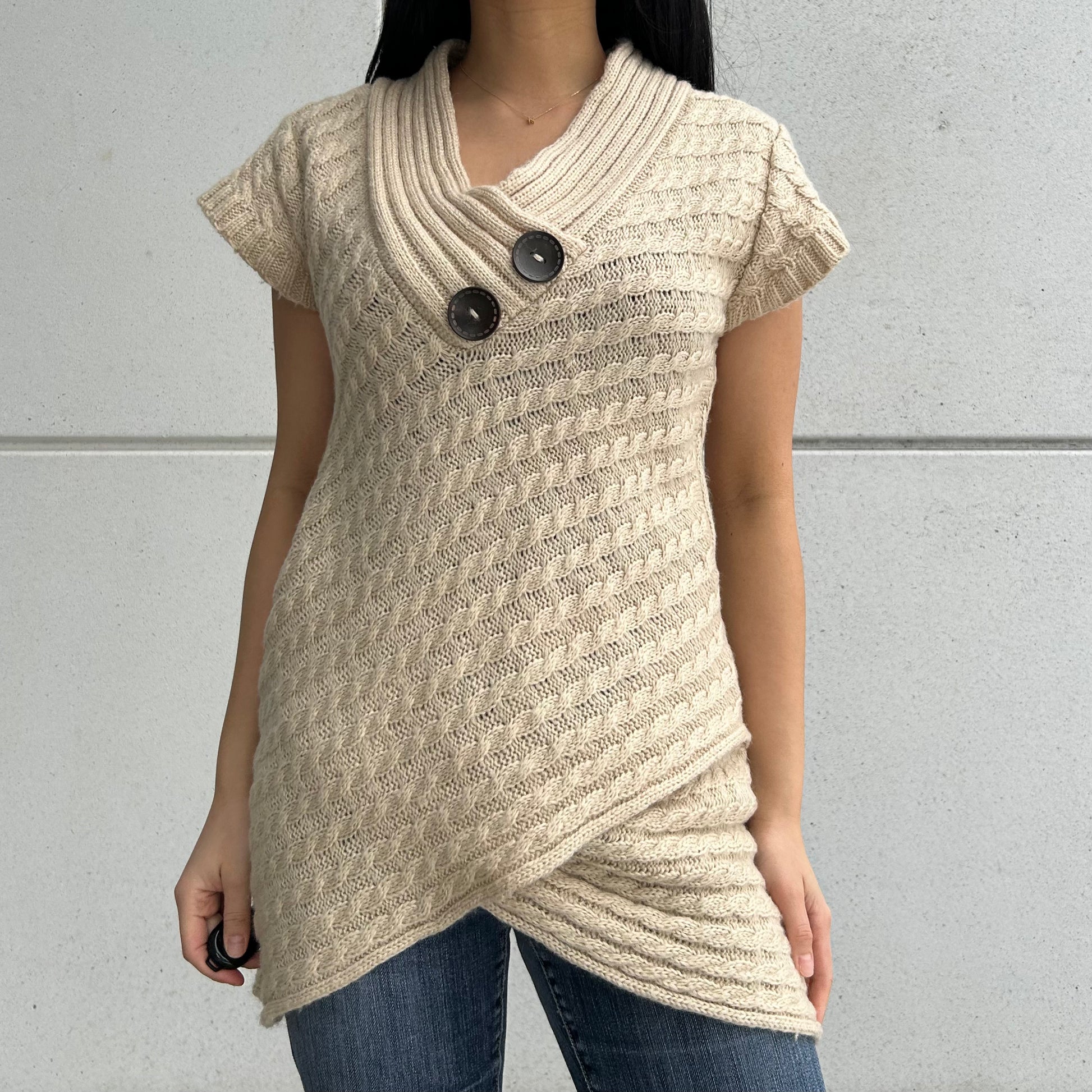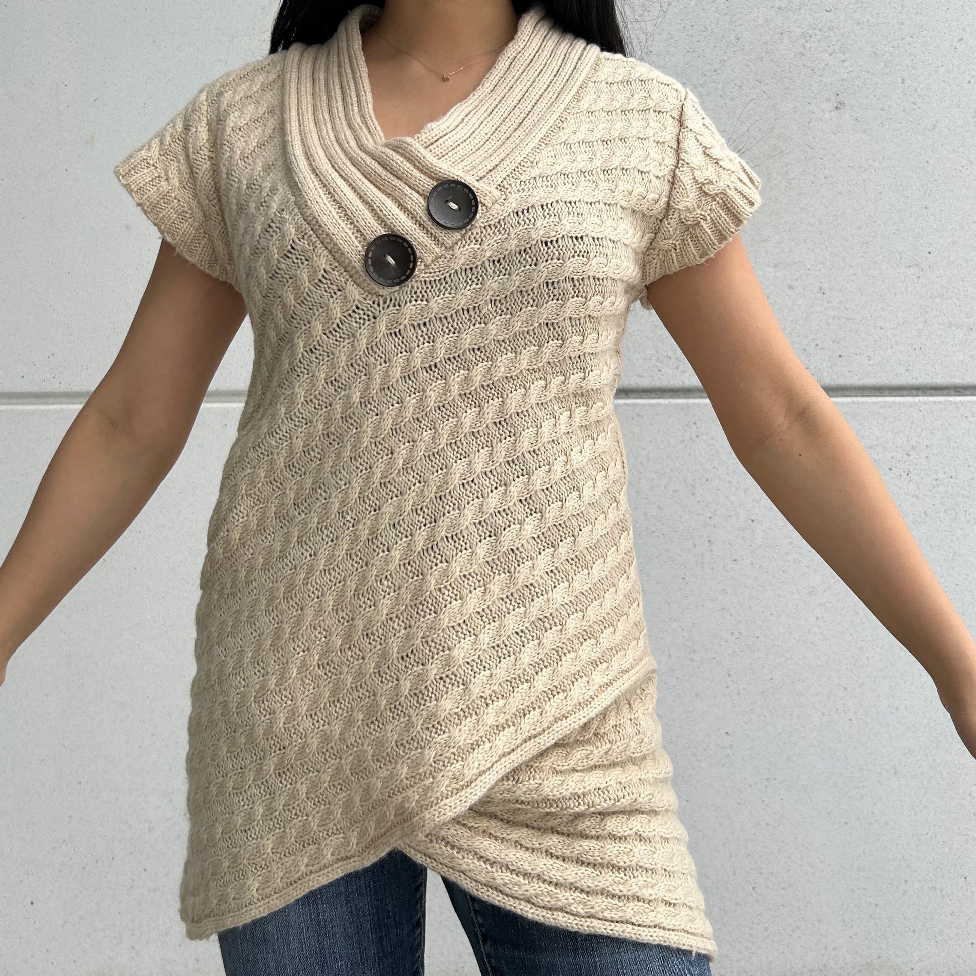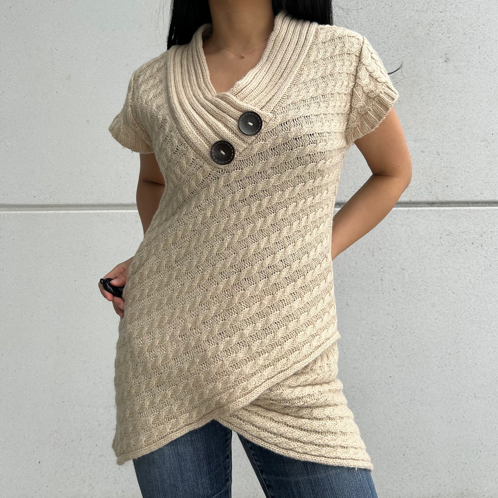 - Details: Short-sleeve tunic sweater in beige with an intricate cable-knit design; features an oversized shawl collar with dual decorative button accents and a flattering crossover hem