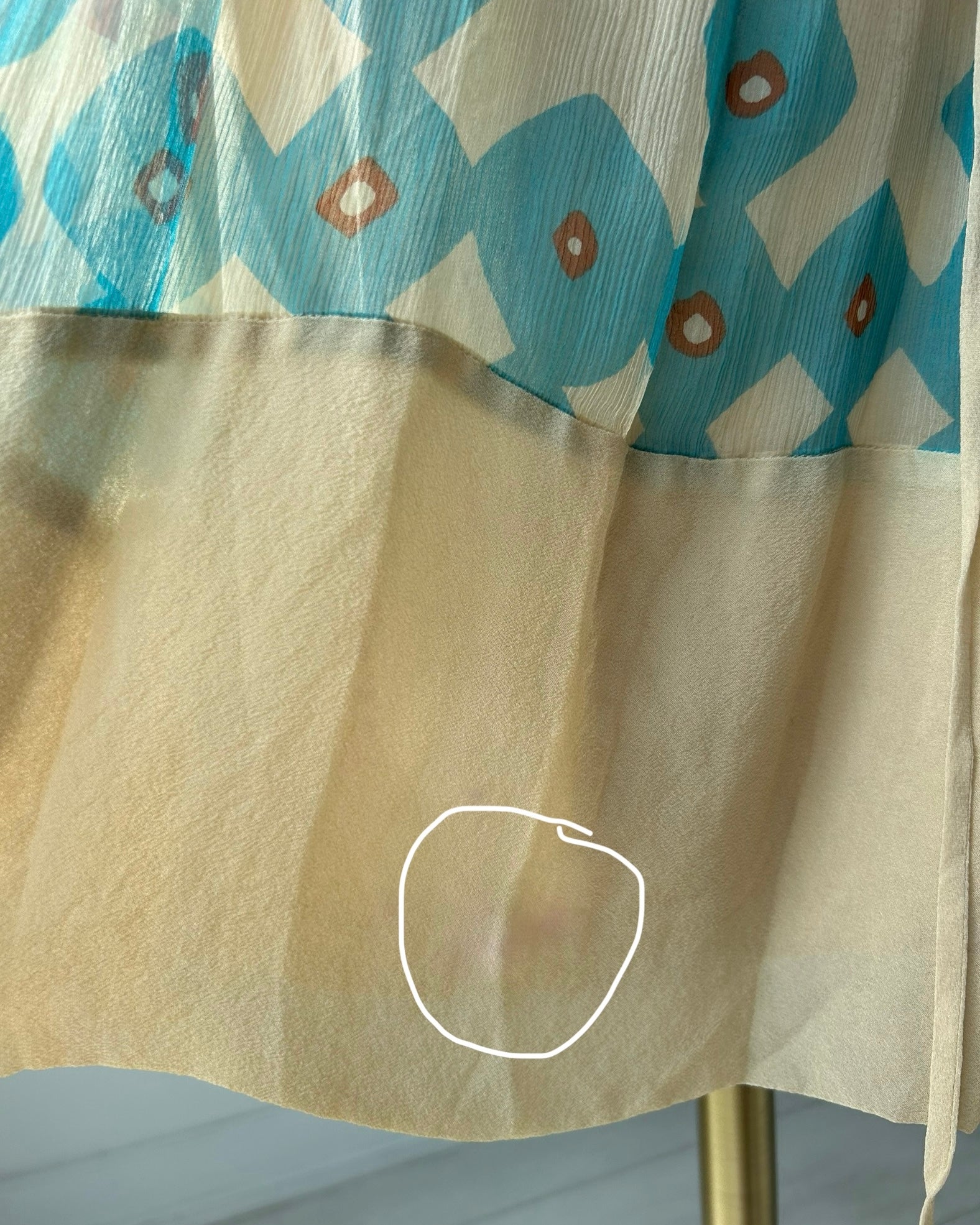 Details: Silk chiffon in ivory with turquoise diamond print; shirred neckline with spaghetti straps; cinched waist tie for adjustable empire silhouette