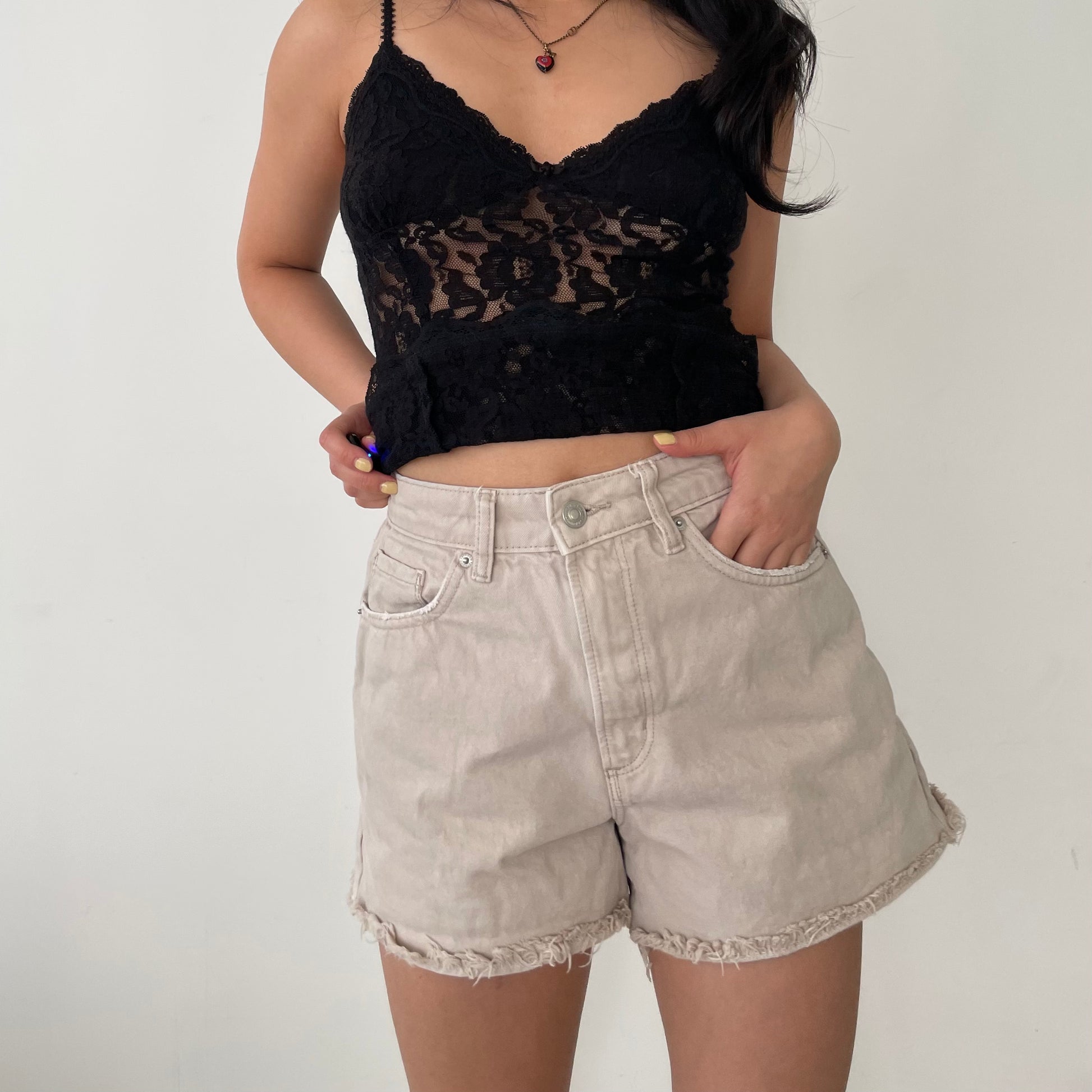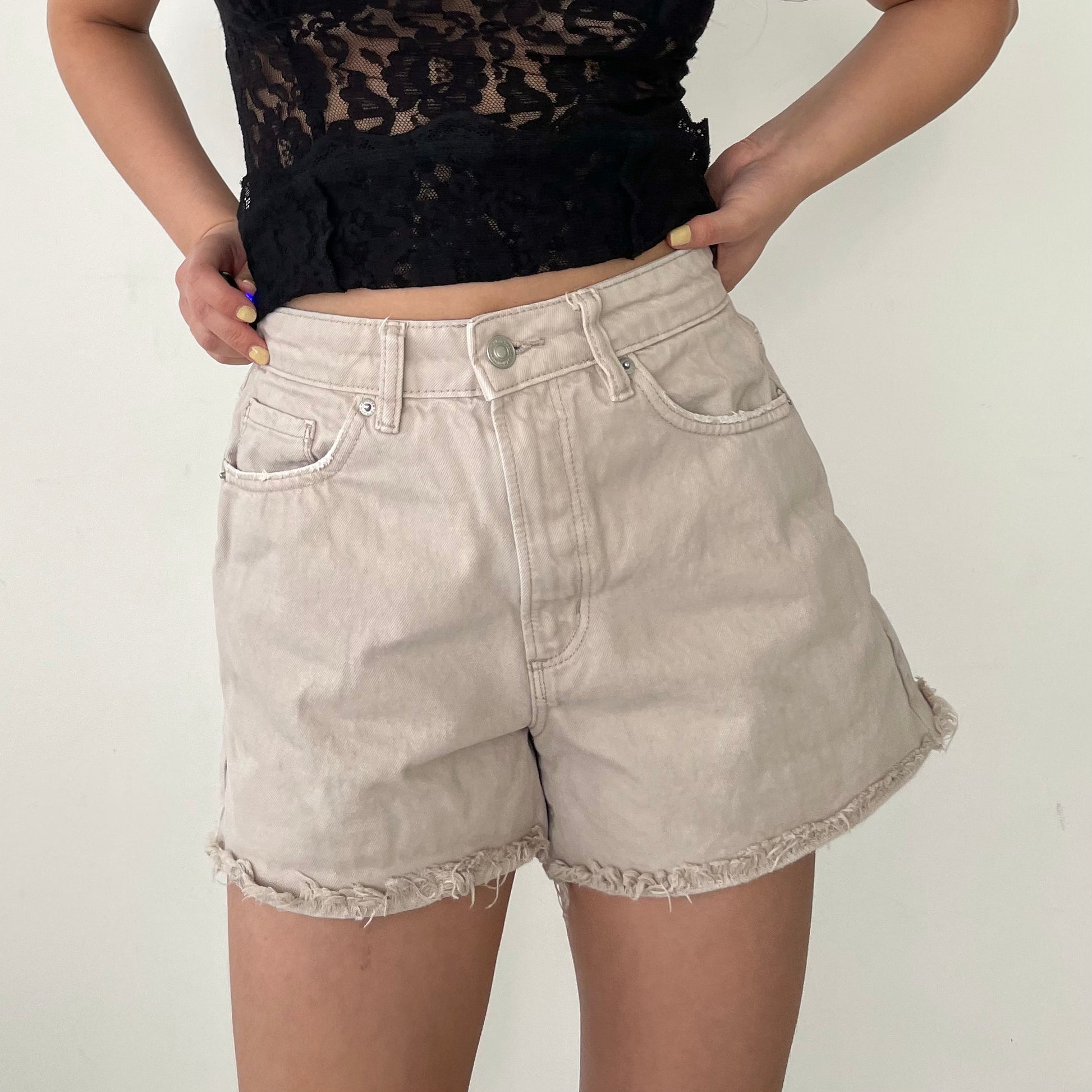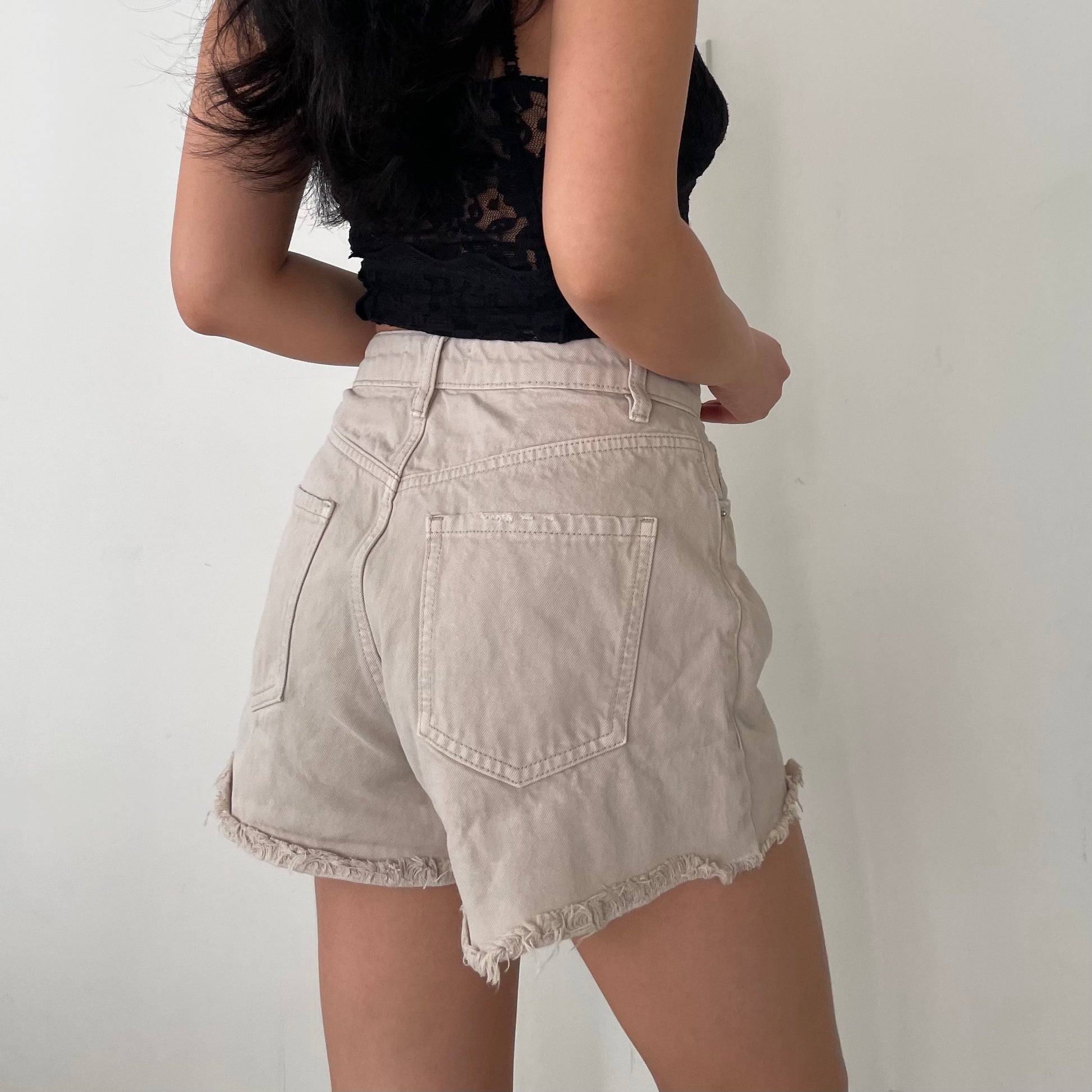 - Details: The 'Ella' short; mid thigh; high rise; raw hem; khaki beige colour