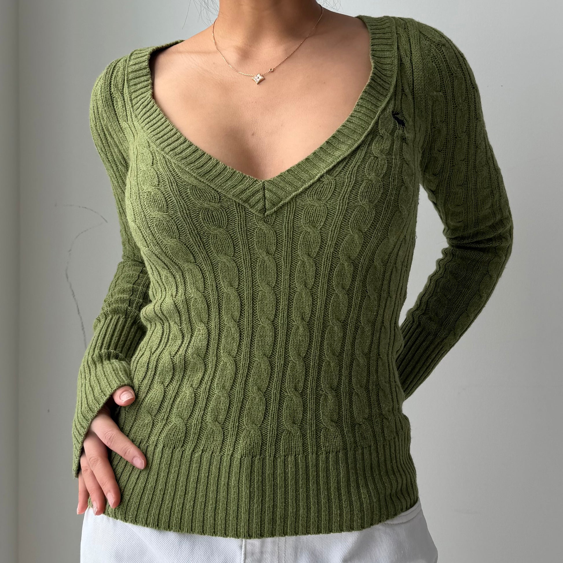 Early 2000s Abercrombie Green Rabbit Hair Blend V-Neck Cable Knit Jumper - X-Small