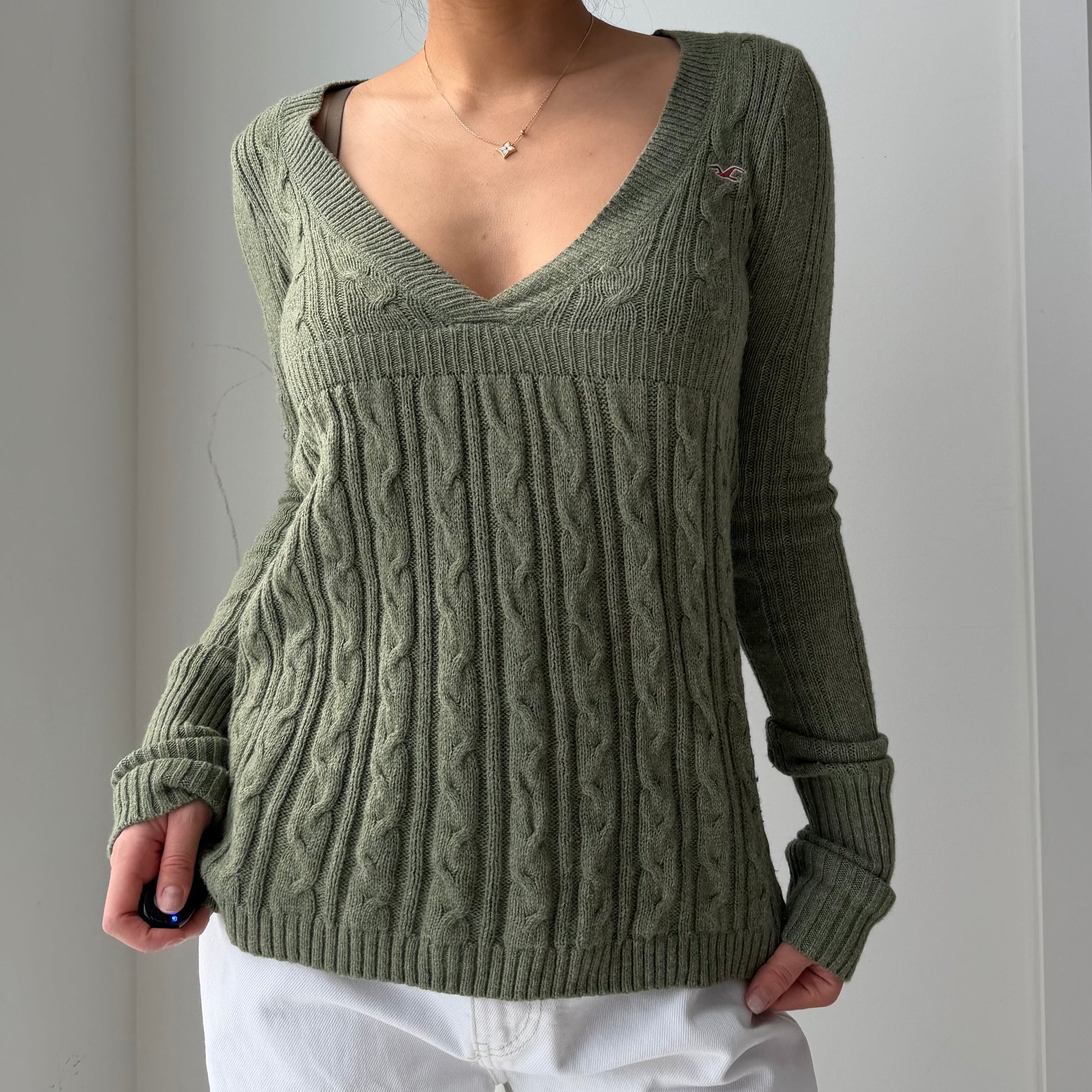 - Details: Olive green cable-knit babydoll sweater; deep v-neckline with logo embroidery at chest; long sleeves and ribbed trim