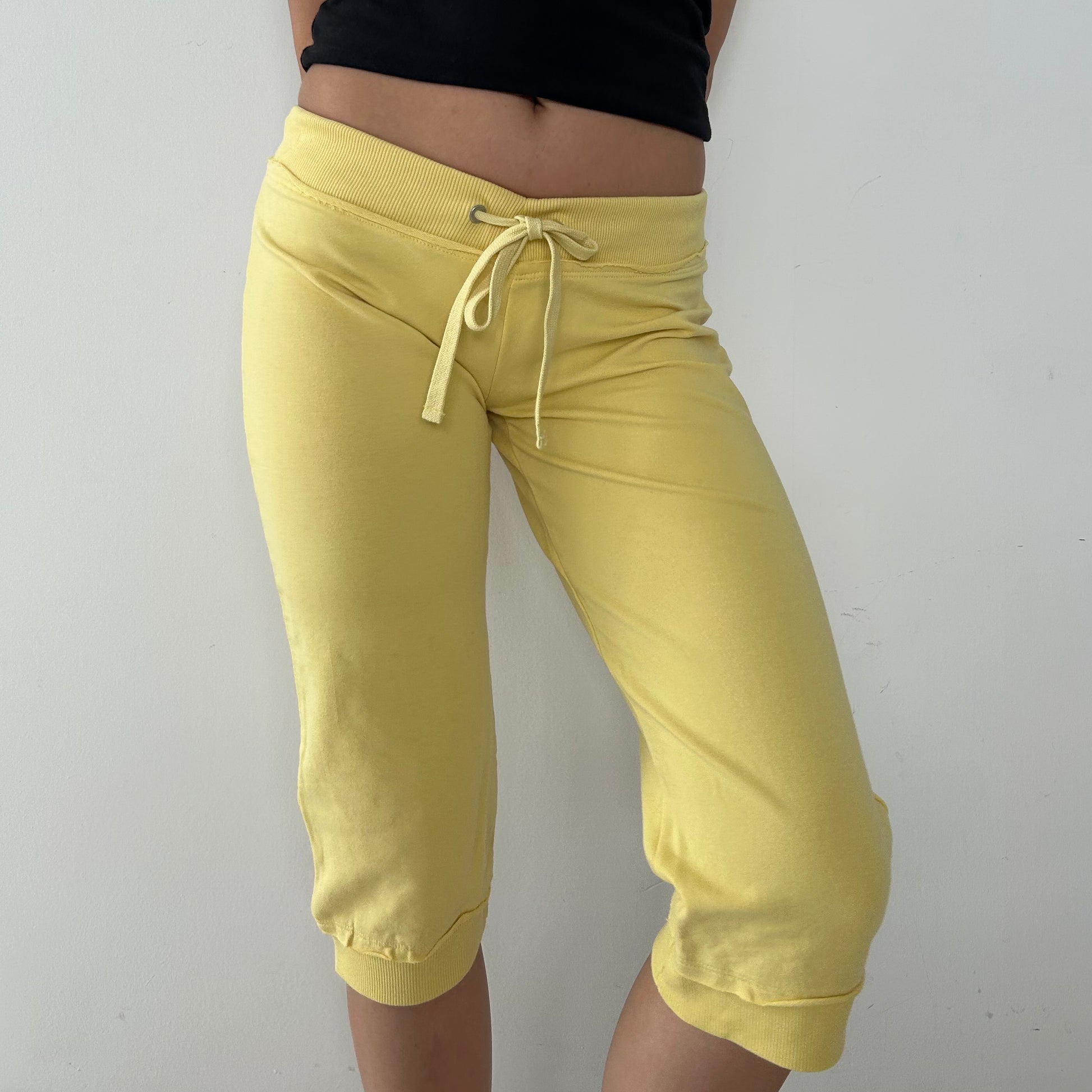 - Details: From the early 2000s; low waist yellow capri sweatpants; drawstring at the waist; single backpocket