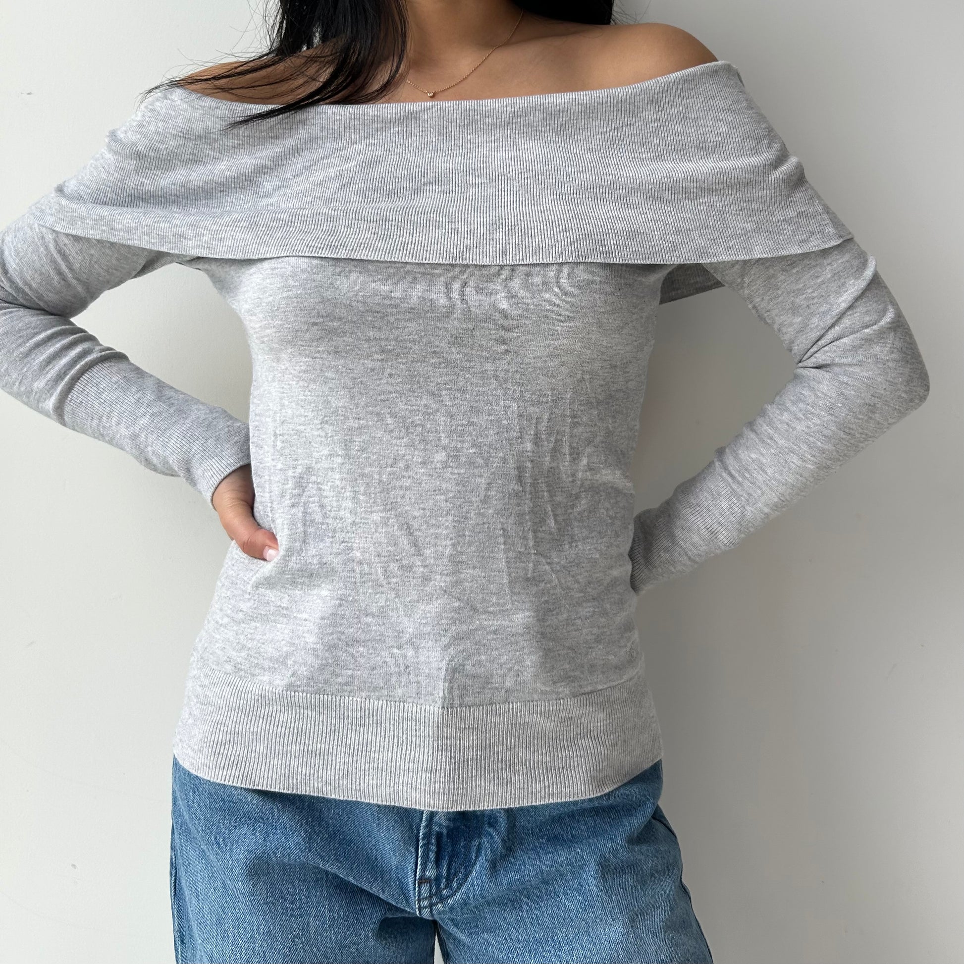 - Details: Heather grey ribbed knit; off shoulder top; long sleeves; metallic embroidered logo at left hem