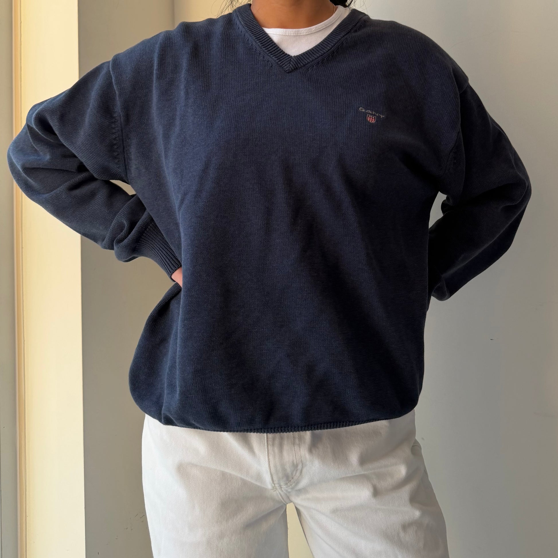 - Details: Cotton knit sweater in navy; v-neckline with ribbed trim at collar, hem, and cuffs; relaxed fit with dropped shoulders and Gant logo embroidery at chest