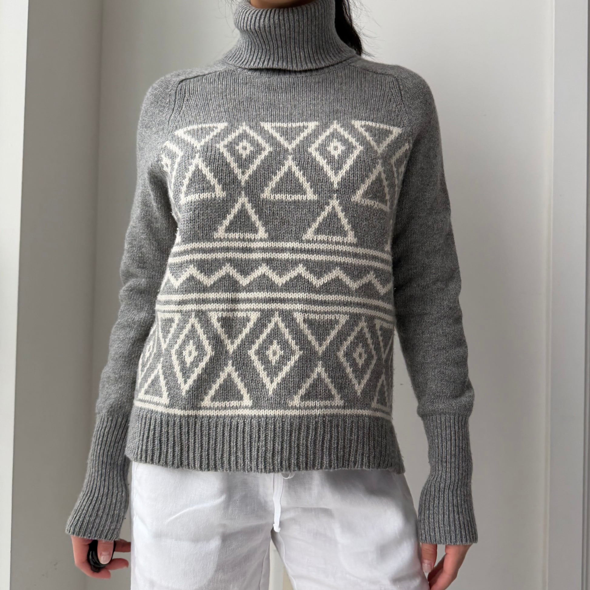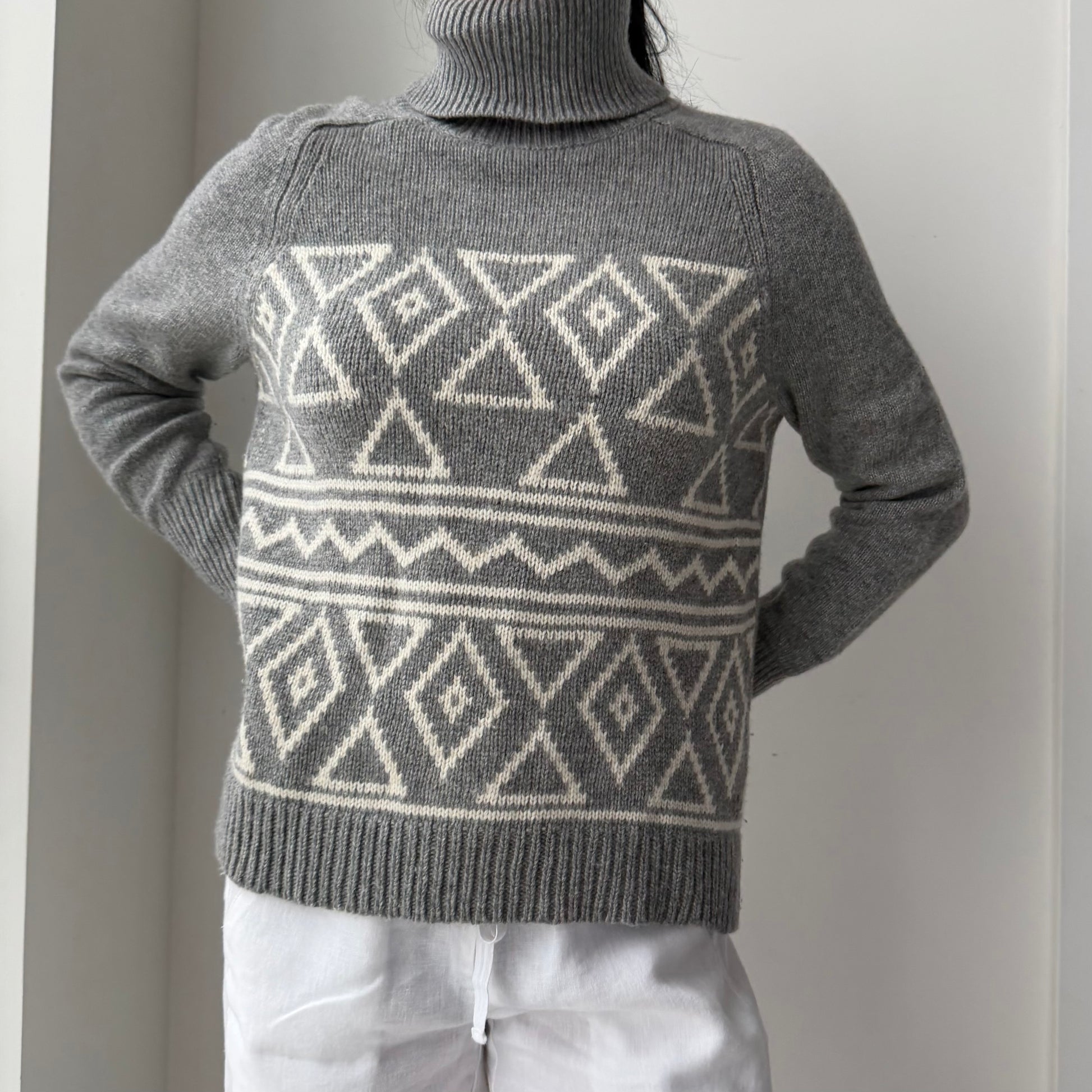 - Details: Grey high ribbed turtleneck; contrast white geometric pattern across chest; long sleeves with fitted ribbed cuffs; relaxed, slightly cropped silhouette