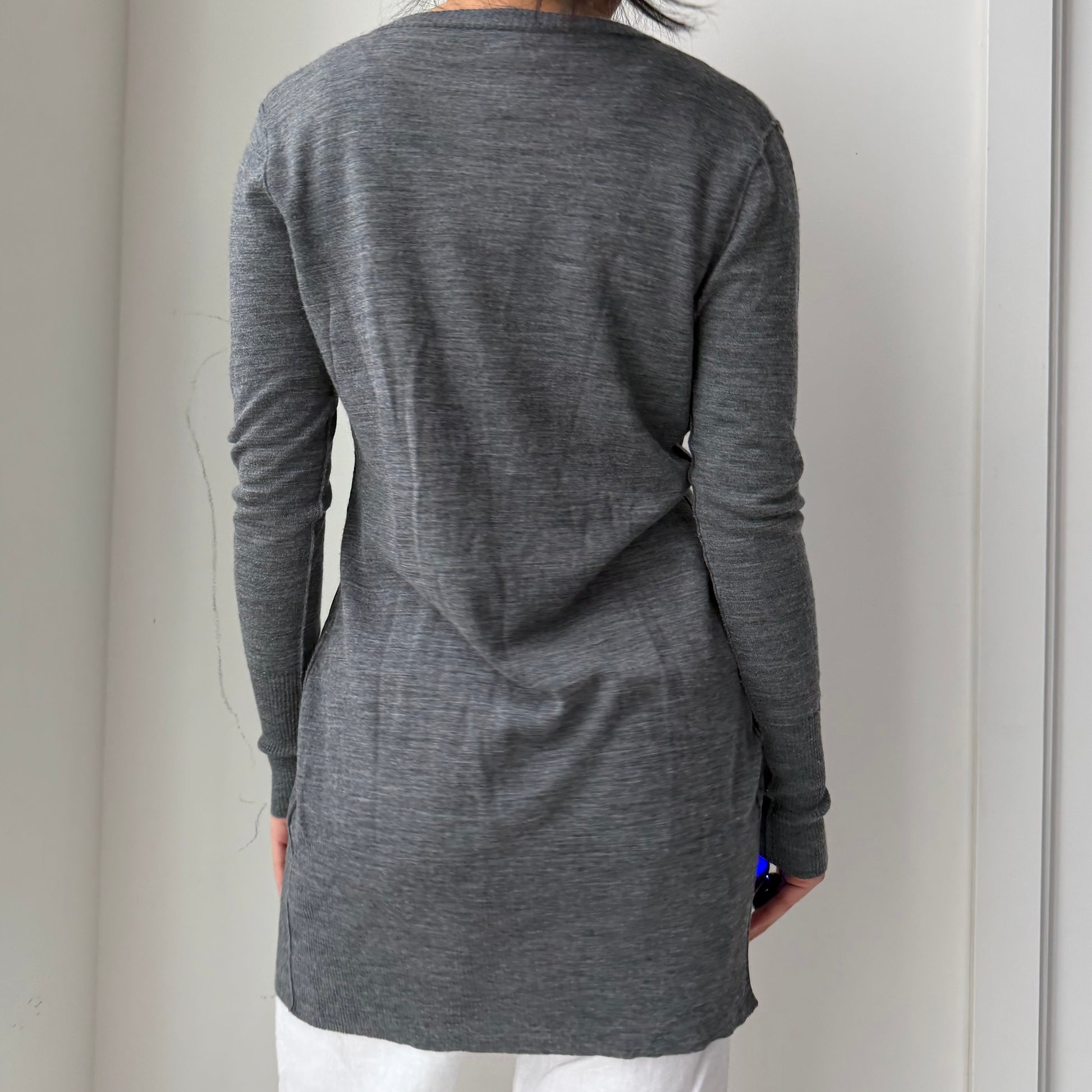 - Details: Lightweight fine knit in charcoal grey; deep v-neckline with button placket; long sleeves with rib-knit cuffs; patch pockets at hips; mid-thigh length with straight hem