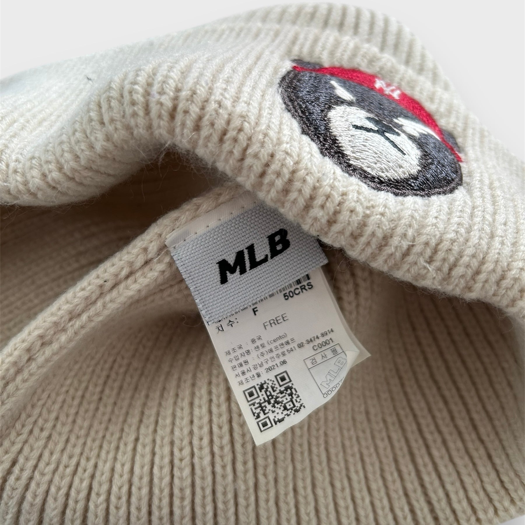 - Details: Cream coloured ribbed knit beanie with embroidered patch of a brown bear wearing red yankees cap