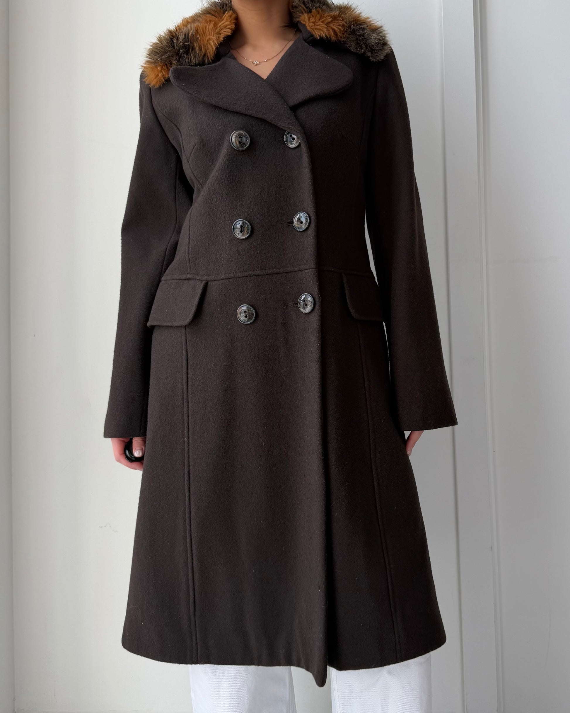 - Details: Longline wool-blend coat in deep chocolate brown with a flared hem; wide notched lapel with two-tone faux fur collar; double-breasted button closure and flap pockets at the hips; tailored seaming through the waist