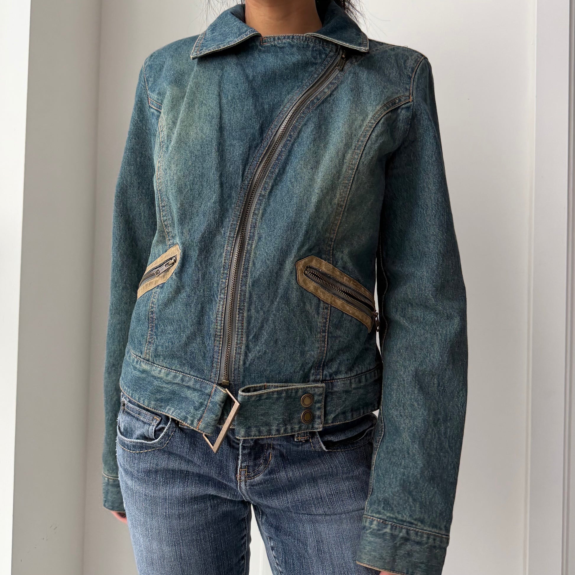 - Details: Faded blue denim biker jacket with genuine leather back panel; spread collar, asymmetric zip front, and belted hem; welt pockets with leather trim; leather baroque motif on the back