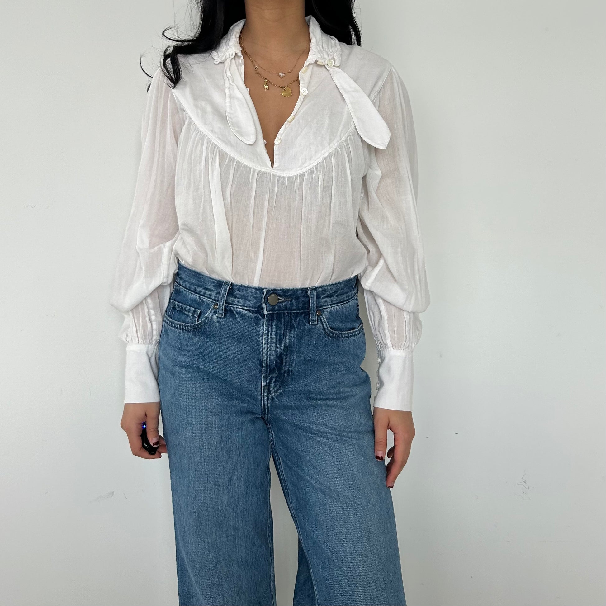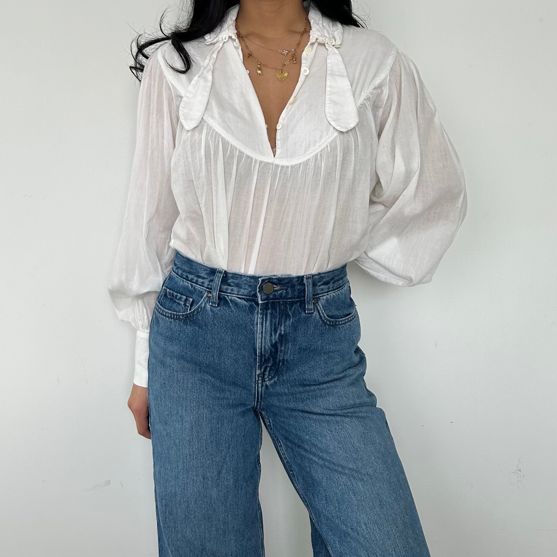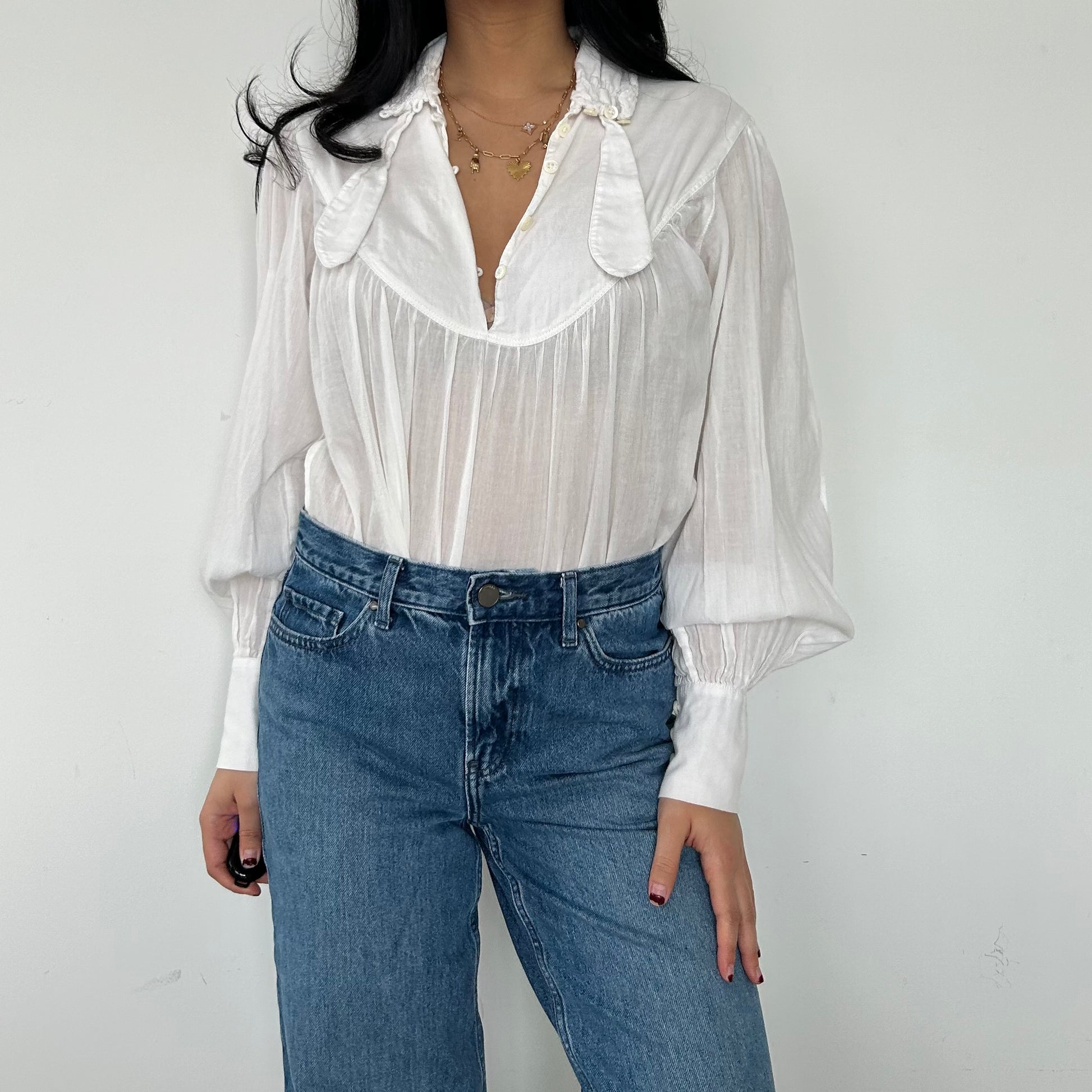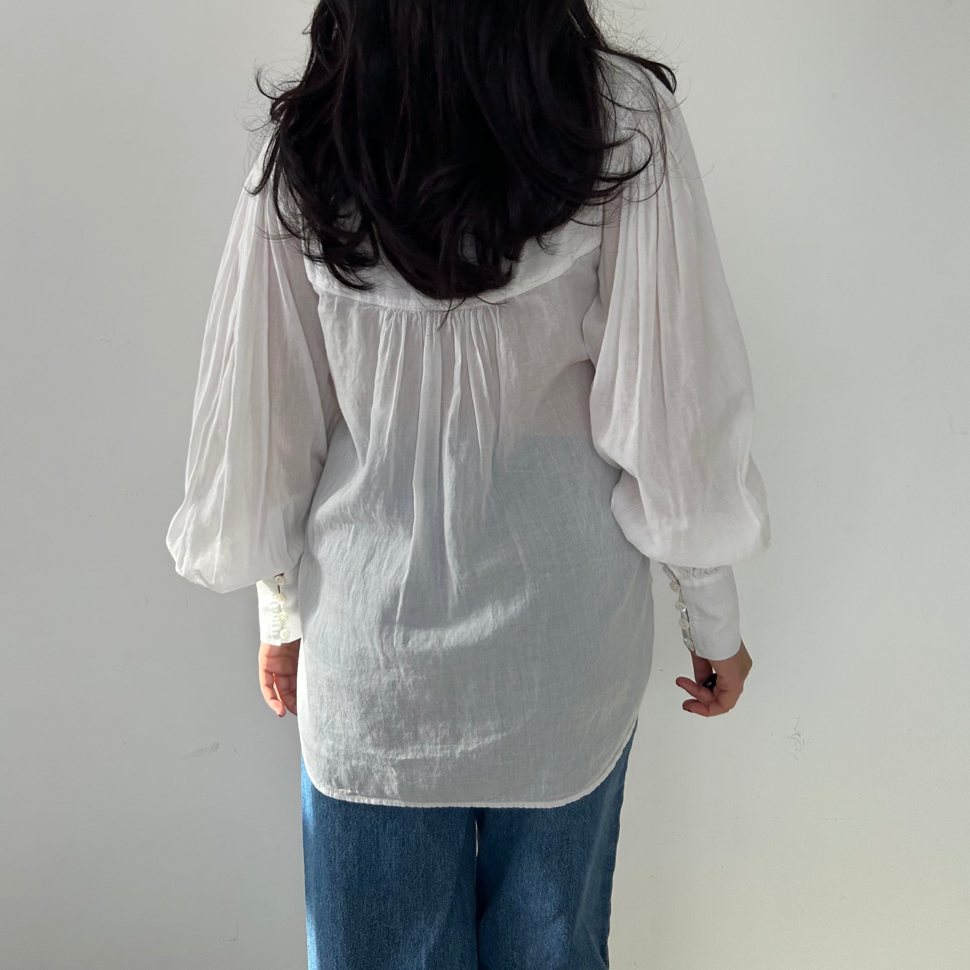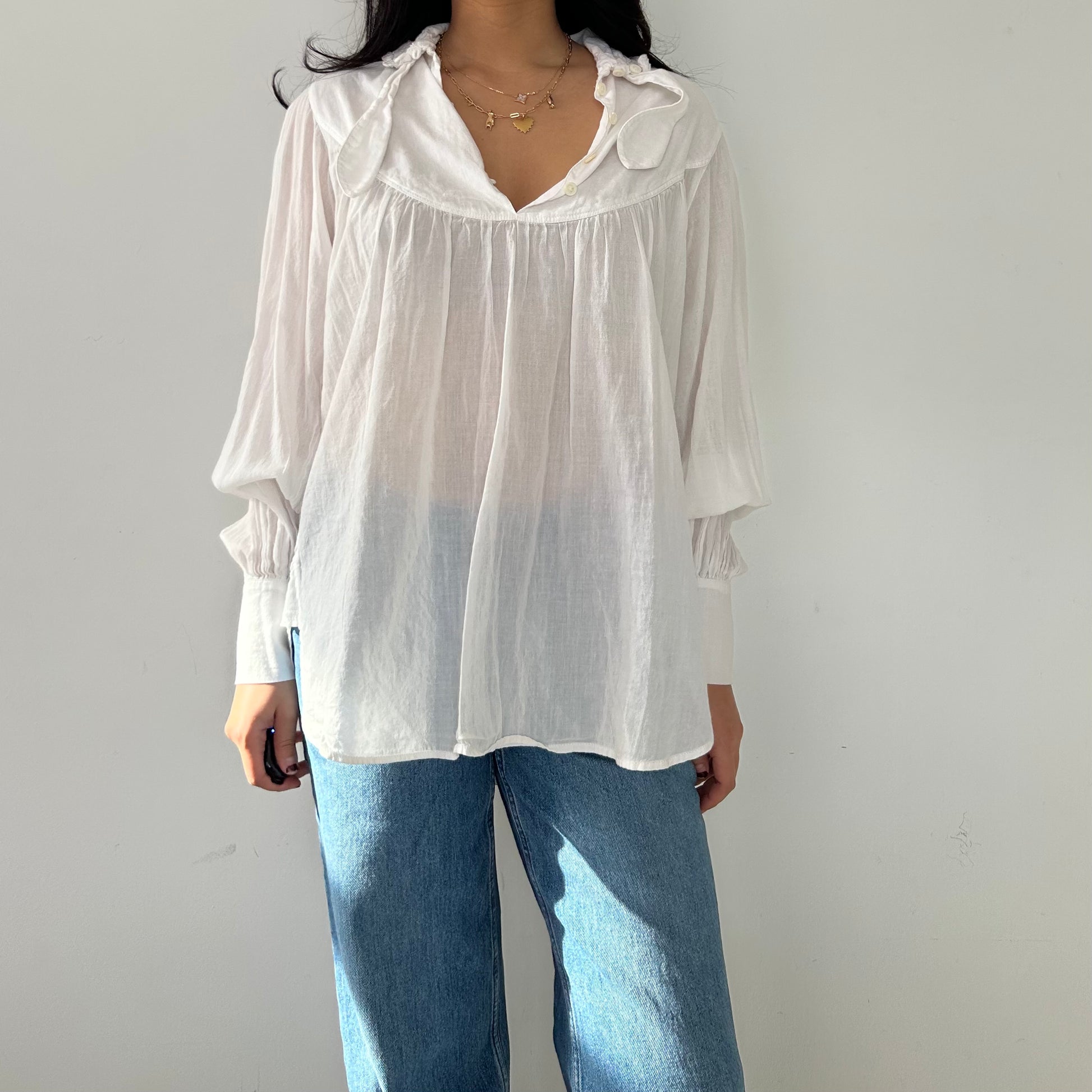 - Details: Semi-sheer white blouse; relaed fit; gathered details along the yoke; subtle v-neckline; voluminous sleeves with cinched cuffs