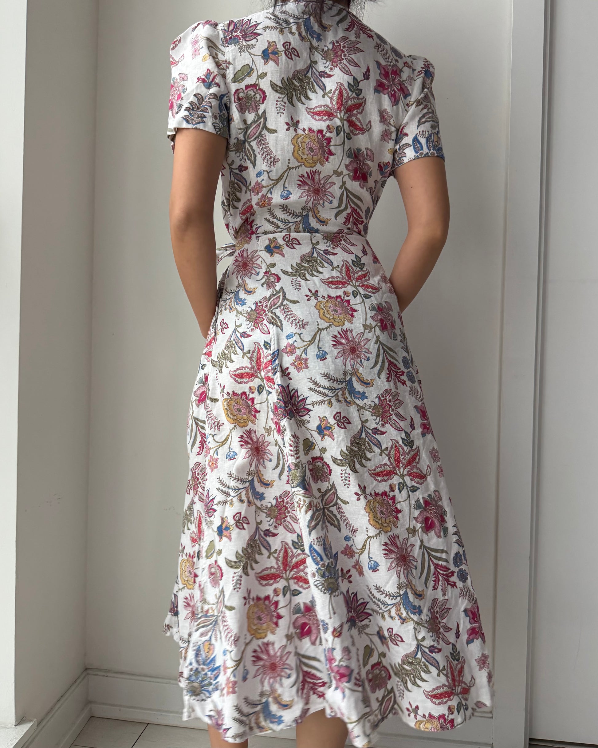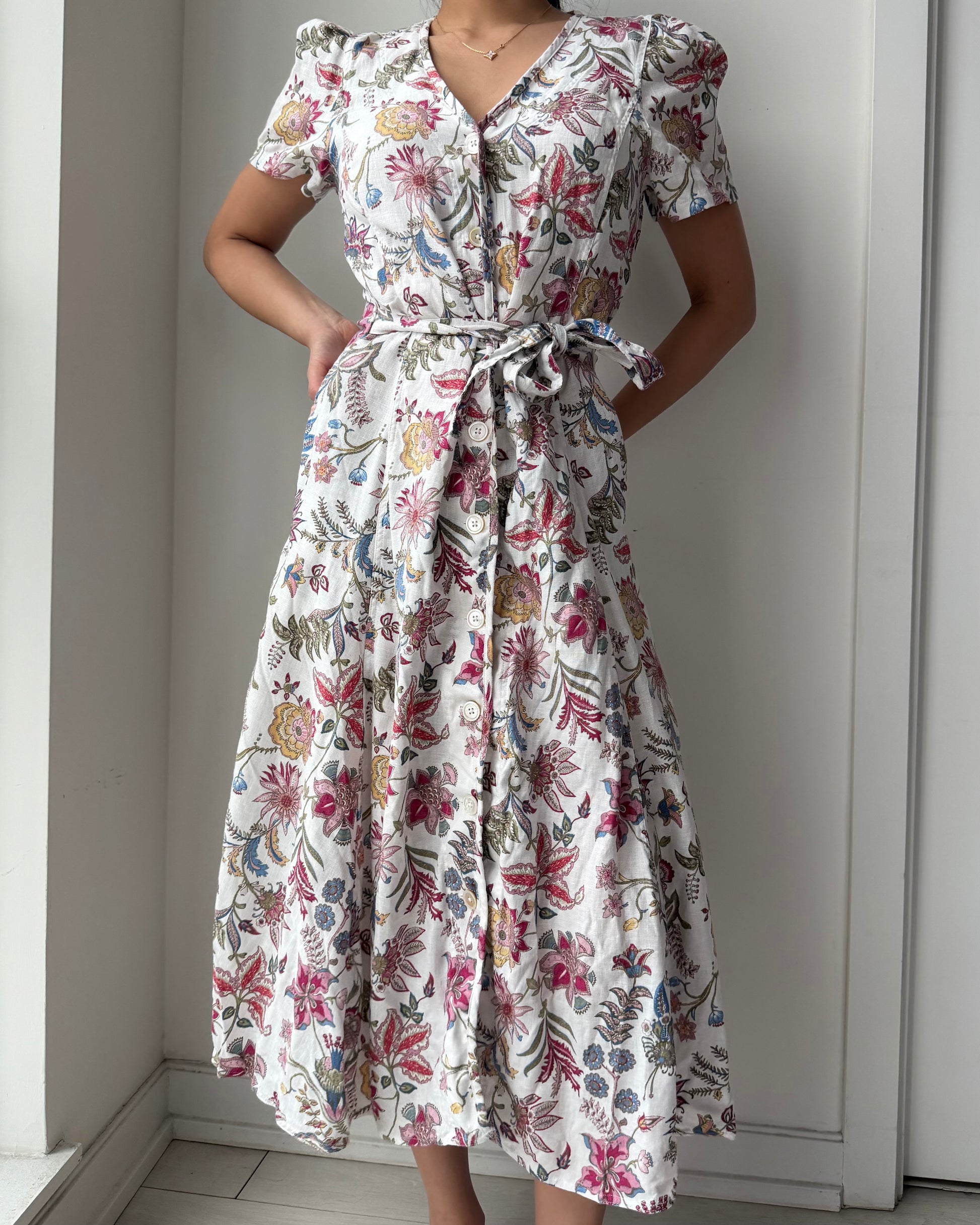 - Details: White linen mid-length dress with vibrant multi-hued floral print; puffed short sleeves and button-front closure; adjustable self-tie belt at waist for defined silhouette; A-line skirt; side pockets