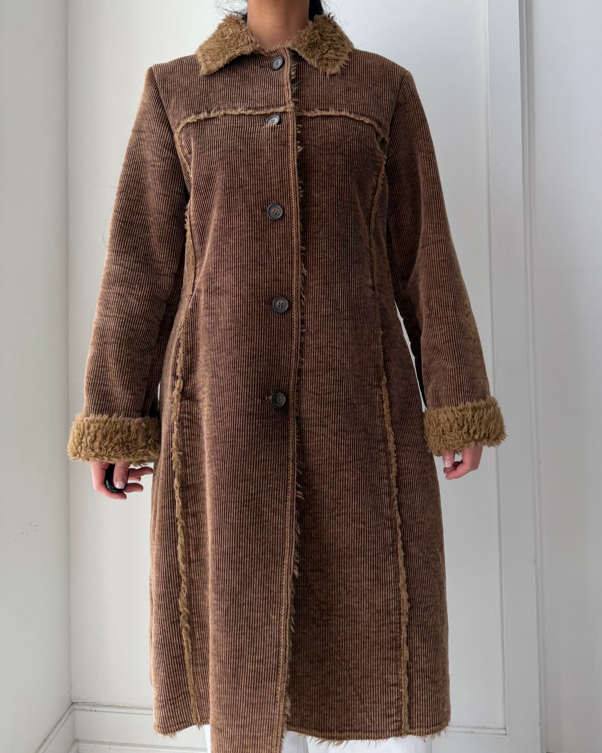 - Details: Wale corduroy long coat with tonal faux shearling shawl collar, cuffs, and placket trim; four-button single-breasted front with straight silhouette and seam pockets