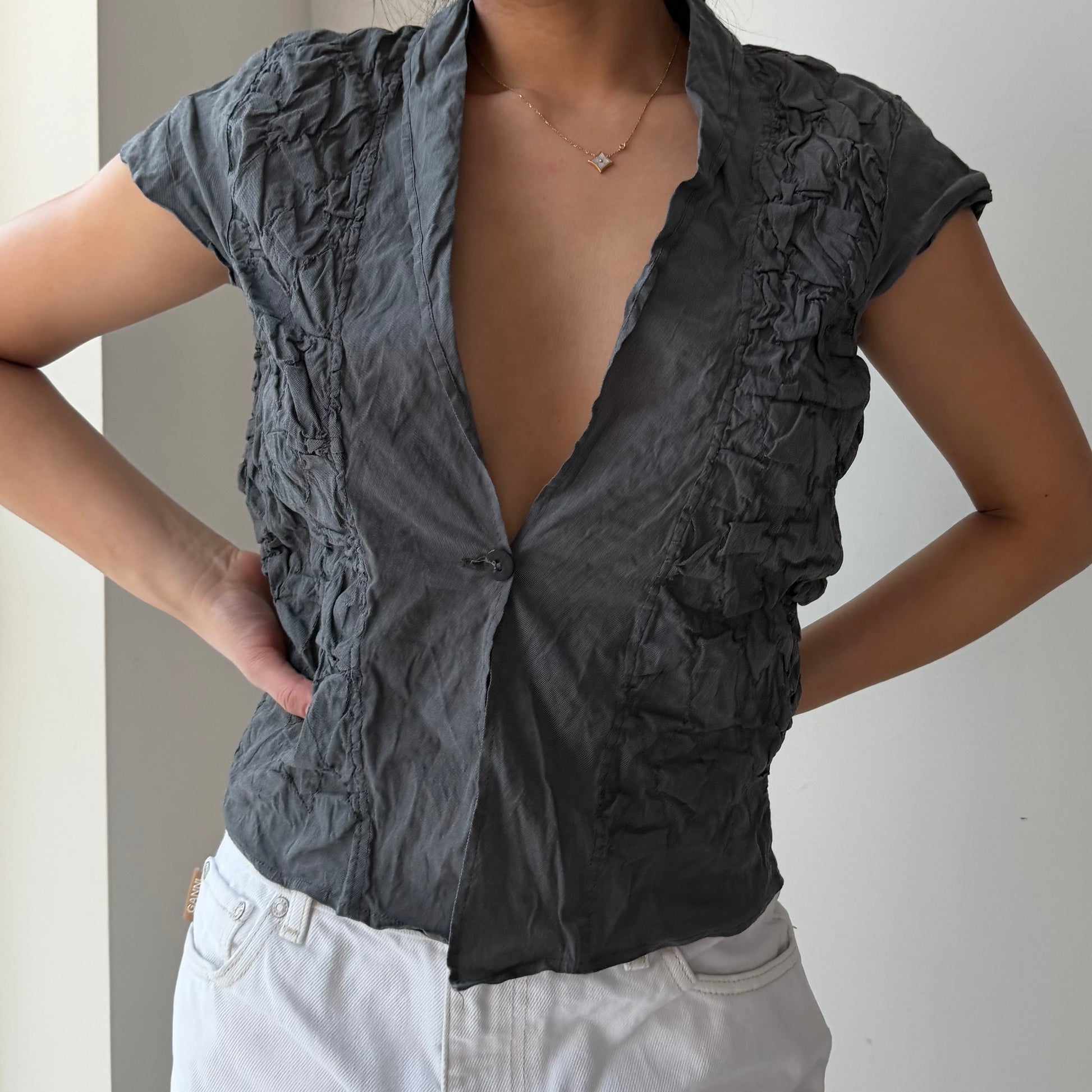 - Details: Lightweight woven blouse in washed charcoal grey with allover crinkled texture; plunging deep V-neckline with single-button front closure; cap sleeves