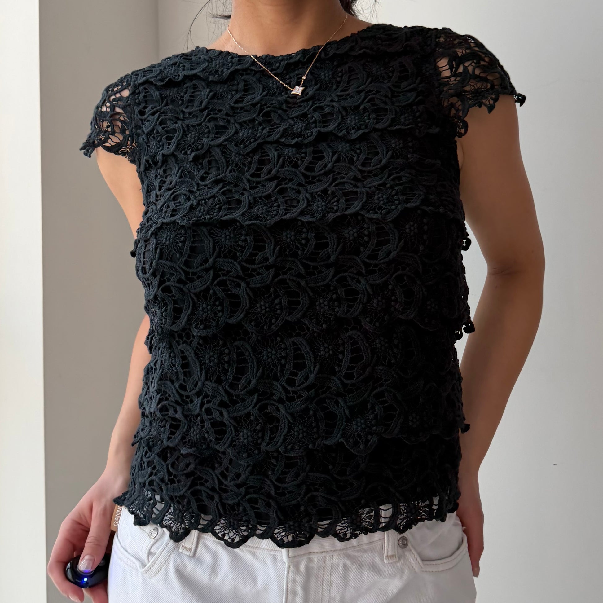 See by Chloé Black Guipure Lace Cap-Sleeve Top - X-Small