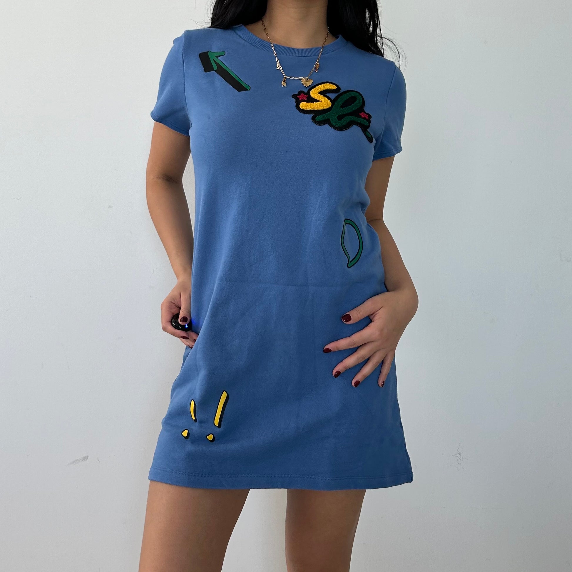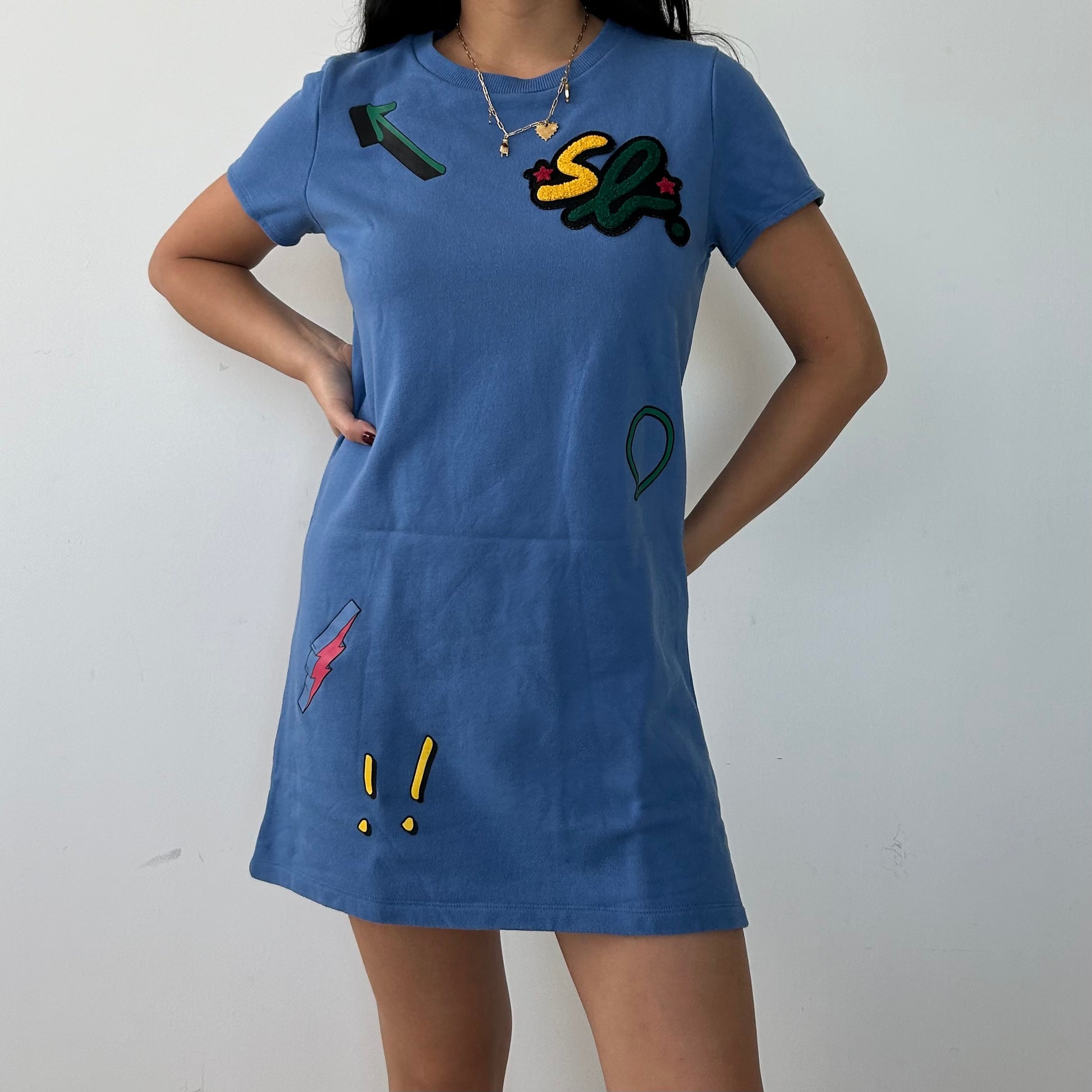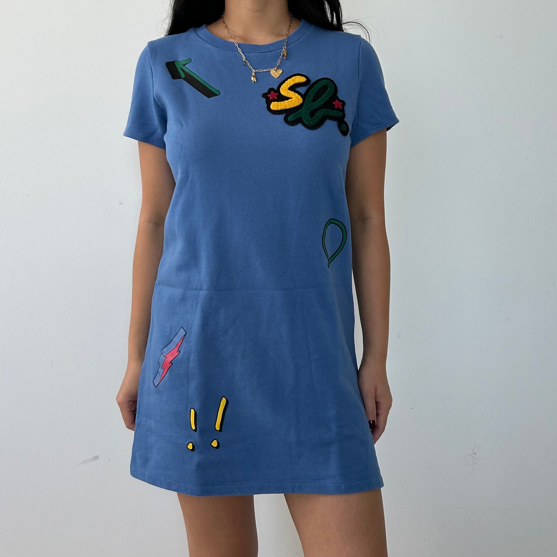 - Details: Blue short sleeve t-shirt dress; embroidered fleece patches