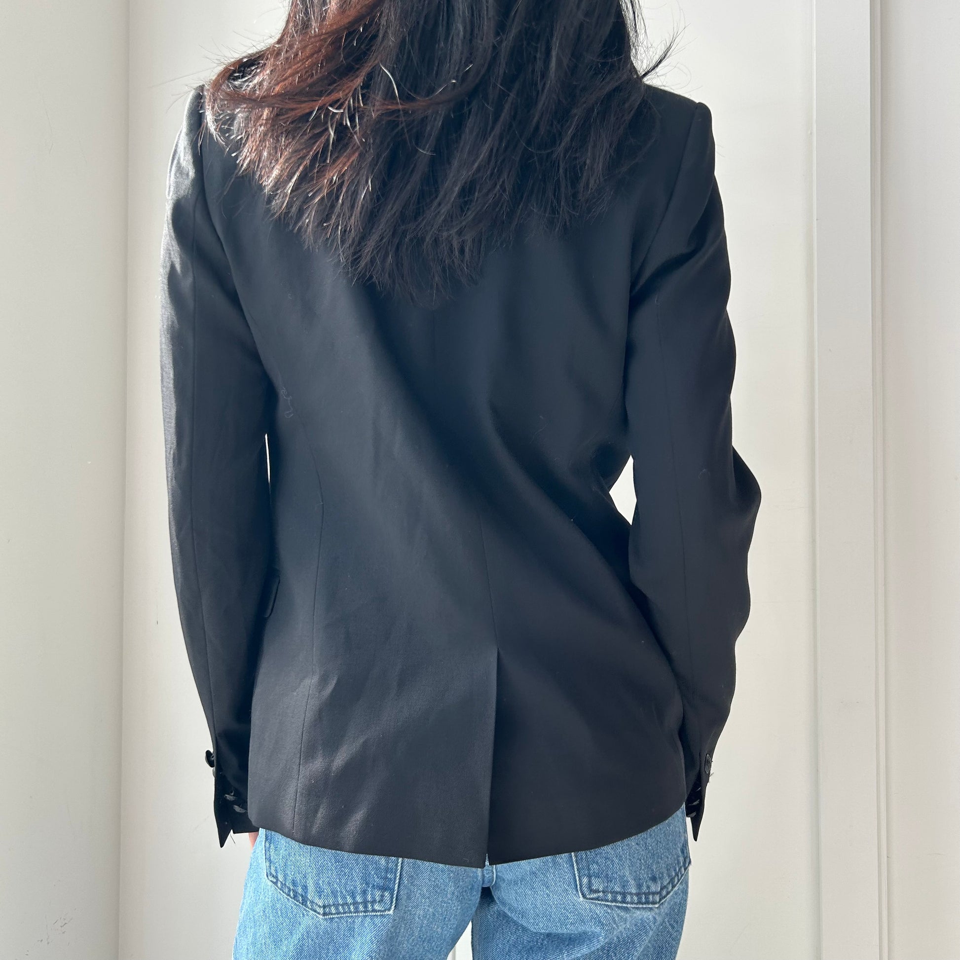 - Details: Tailored suiting in matte black; single-breasted silhouette with single-button closure; chainmail shawl lapels with metallic sheen; long sleeves and structured shoulders; front flap pockets and welt chest pocket