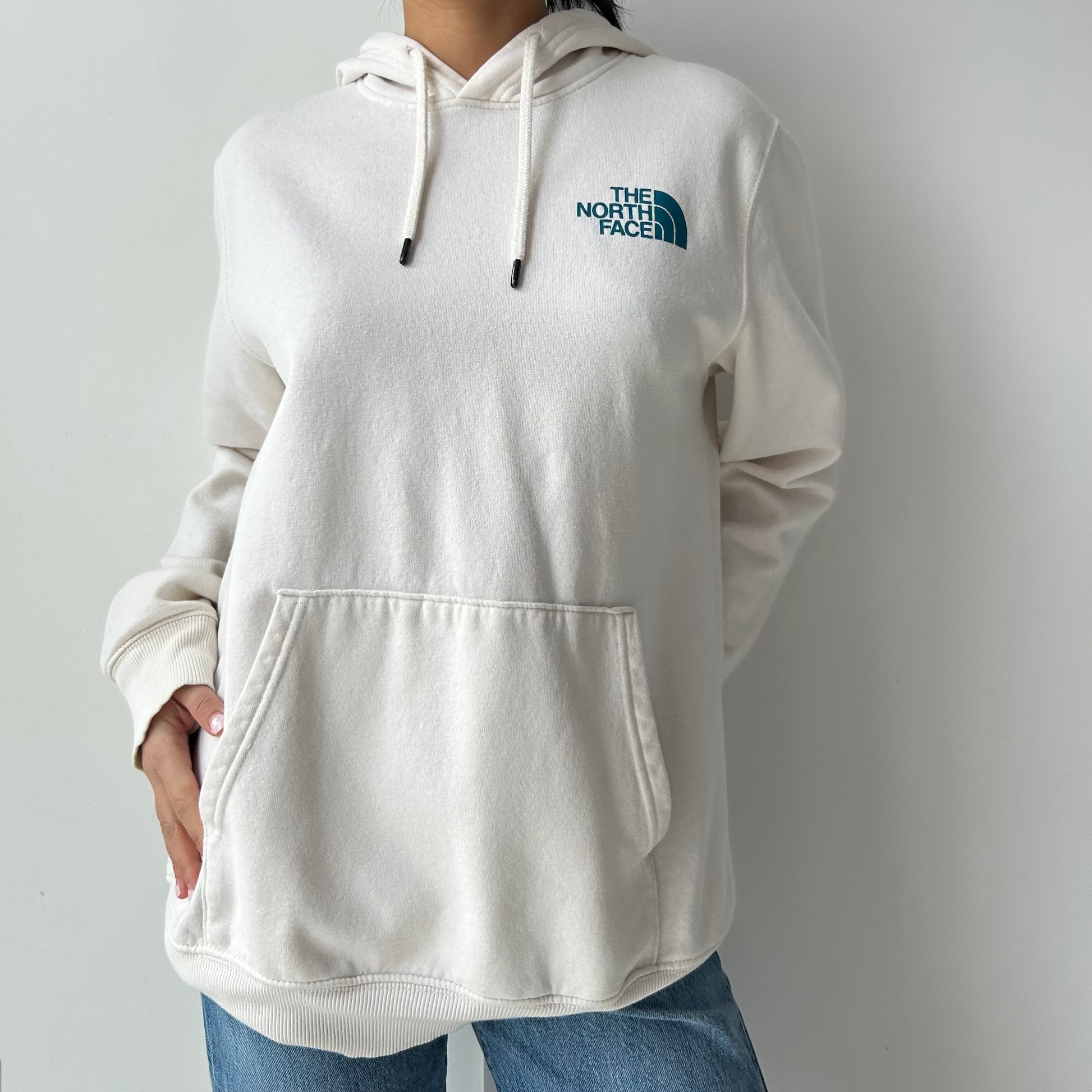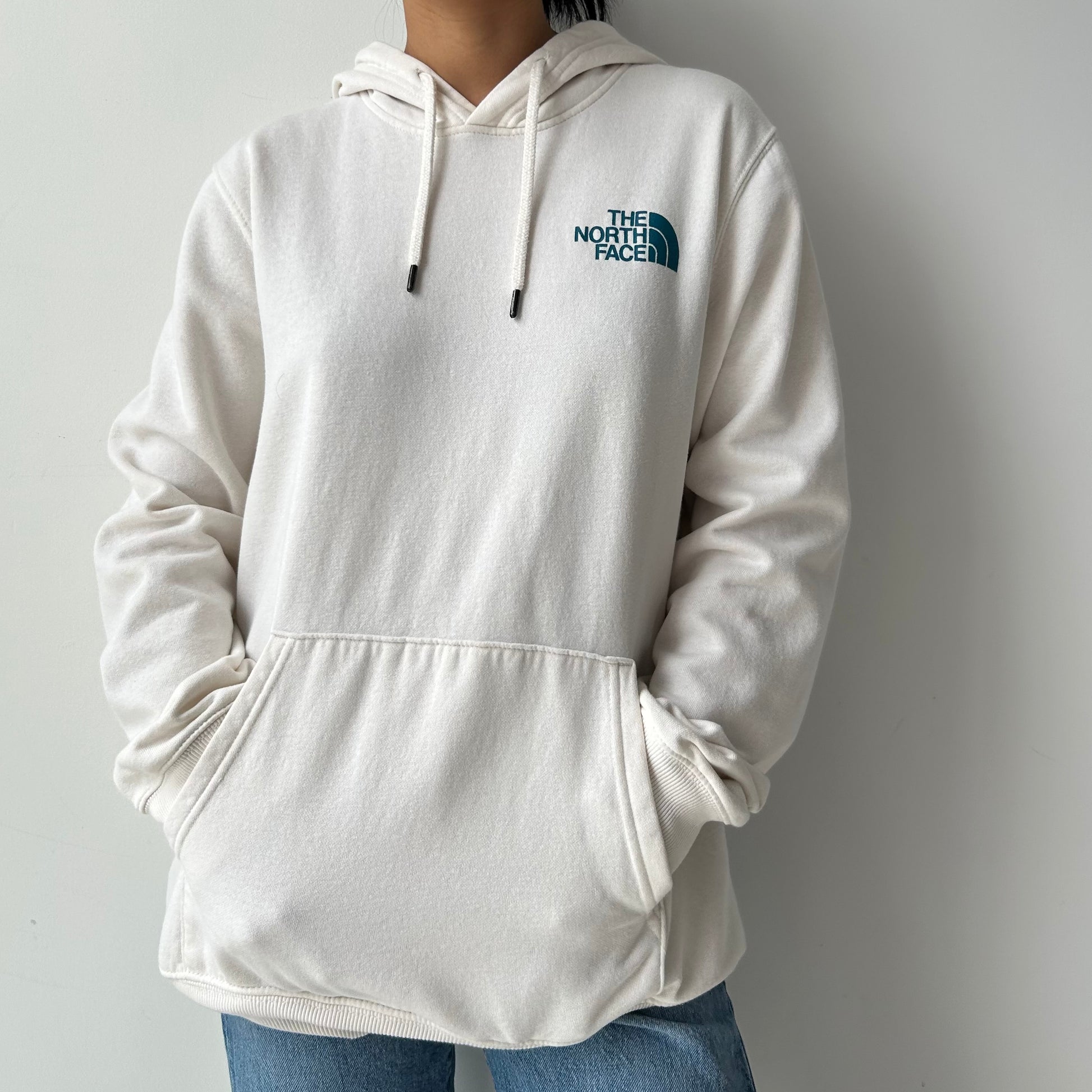 - Details: White long sleeve jumper with kangaroo pocket and drawstring hood; teal logo at chest; bold mountain graphic in teal, pink, and red on back; “NEVER STOP EXPLORING” slogan beneath