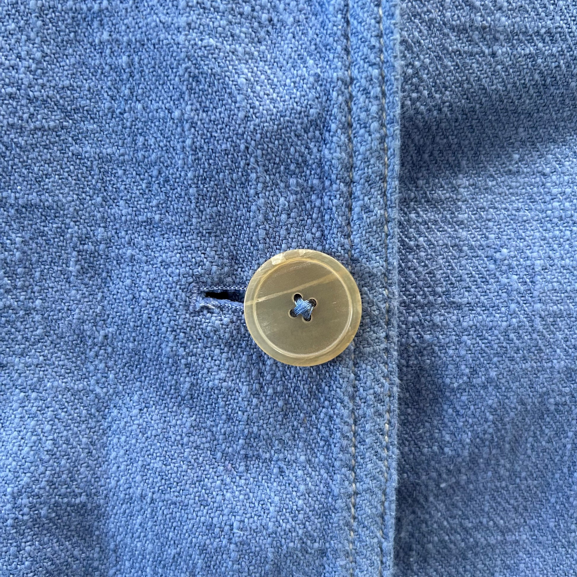 - Details: Vintage from the 1990s; blue linen blazer; white contrast stitching; flap pockets; chest pocket; single breasted three-button design