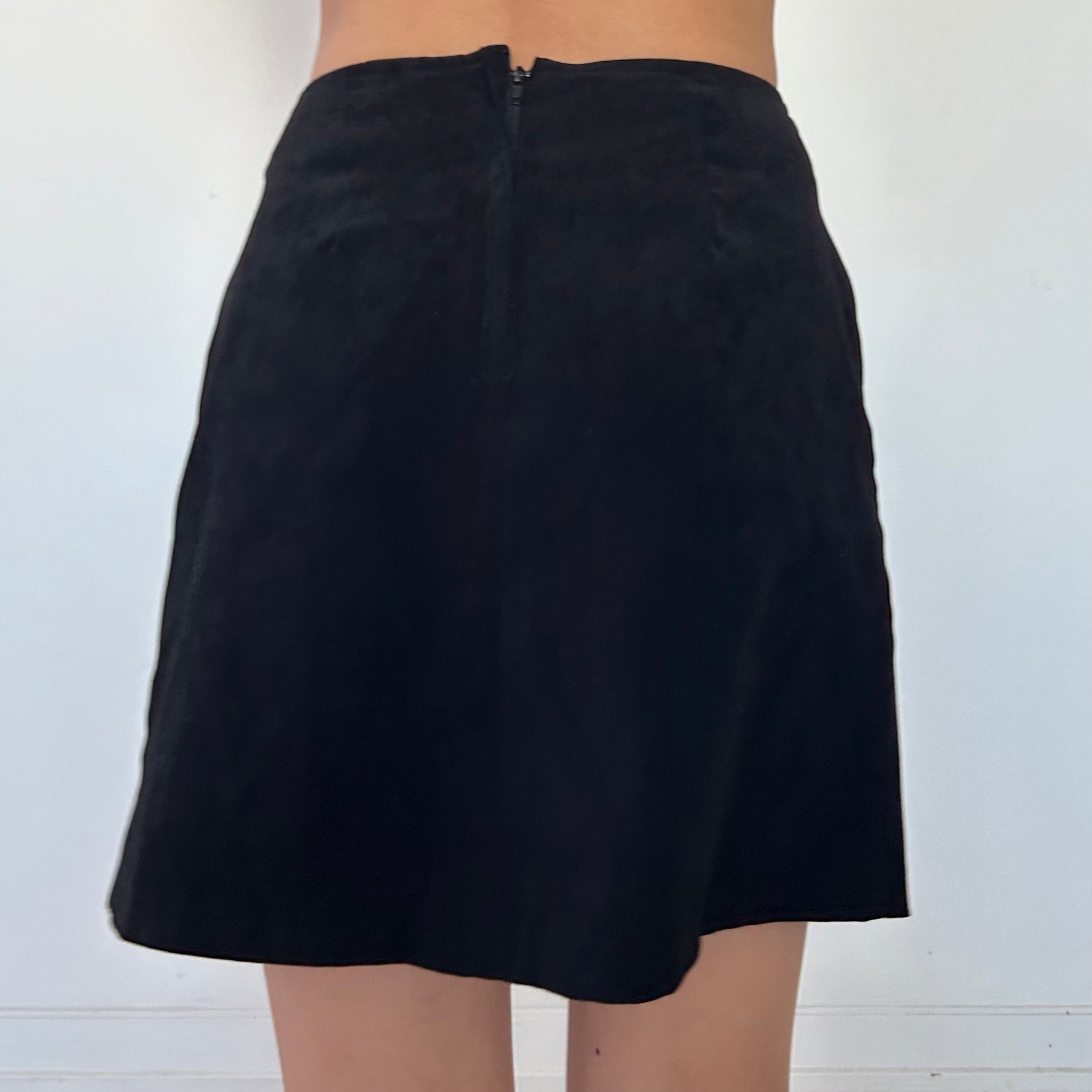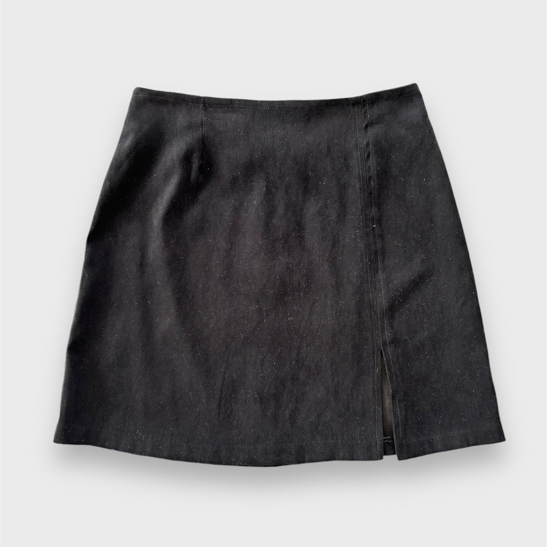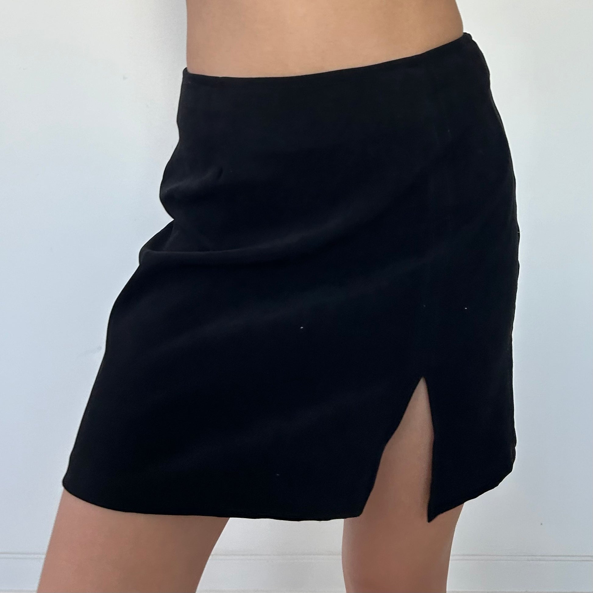 - Details: Black mini skirt; small slit on the side; concealed back zip